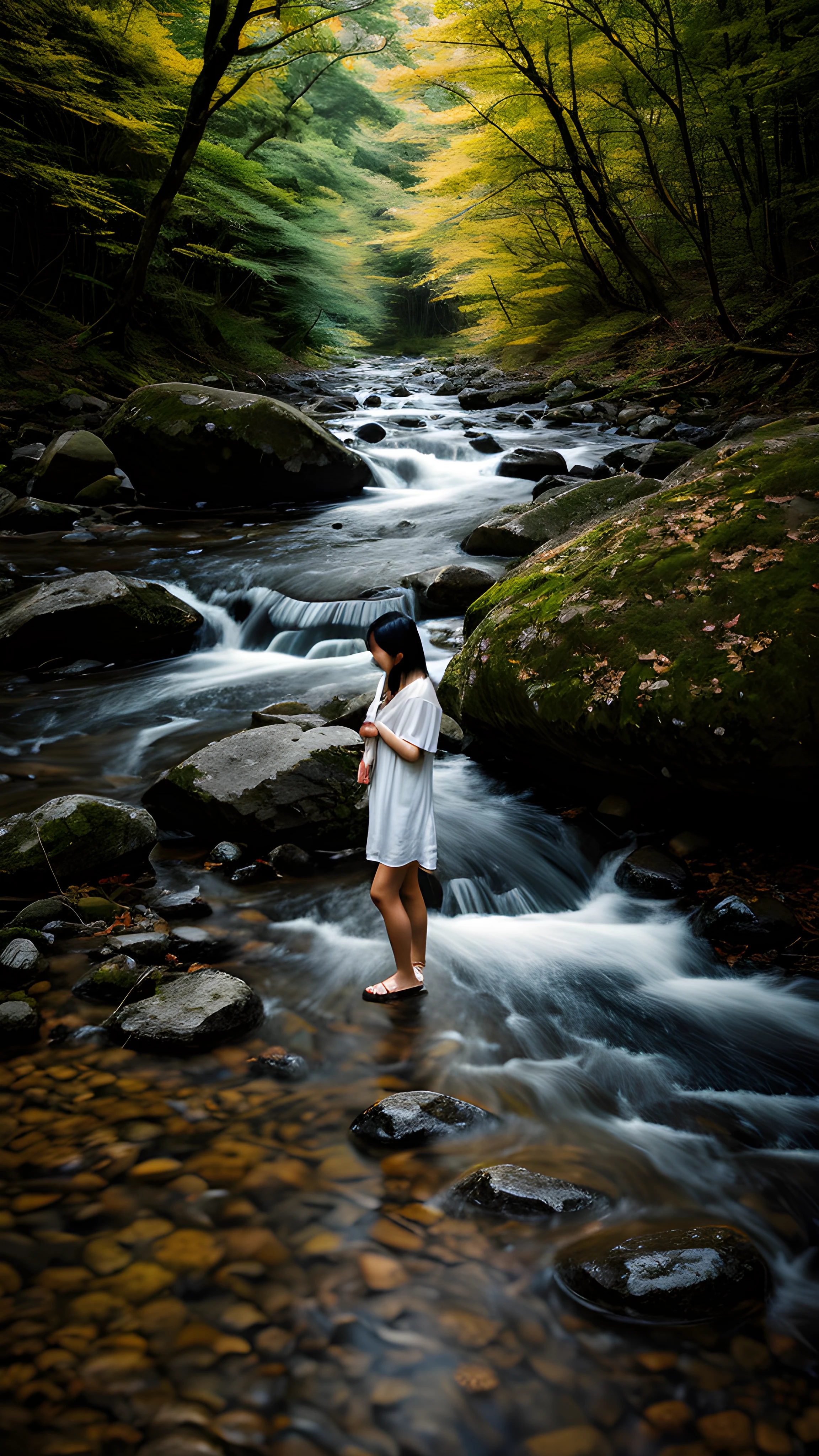 A DSLR real photography Ethereal Beauty along a Dramatic River Bank, Along the banks of a churning river lay a portrait of intrigue and natural color, every inch reflective of Moriyama's captivating style, river, portrait, Daido Moriyama, dramatic, ethereal, beauty, nature, highly detailed, 8k, hdr