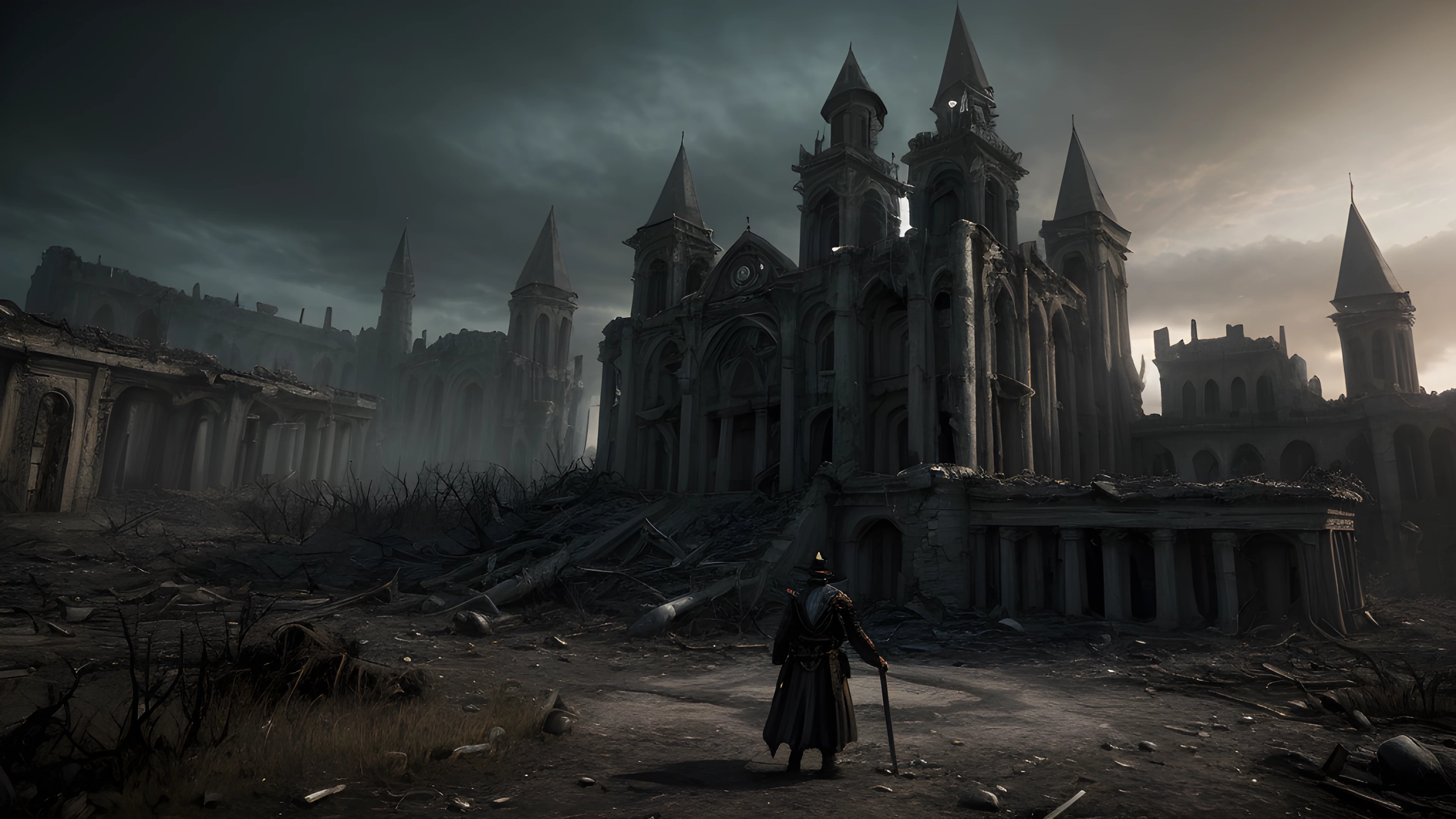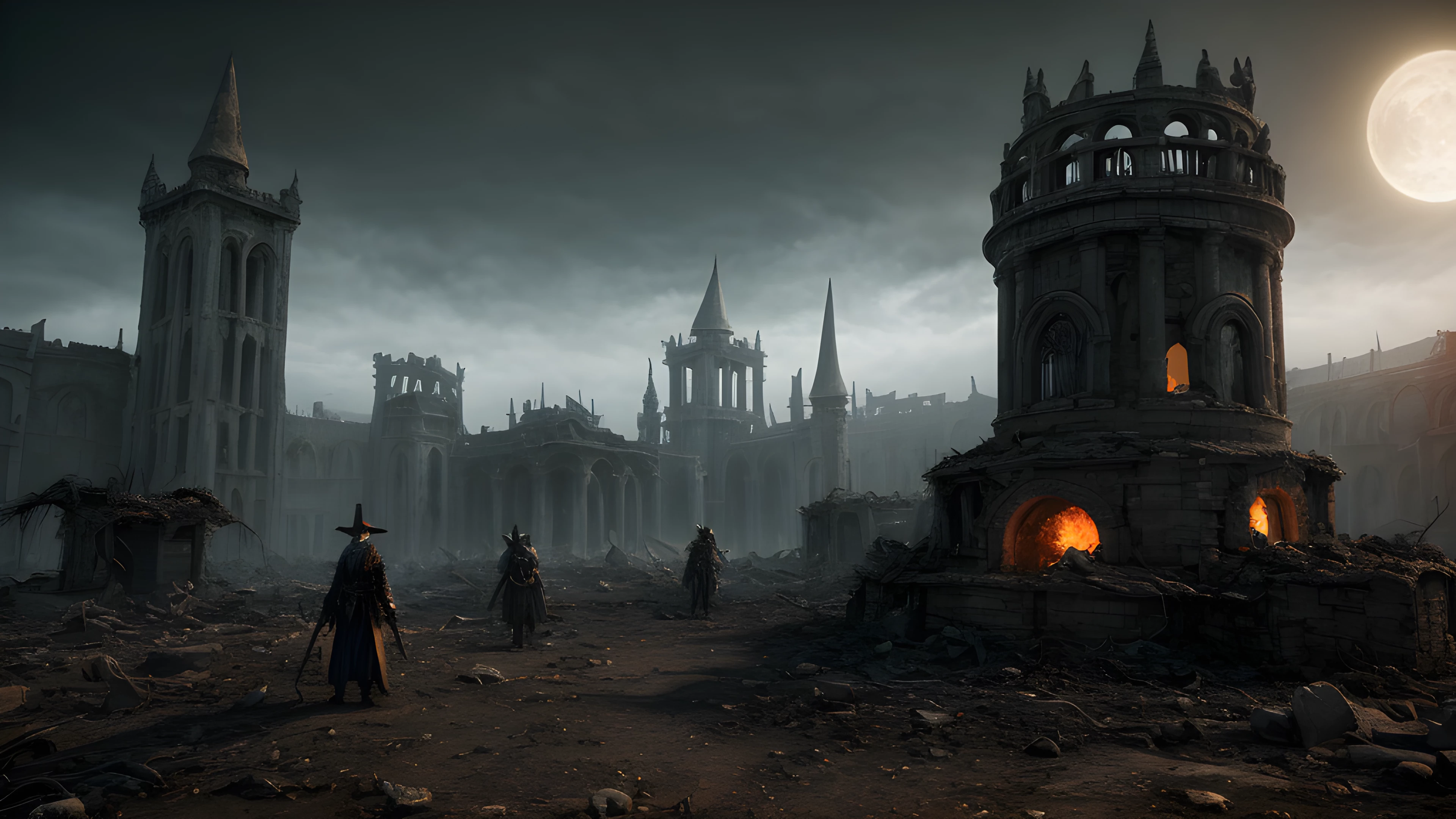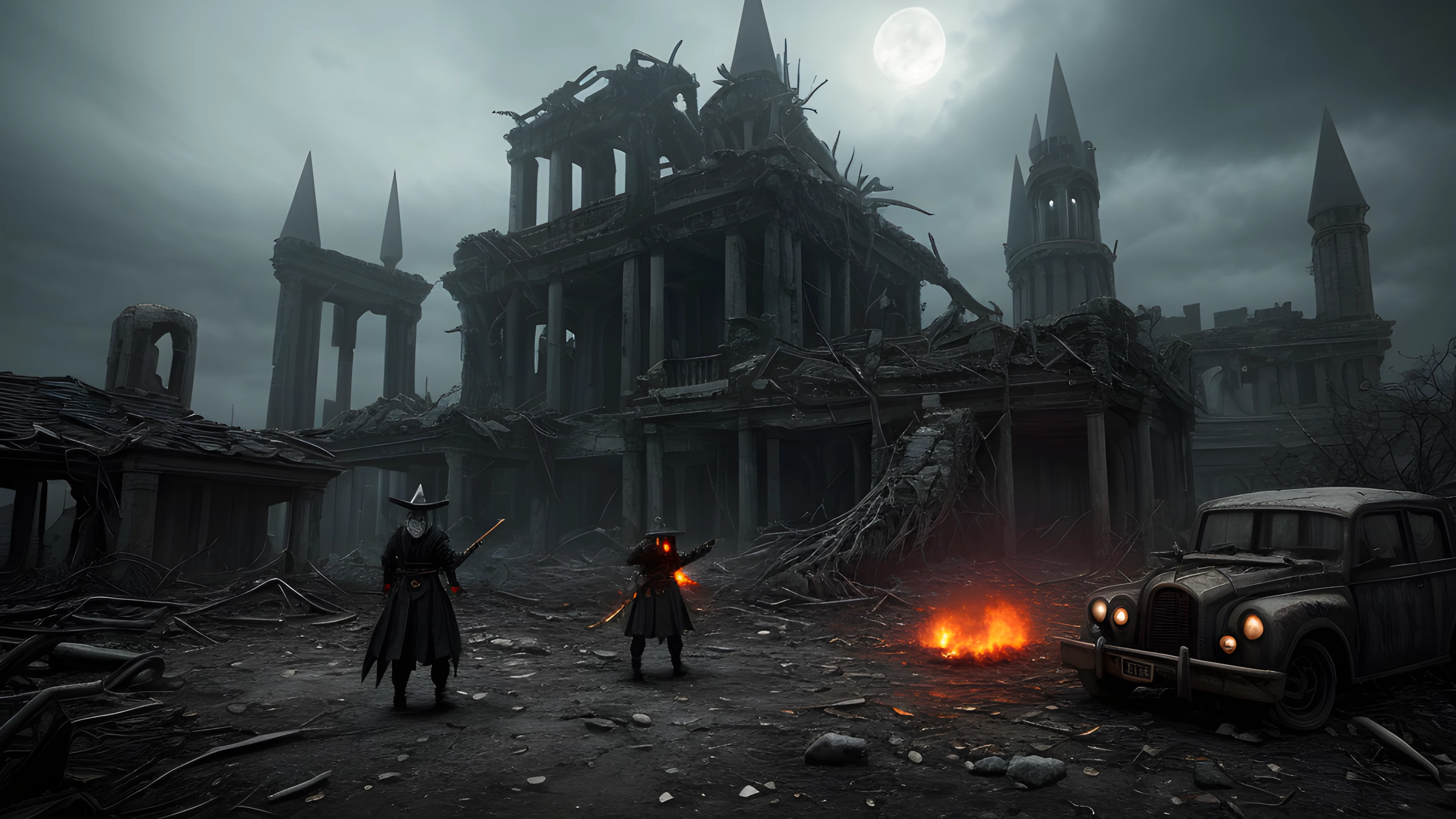 Apocalyptic Witchcraft unveiling sorcery meets in withering ruins, In a barren world reeking with the smell of decay, lurking creatures emerge from the shadows Sorcerers wielding ancient spells clash in duels, their powers unleashing unfathomable destruction upon the ruined city, fantasy, apocalypse, magic, witches, dark, horror, ruins, sorcery, bewitched, unearthly, elaborated detailed 8k, detailed, 4k 8k 16k gigapixel render, highly detailed, 8k, cinematic HDR SSAO RTX