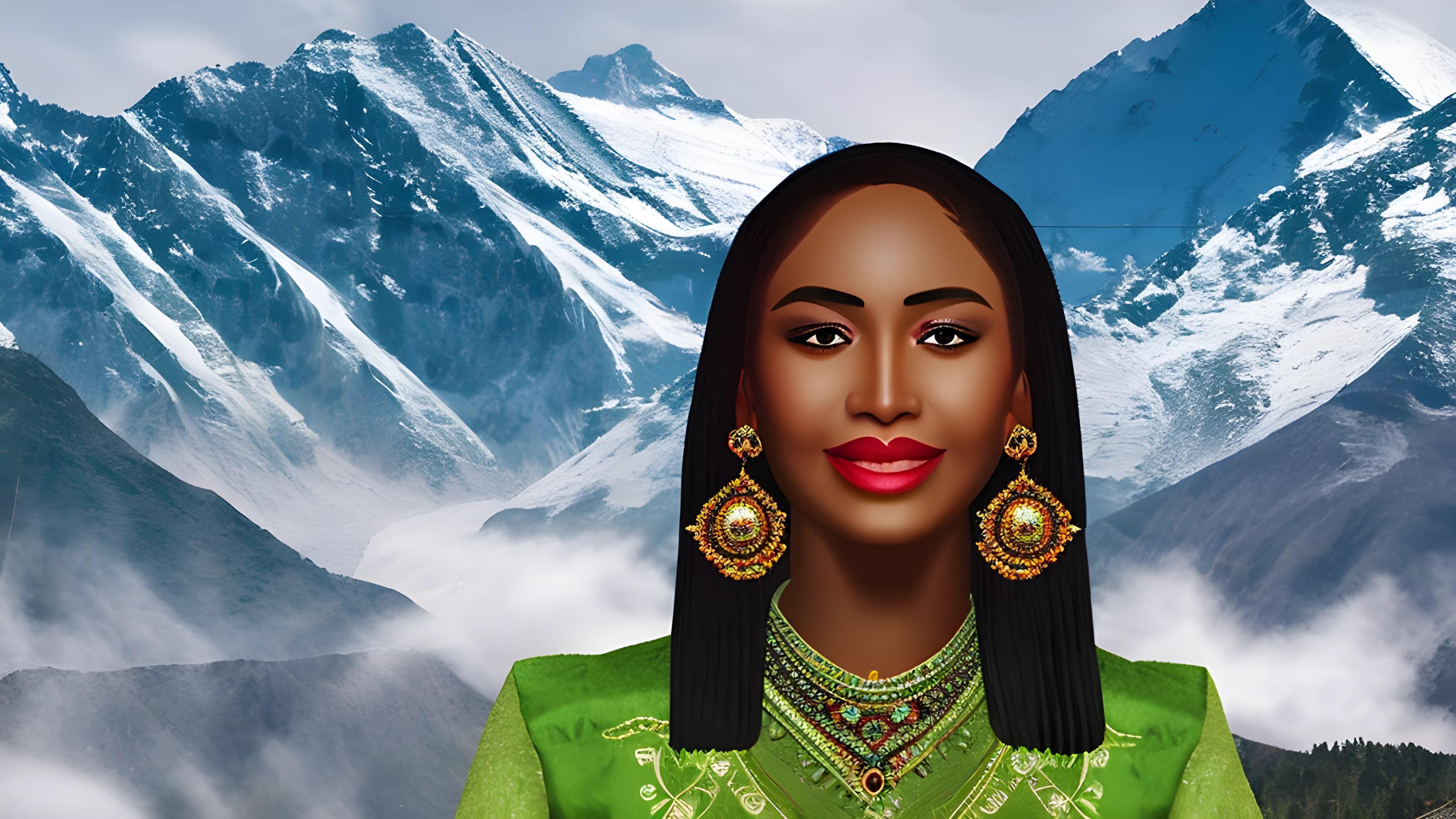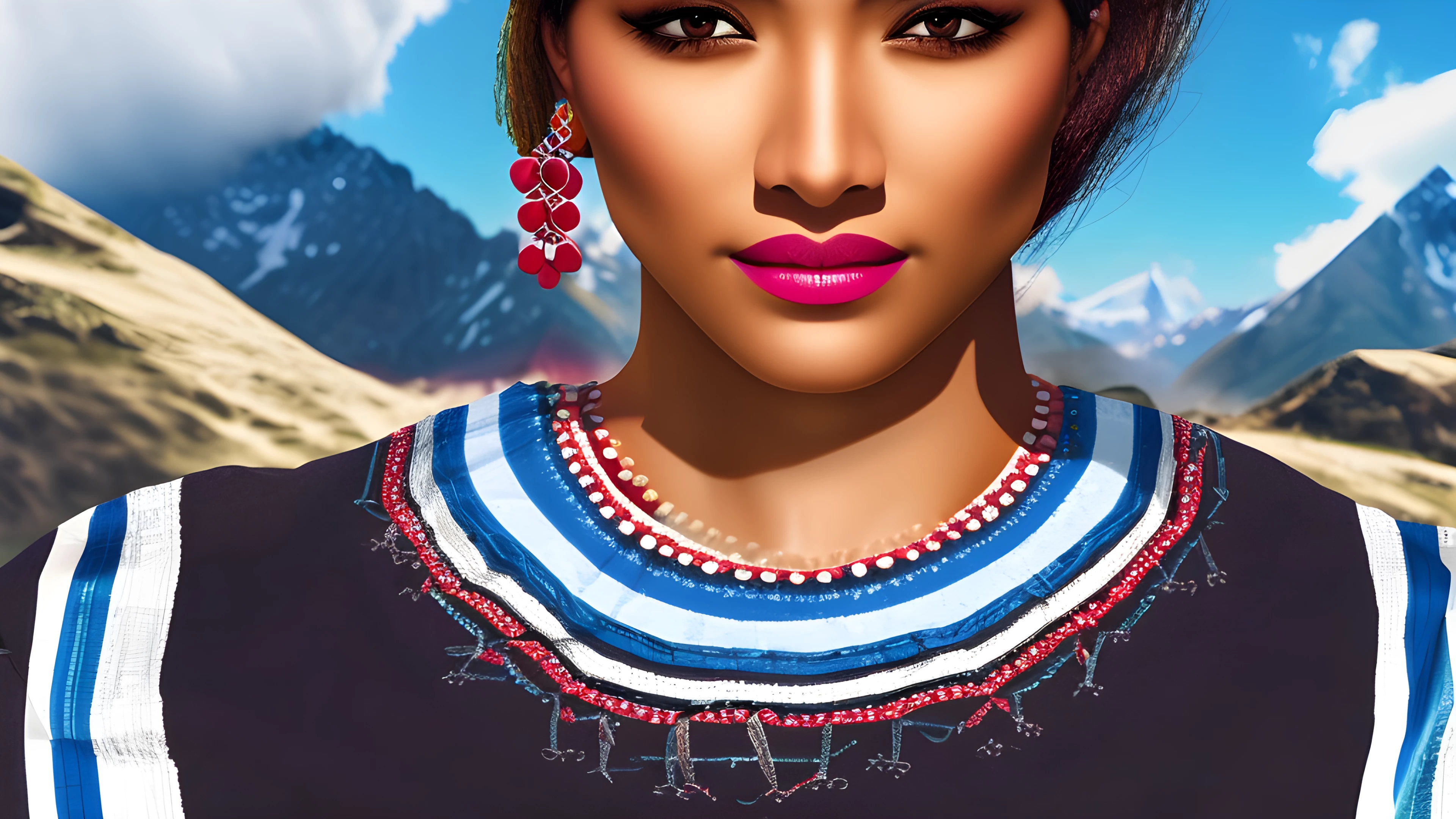 A 2d digital portrait design of Peak Culture A Portrait of Multicultural Beauty, Venture into the breathtaking scene of a mountain peak, surrounded by a melting pot of diverse cultures The natural beauty of the landscape perfectly reflects the liveliness and unity of the people within it, digital, graphic design, art, portrait, landscape, multiethnic, cultural, diversity, beauty, (render 2d:1.5), digital art, digital render, digital rendering, (detailed face:1.5), (detailed clothes:1.4), (extremely detailed eyes and face), foreground, detailed face, perfect mouth, highly detailed, sharp focus, stunningly beautiful, high quality, high detailed skin, (full body:1.5), (only one person:1.1), (close up camera:1.5), fantasy character, hd, 4k, concept art, full body shot, (character centered in the image:1.4)