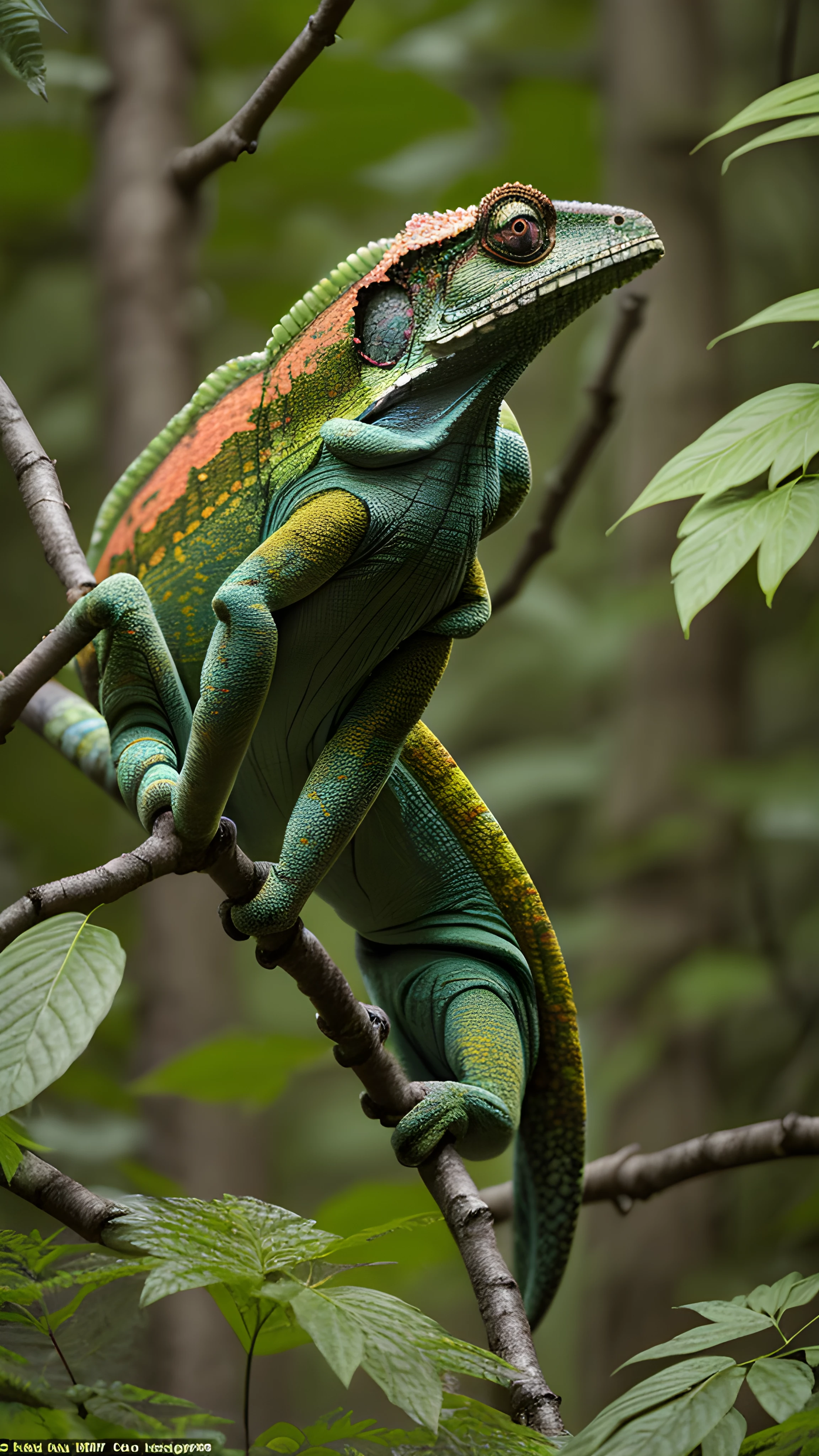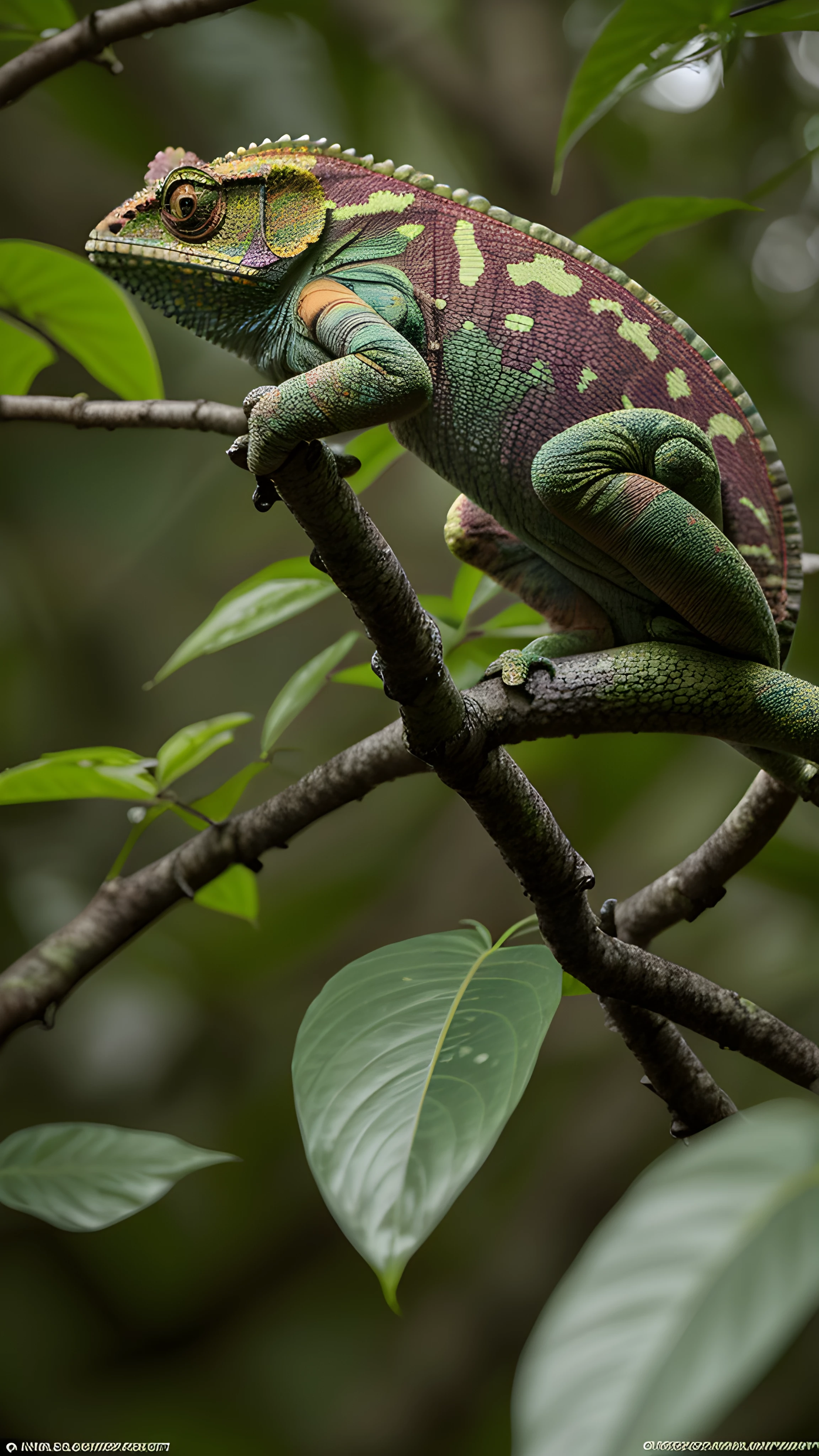 Nature's Palette Camouflage and Stealth, In the heart of the forest, our protagonist, a majestic chameleon, effortlessly blends in with its surroundings as it gracefully moves through the leaves With its complementary colors, it becomes one with nature as it patiently hunts for its next meal, wildlife, photography, forest, camouflage, stealth, Lanting Frans, chameleon, complementary colors, nature's palette, majestic, wildlife photography, animal, highly detailed, 8k, hdr, national geographic, nature