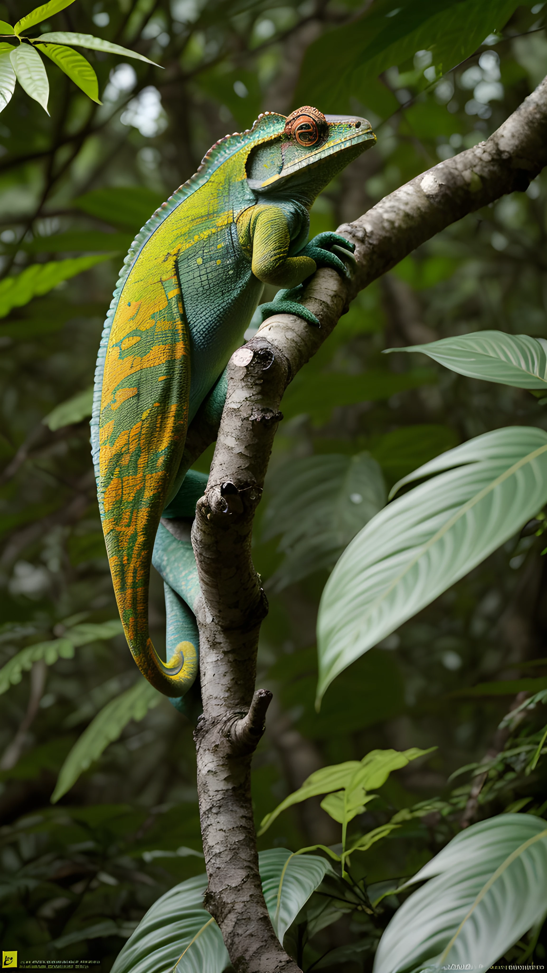 In the heart of the forest, our protagonist, a majestic chameleon, effortlessly blends in with its surroundings as it gracefully moves through the leaves With its complementary colors, it becomes one with nature as it patiently hunts for its next meal