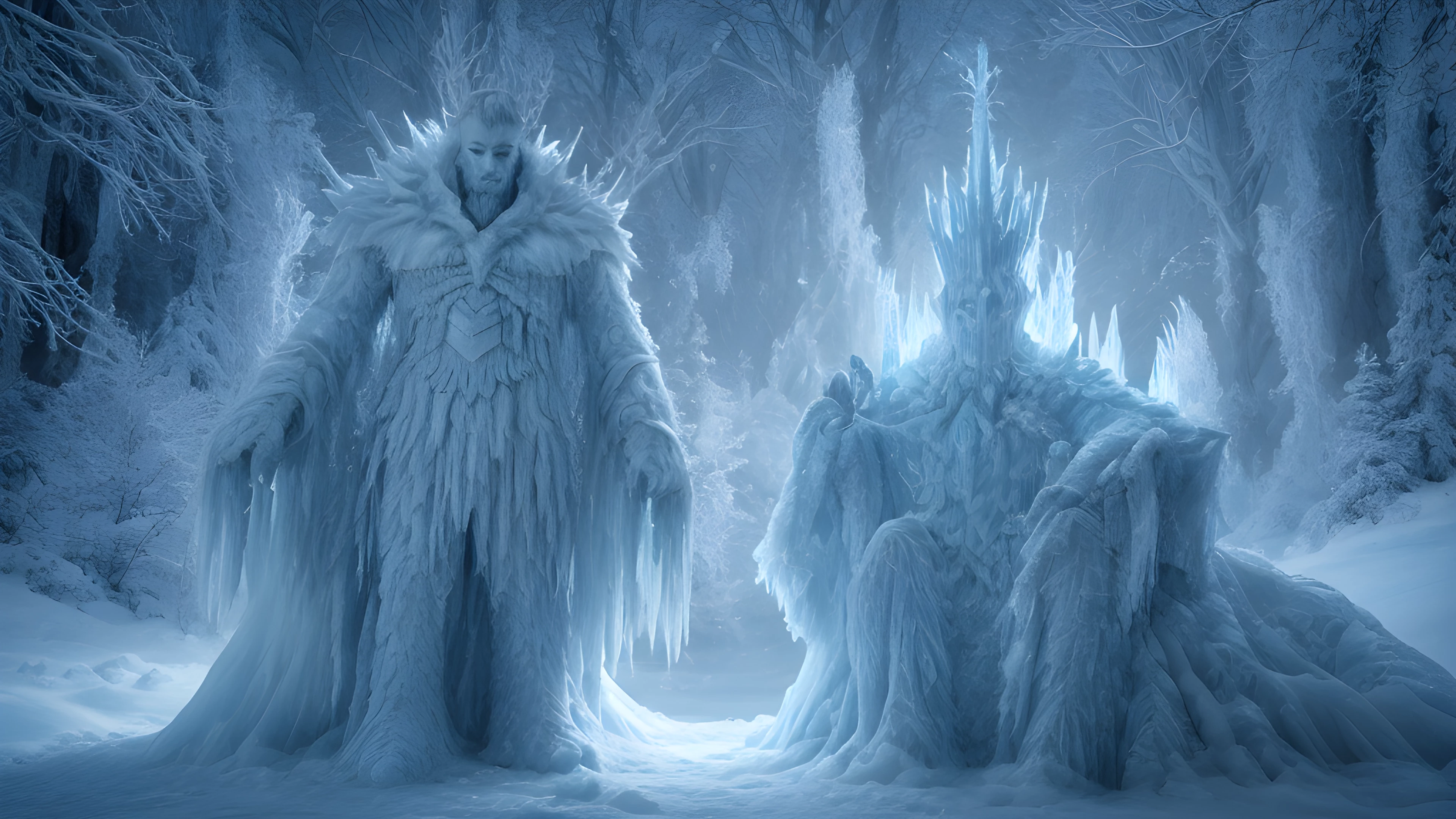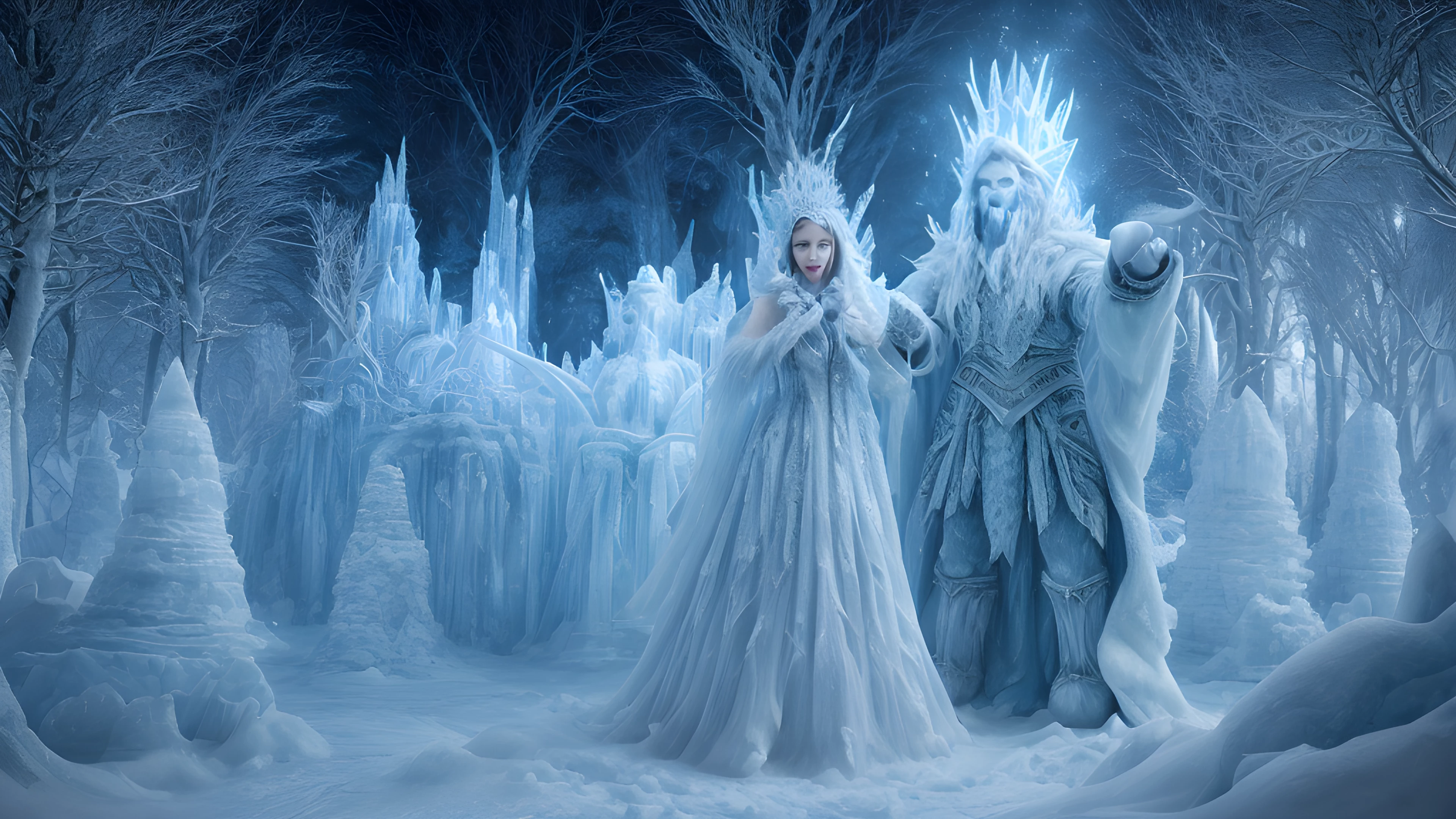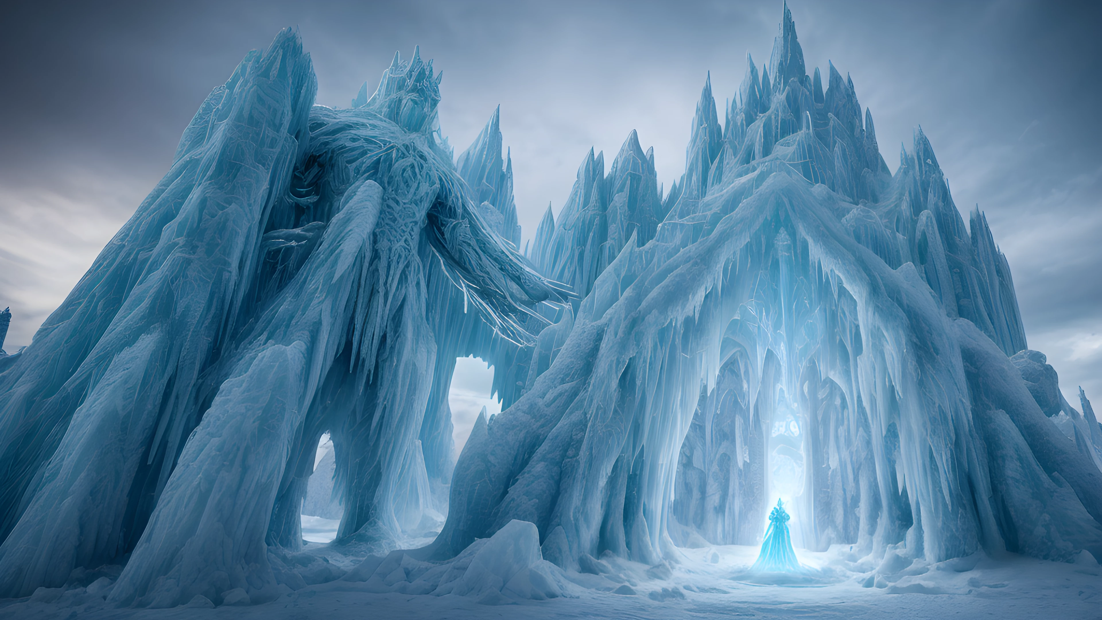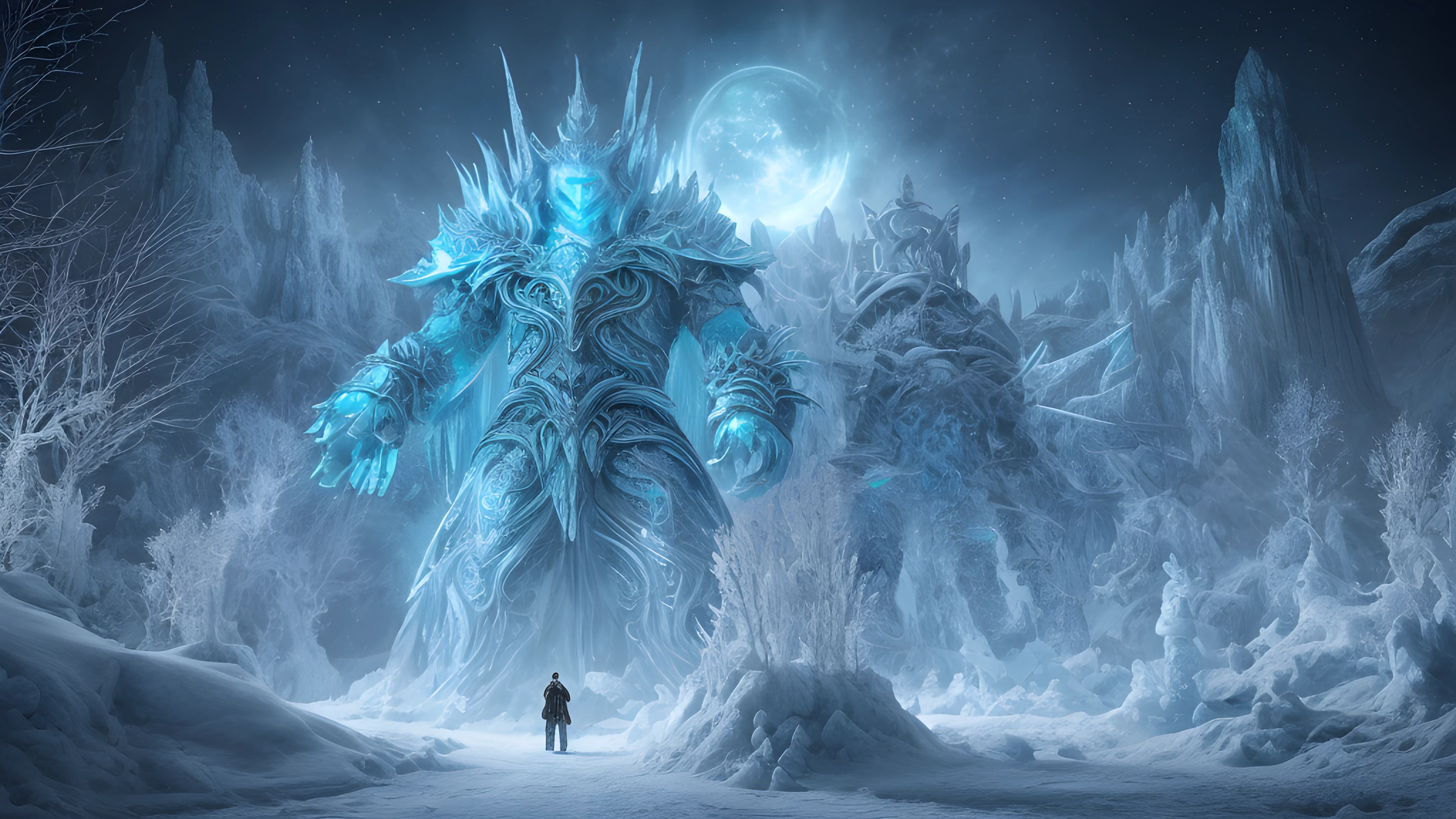 Fantasy Image of Frozen Realms Divine Secrets, Enter a mystical realm of ice and uncover otherworldly revelations among the towering snow sculptures and the majestic Snow King with his powerful ice golems A world of eternal mystery and wonder awaits, Ice, Realm, Mystical, Genarius, Inquisitive, Revelation, Magical, Unknown, sci-fi photo, hyperdetailed, high quality, 8k, HDR, UHD, realistic photo, perfect anatomy, ultra realistic, photography hyper realistic and hyper detailed, hyper emotional,