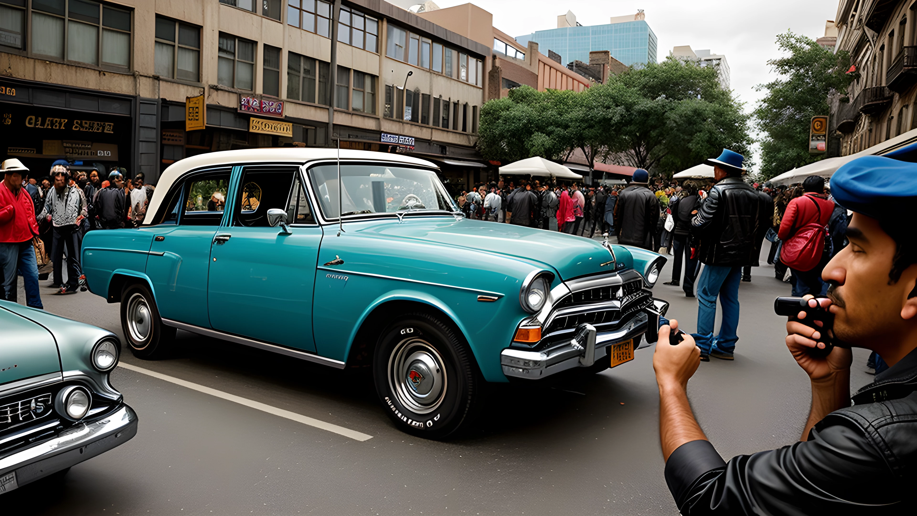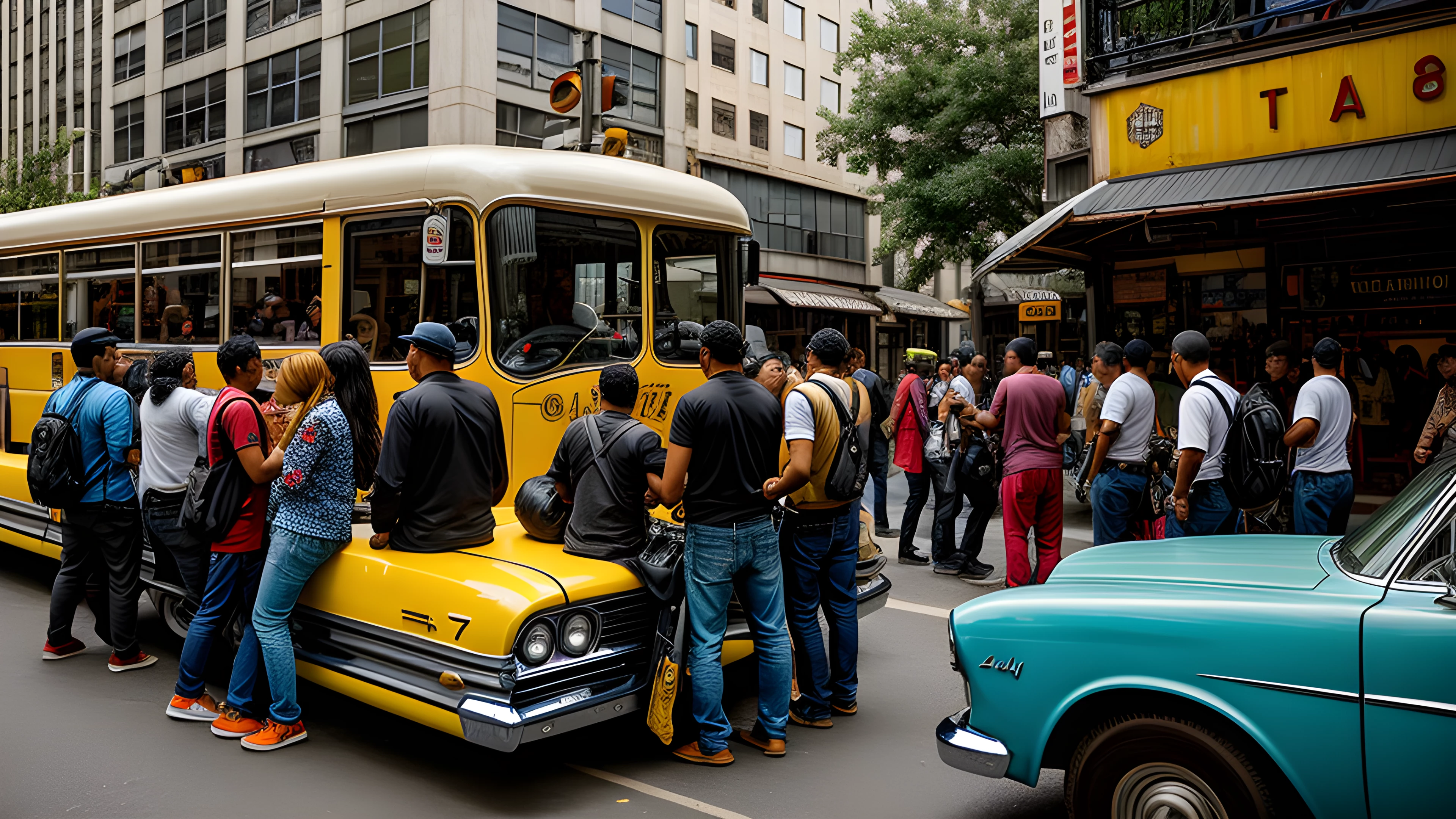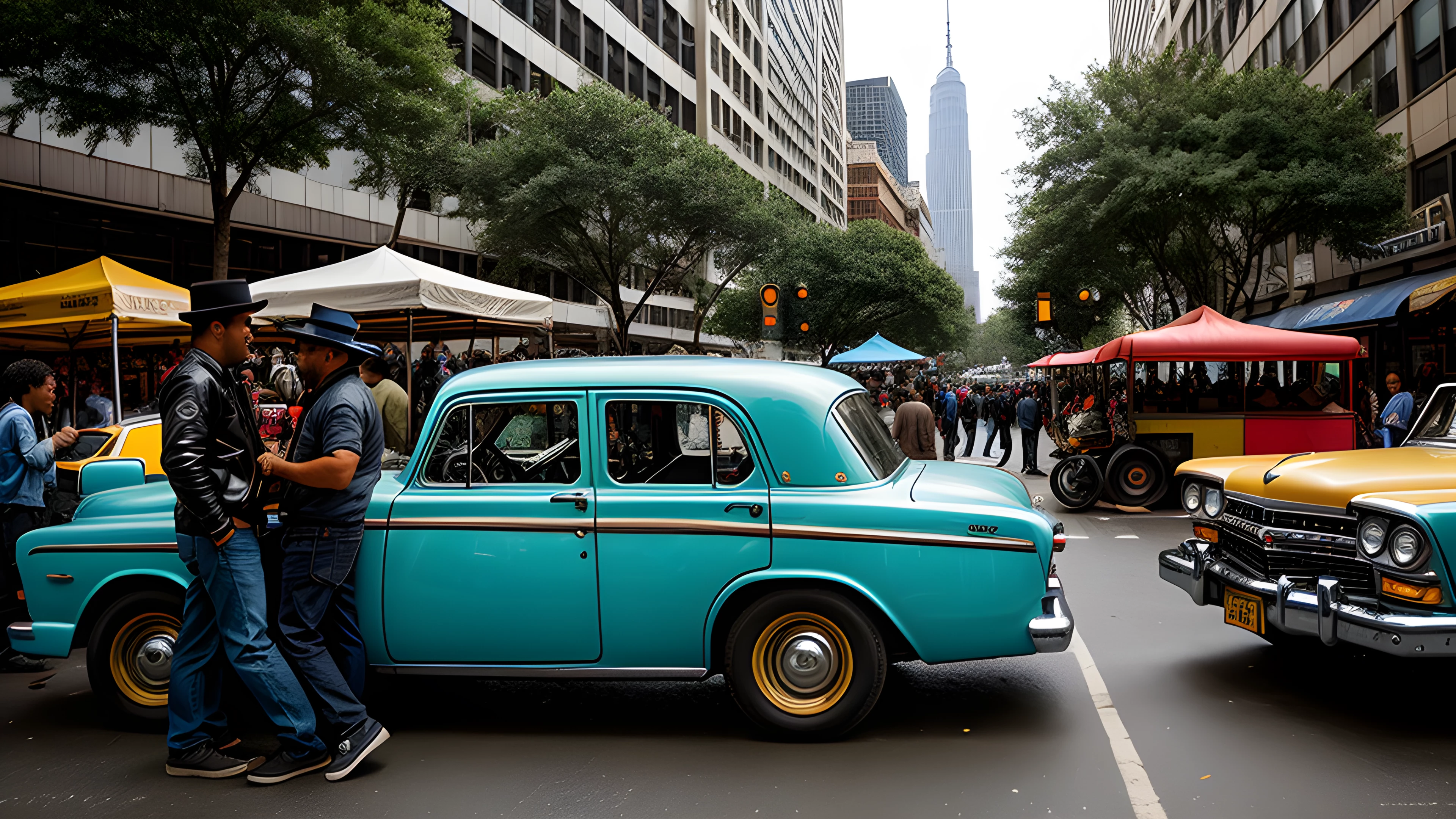 Amidst the hustle and bustle of city life, a group of seven unique characters arrive in a vintage vehicle parked on the roadside A motley crew with diverse backgrounds and stories come together in this aeon of fleeting moments, as I find beauty in the chaos of the streets