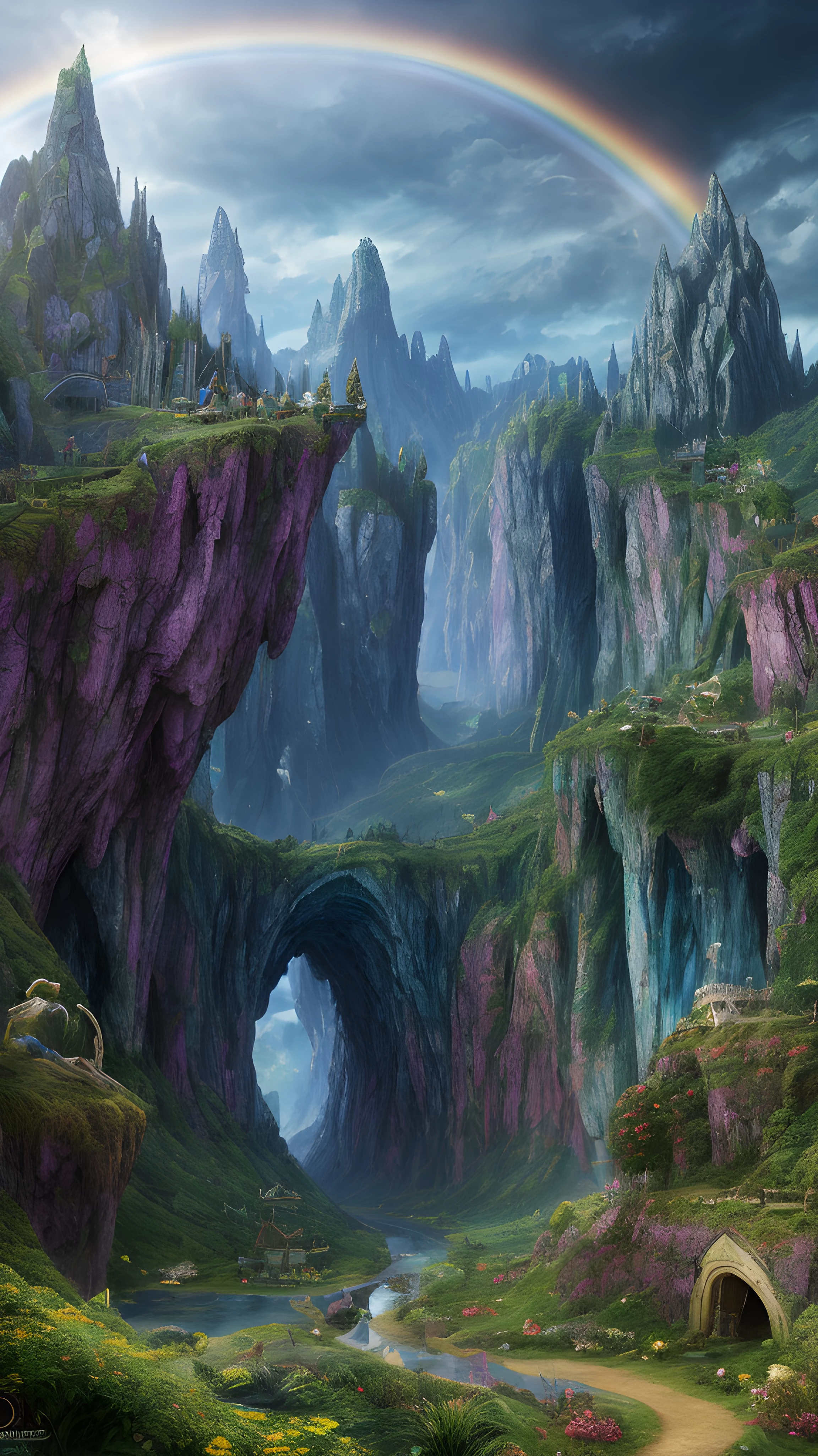 Fantasy Image of Mythical Realm Rainbow Valley of Mighty Wizards, Enter a mystical world where creatures proudly display vibrant colors amidst magical artifacts Witness the might of the powerful wizards looming over the rainbow valley, fantasy, art, mythical beings, 2D, 3D, dragons, angels, unicorns, forests, Terryl Whitlatch, sci-fi photo, hyperdetailed, high quality, 8k, HDR, UHD, realistic photo, perfect anatomy, ultra realistic, photography hyper realistic and hyper detailed, hyper emotional,