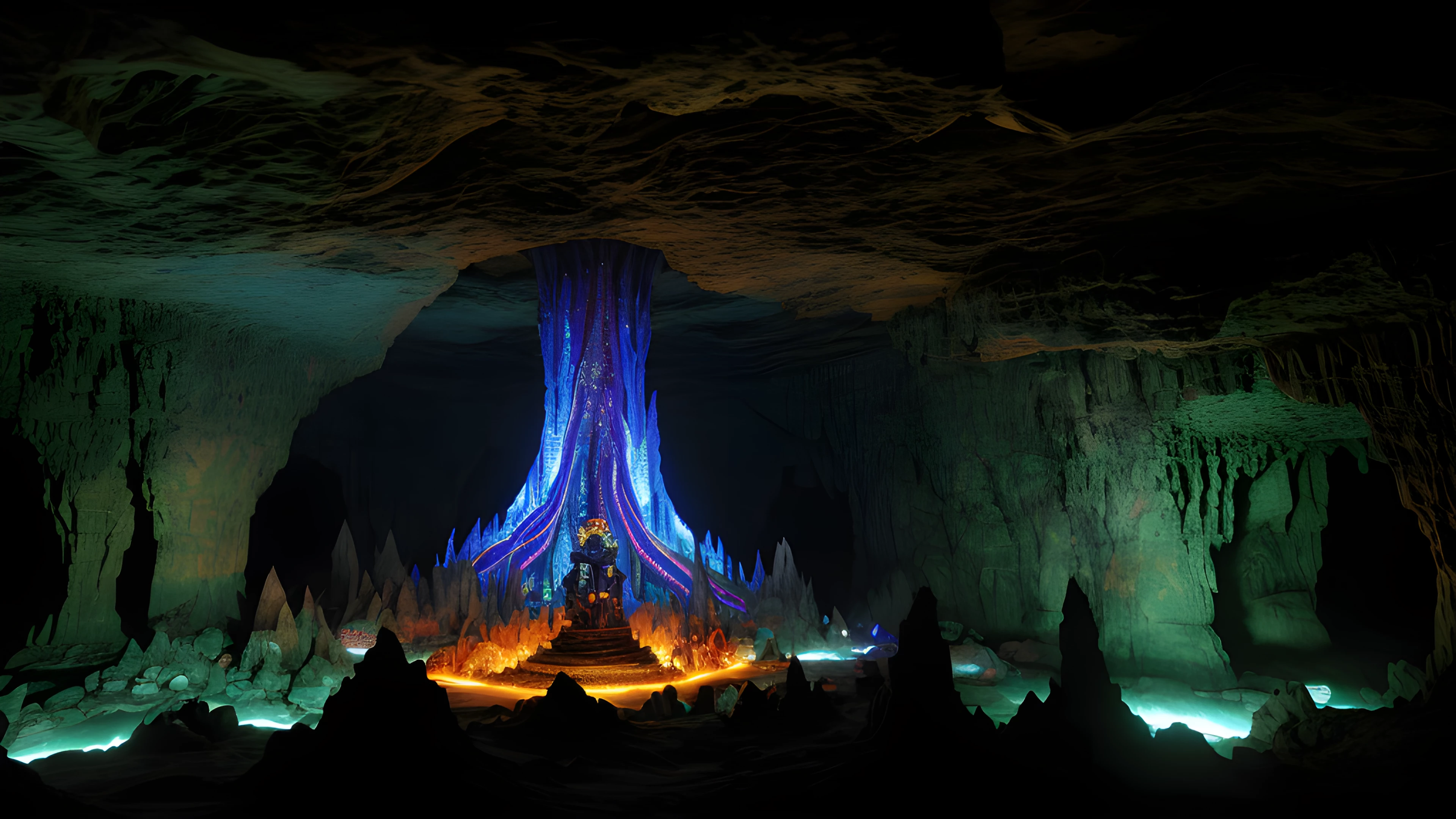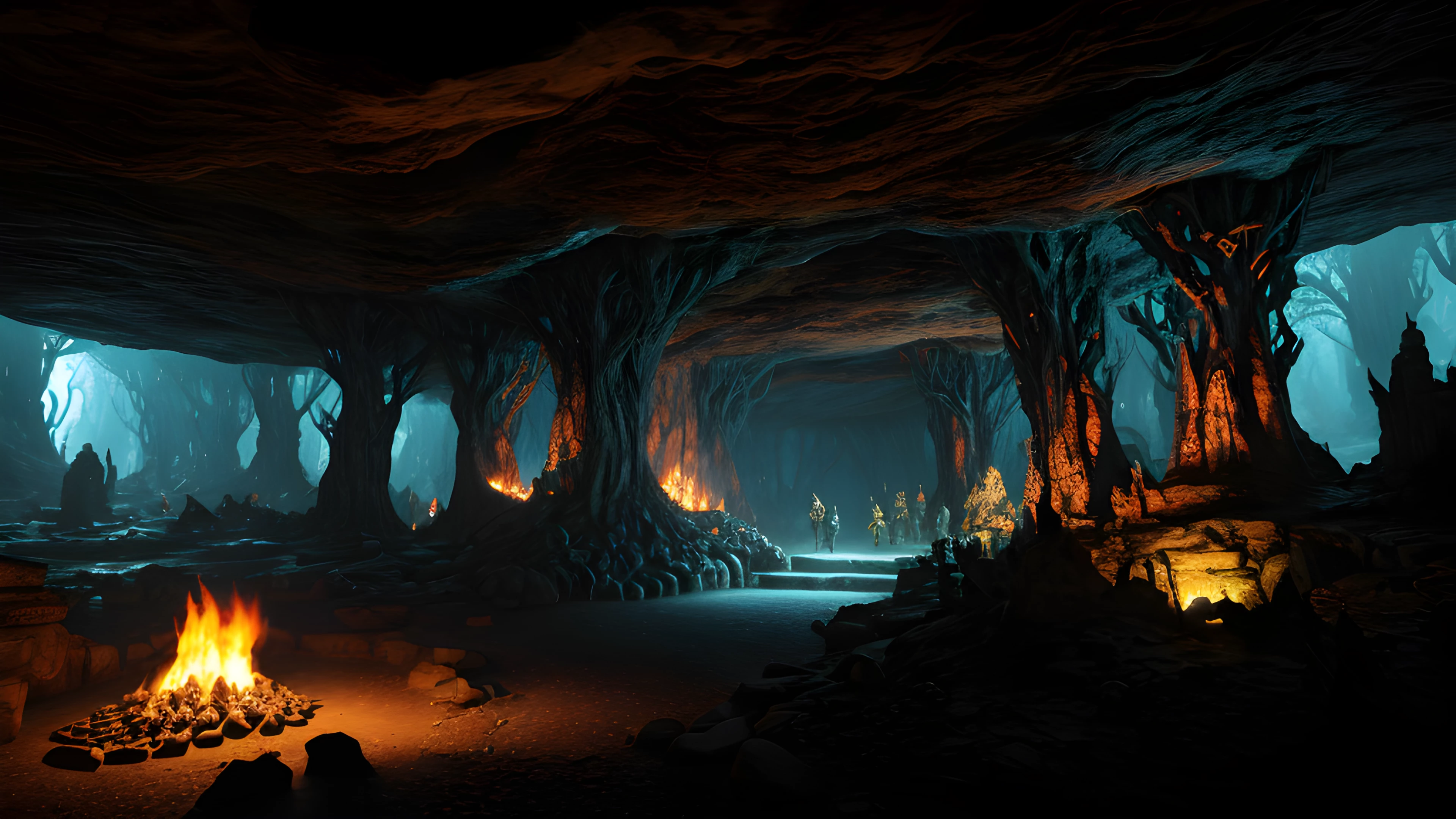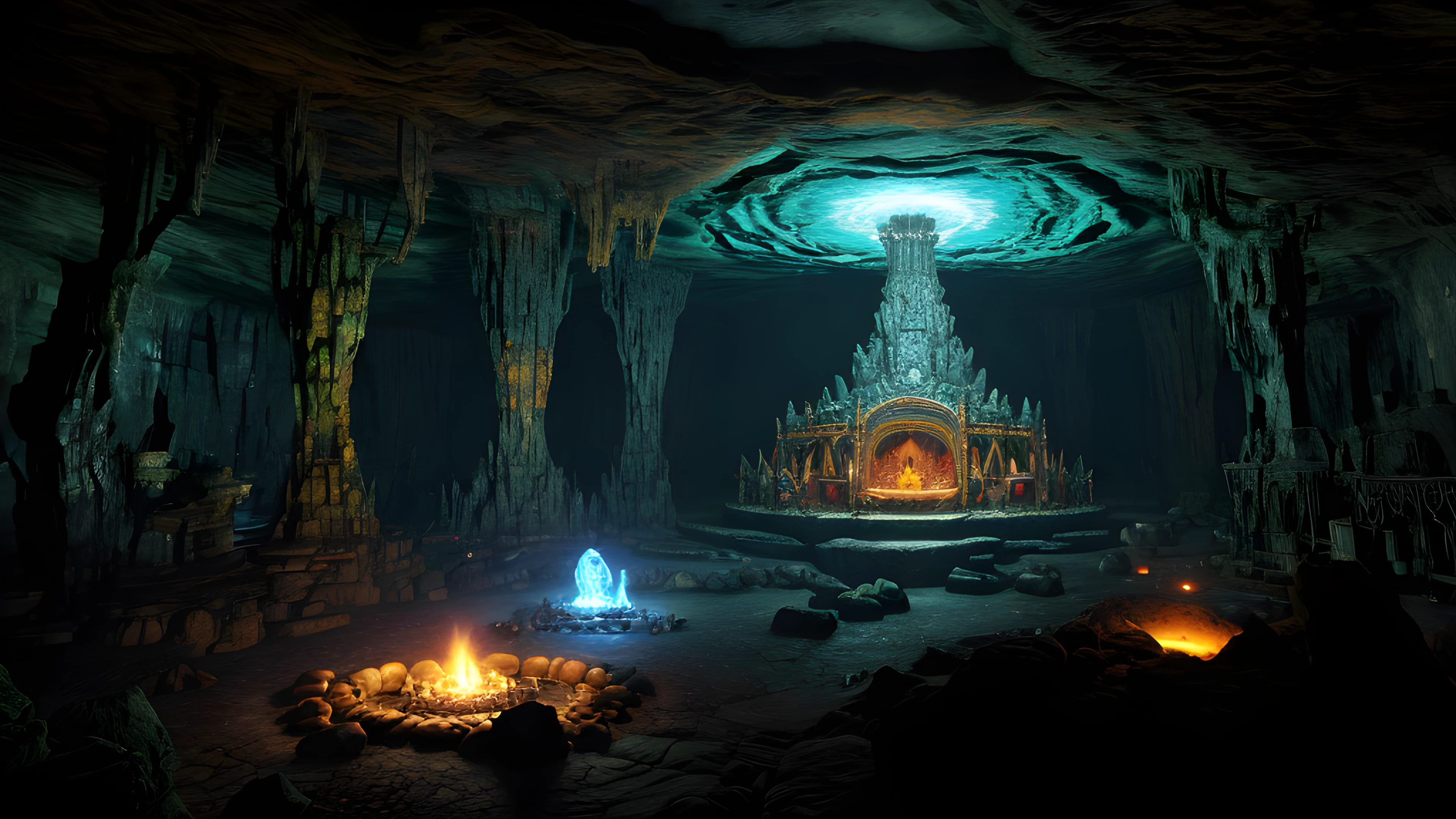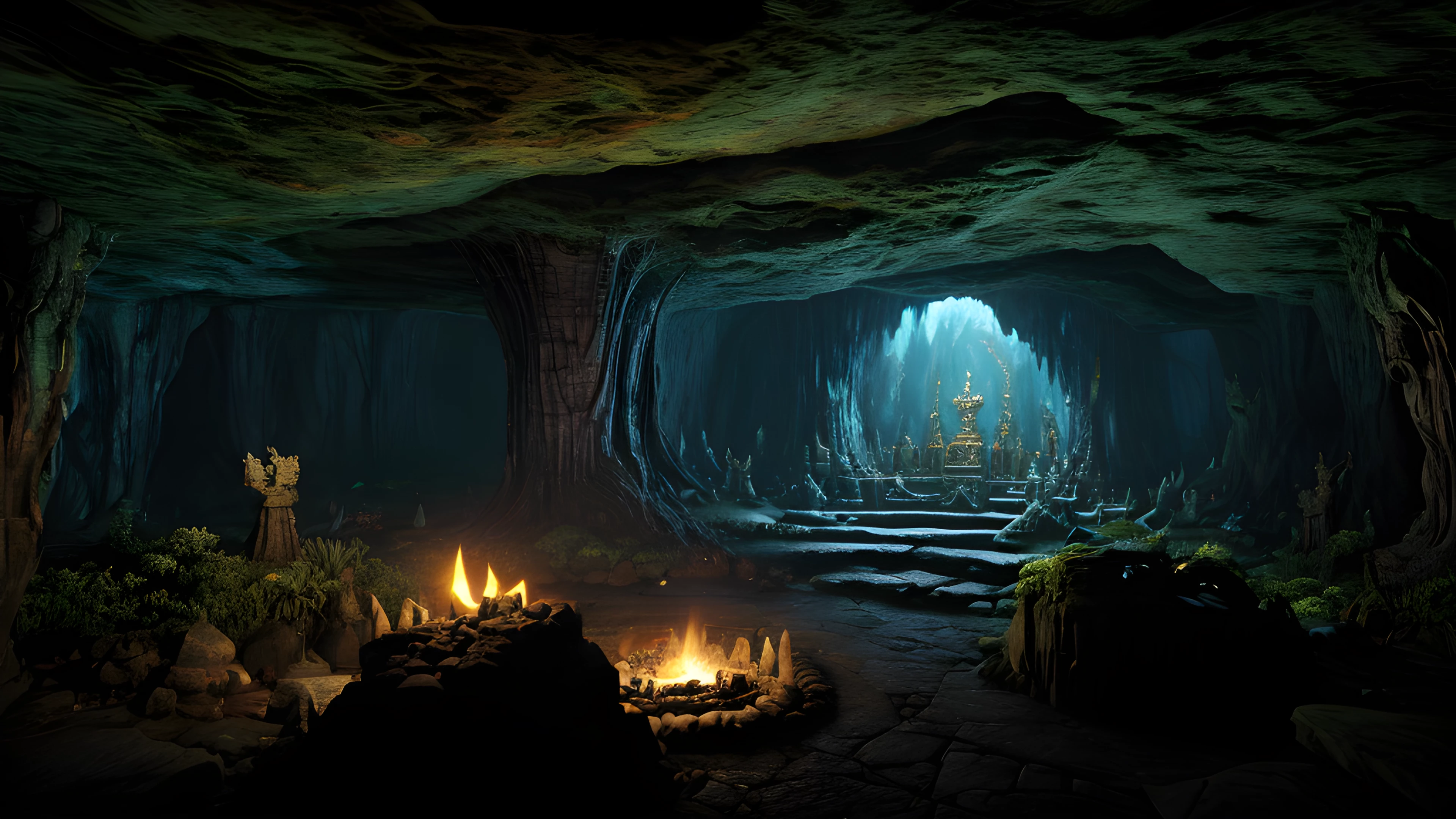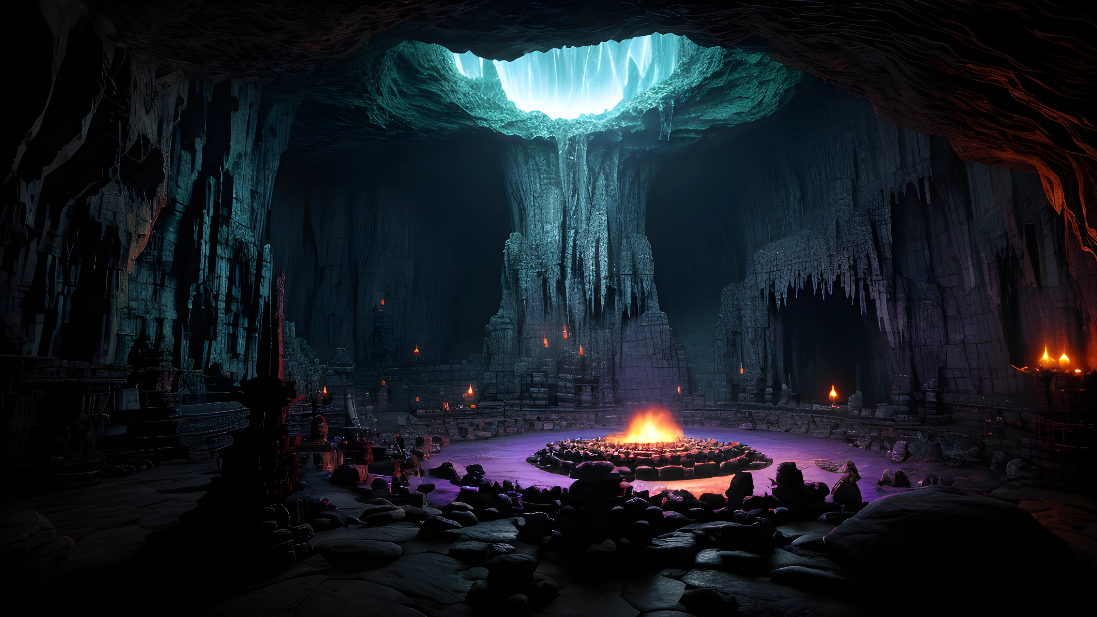 Cave of the Shamans, Enter the awe-inspiring, surreal cave where shamans gather to summon ancient creatures of mysticism, born of the twisted mind of Graham Masterton, Shamans, Creatures, Mysticism, Graham Masterton, Surreal, Underground, Ritual, Artifacts, Darkness, elaborated detailed 8k, detailed, 4k 8k 16k gigapixel render, highly detailed, 8k, cinematic HDR SSAO RTX