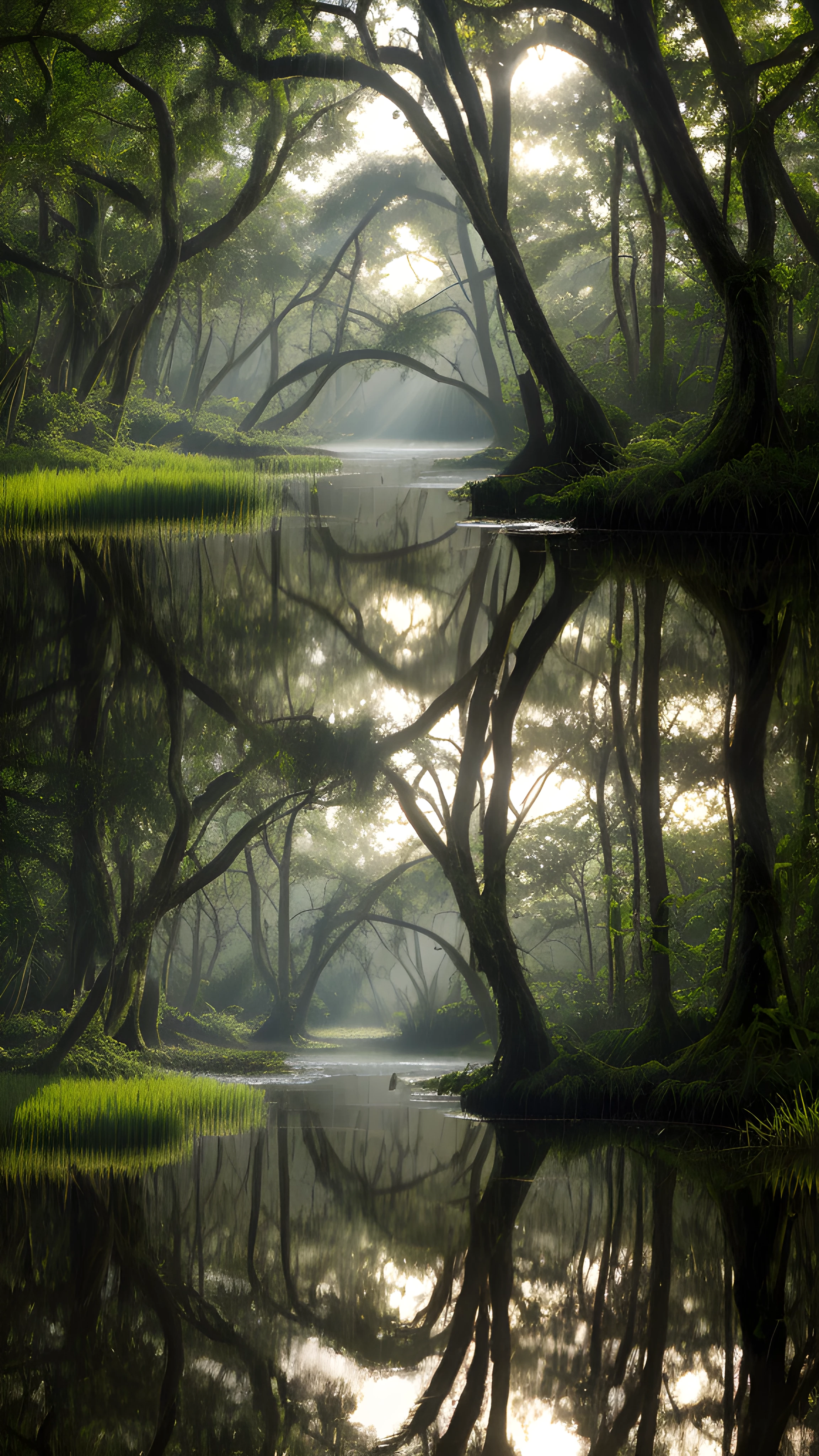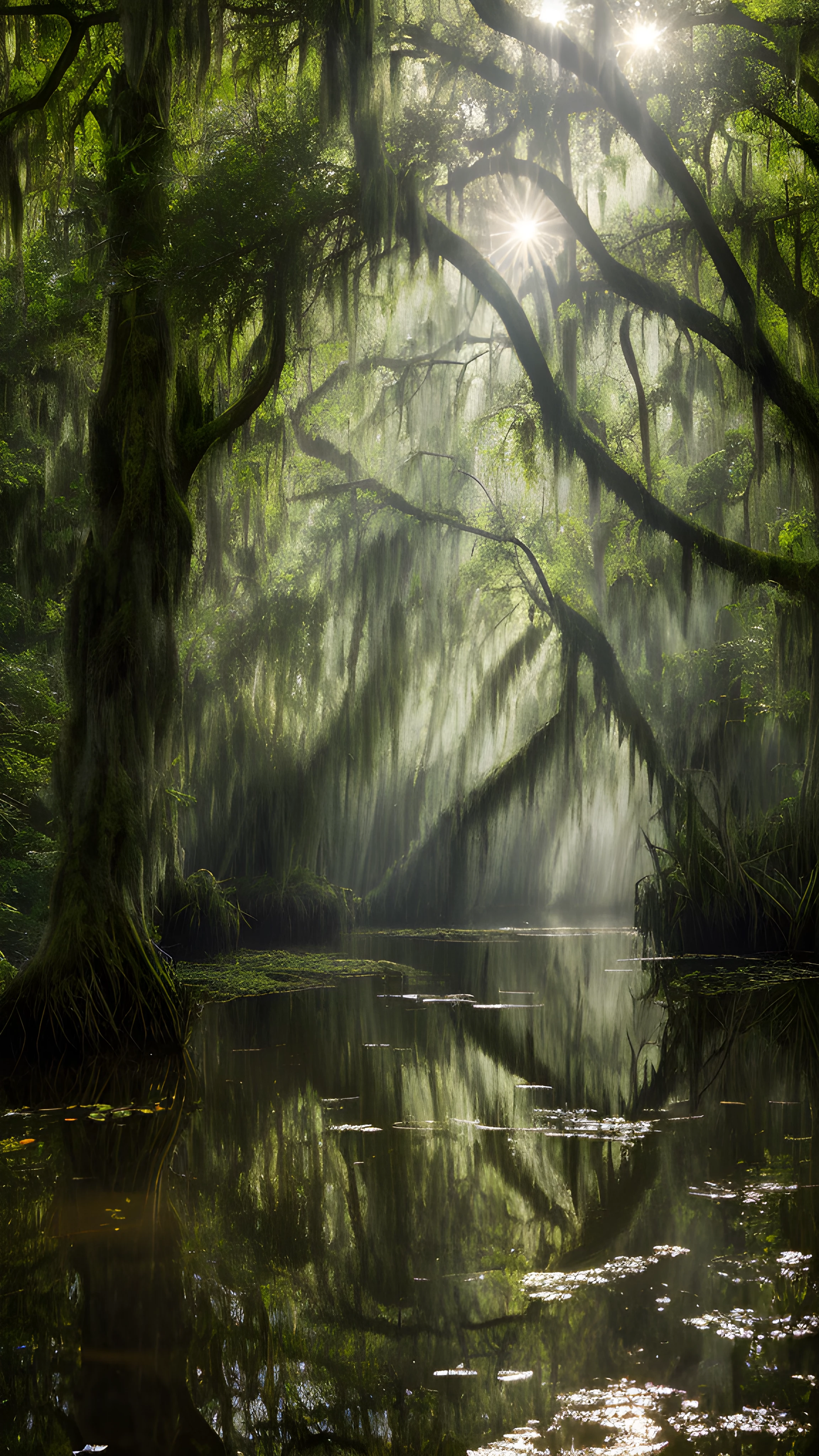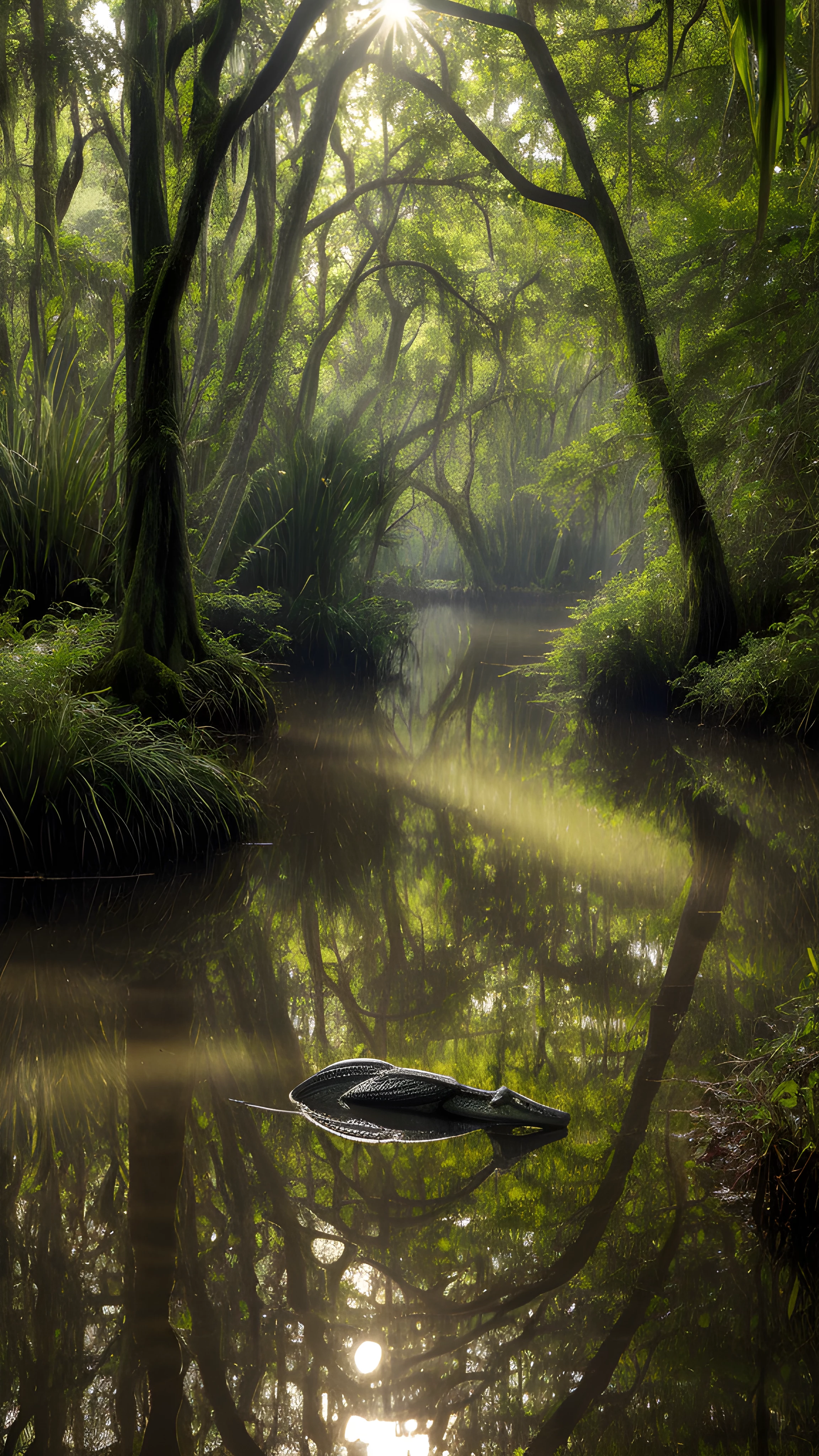 As the sun peeks through the canopy of trees, creating dappled light in the swamp, the protagonist, a majestic alligator, glides through the still water, blending seamlessly into this serene and wild landscape