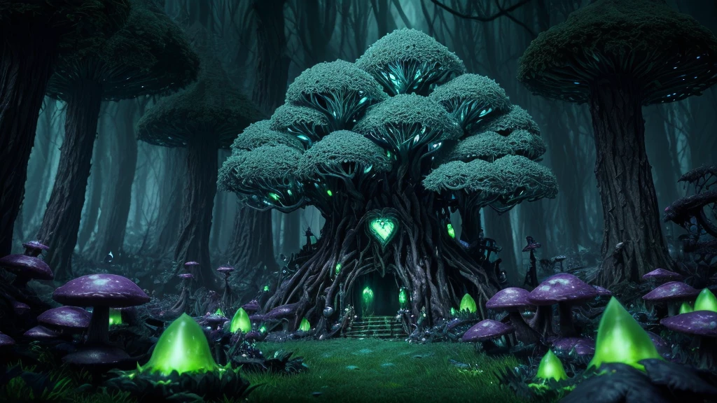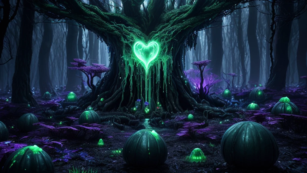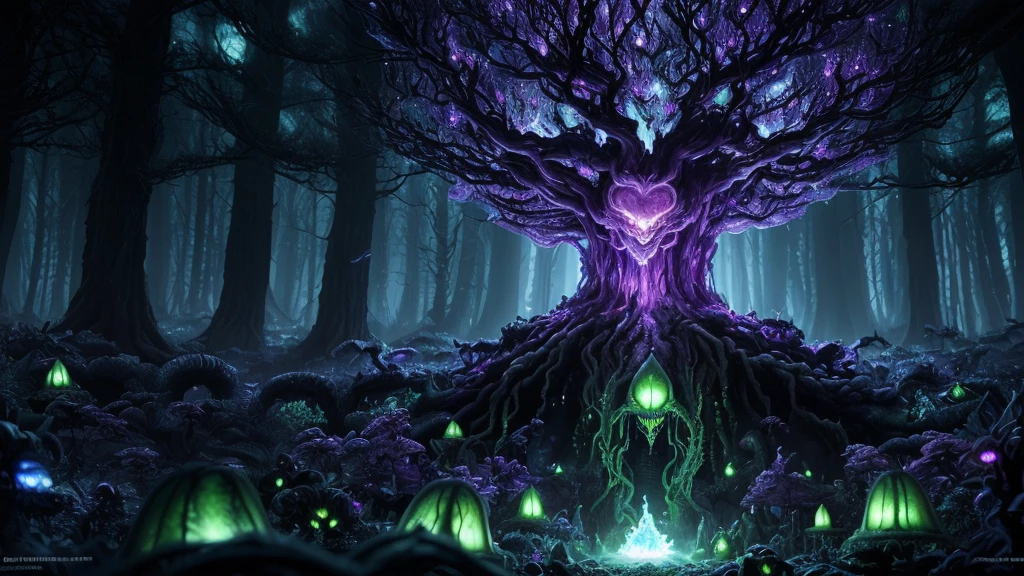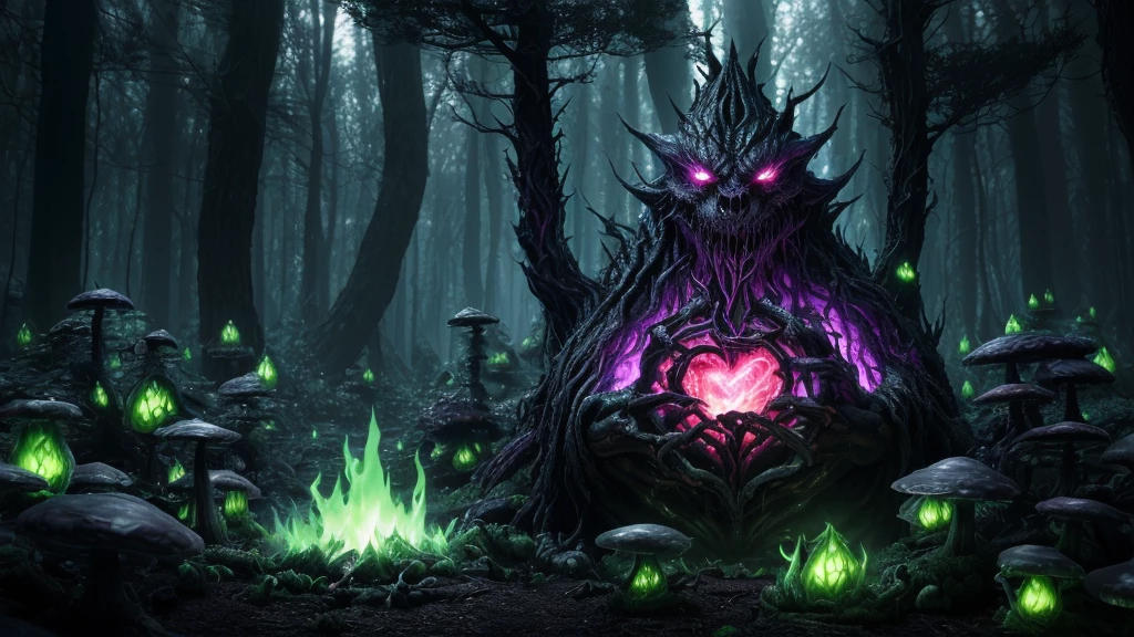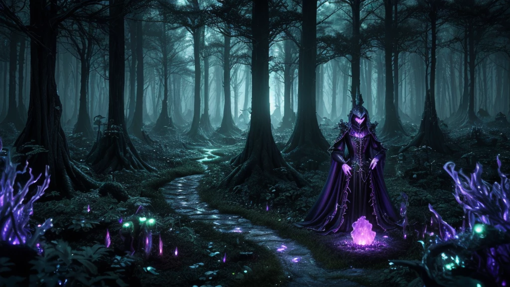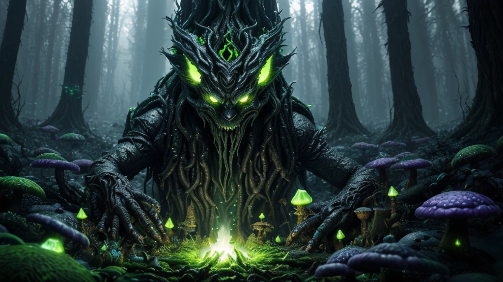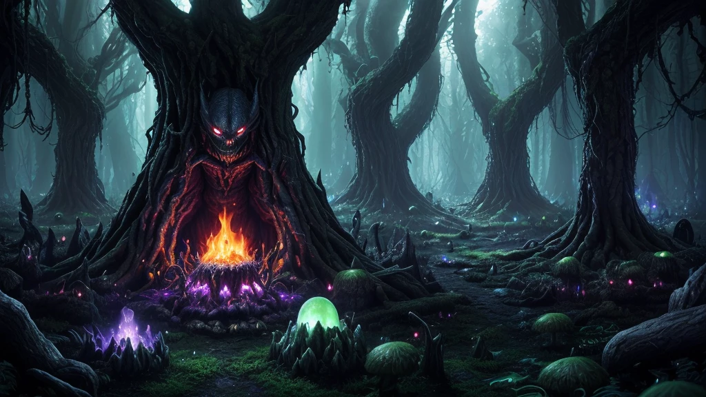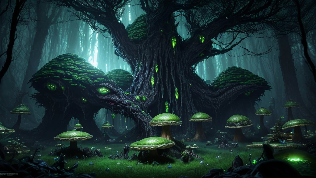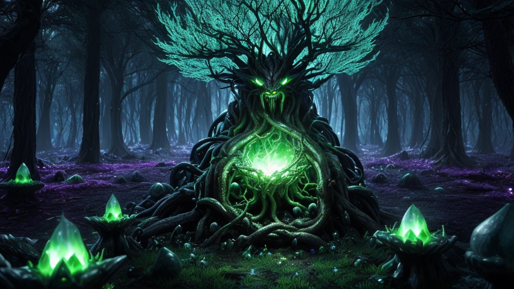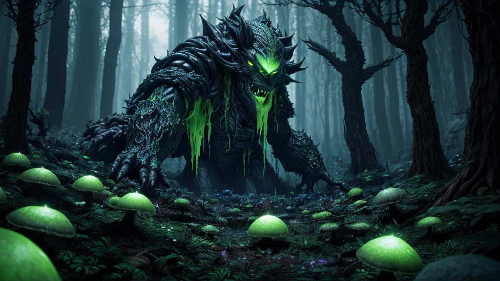 Envy, the Sinister Slime, Among the dark, mystical forest filled with crystalline mushrooms lies Envy As slimy as it is sly, this new monster creates tremors within the hearts of any who lay eyes upon it Powered by its own toxic jealousy, Envy masterfully manipulates nature in simply hideous ways Dare you venture near?, monsters, enchanted forest, slimy, slime, dark, fantasy, mesmerising, twitching, elaborated detailed 8k, detailed, 4k 8k 16k gigapixel render, highly detailed, 8k, cinematic HDR SSAO RTX