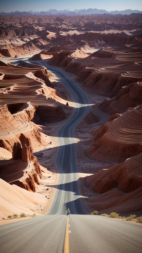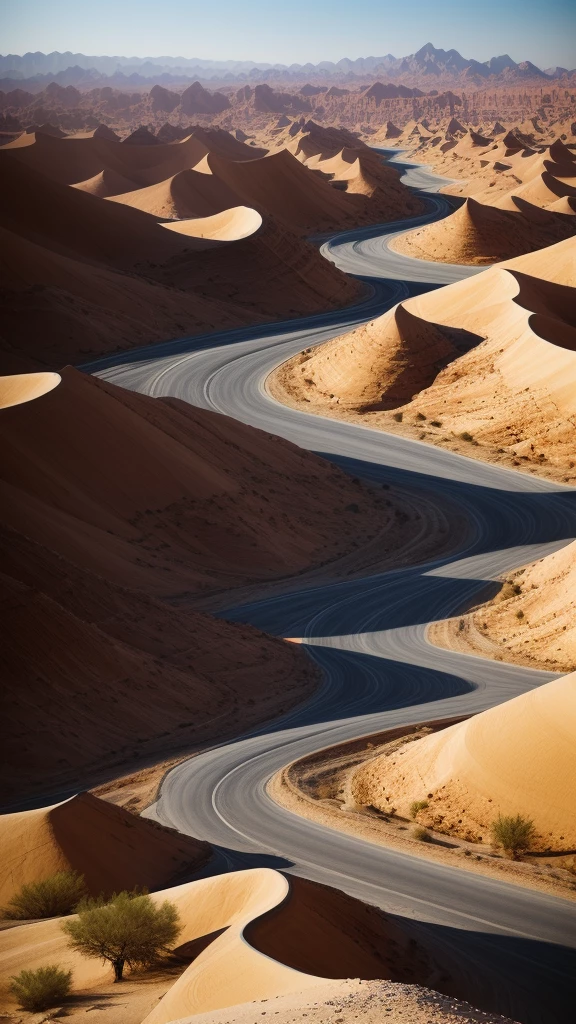 Desert Journey A Textile Creation of Huang Yan, Witness the masterful blend of graphic design and painting on textile art by Huang Yan as he captures the beautifully rugged expanse of the desert Follow the winding road into the peaceful abyss of sand, limitless and free, art, textile, graphic design, painting, desert, journey, Huang Yan, road, expansive, freedom, elaborated detailed 8k, detailed, 4k 8k 16k gigapixel render, highly detailed, 8k, cinematic HDR SSAO RTX