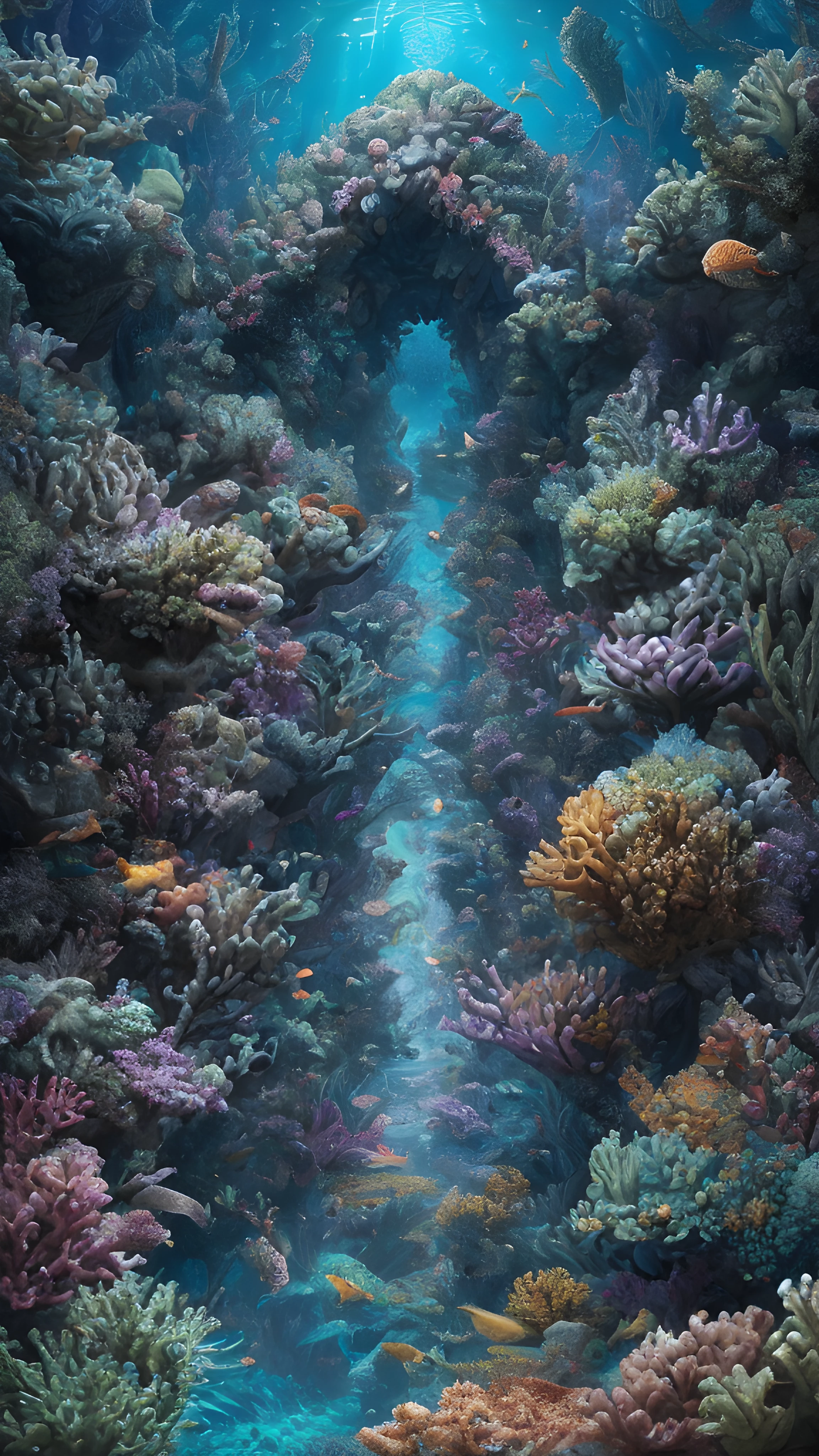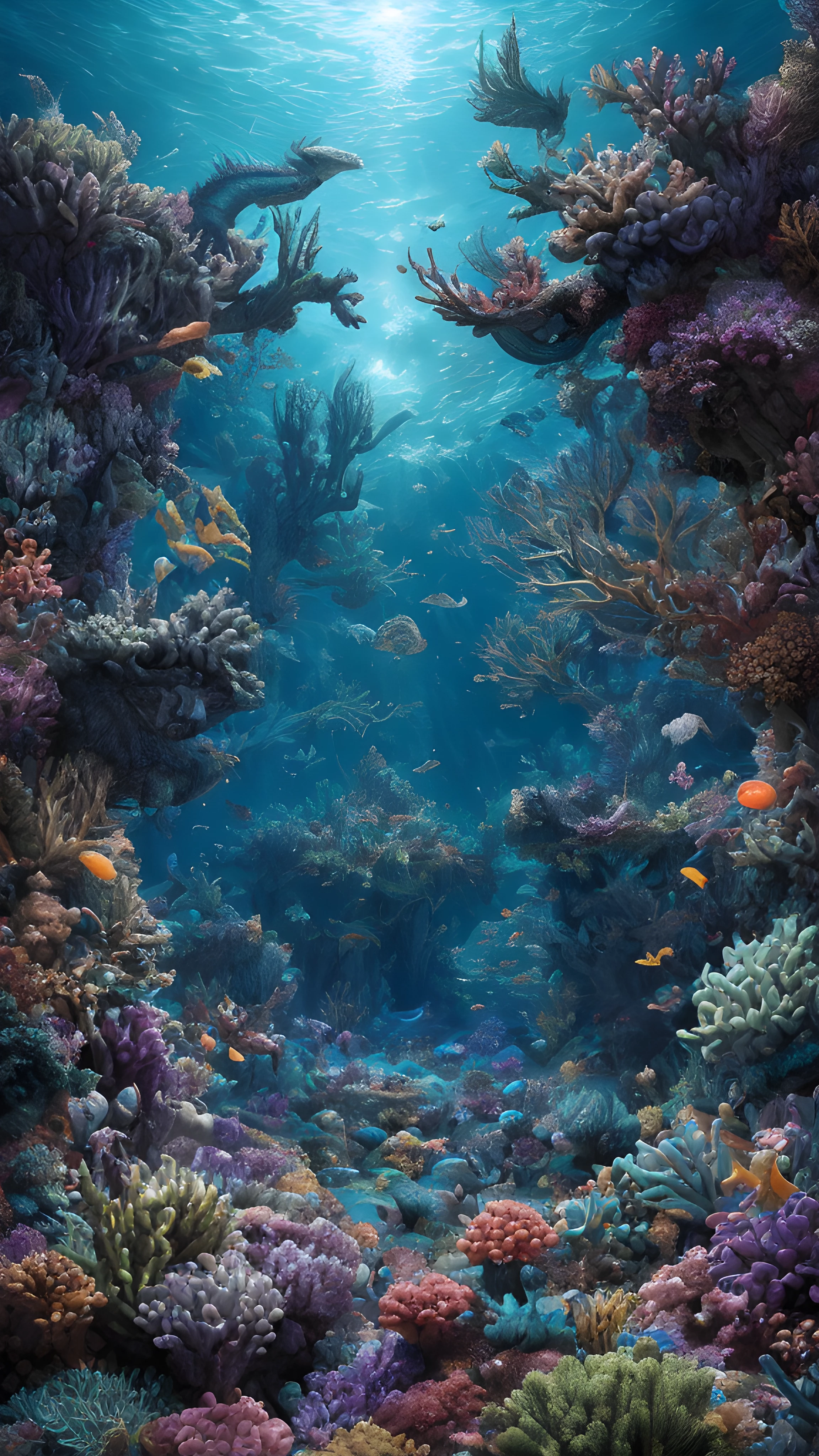 Fantasy Image of Coral Labyrinth A Colorful Underwater Adventure, Explore a maze-like world made of vibrant coral in the ethereal realm under the sea, and encounter merfolk living peacefully with winged dragons and other fantastical creatures, coral maze, underwater world, mermaids, winged dragons, fantasy art, sci-fi photo, hyperdetailed, high quality, 8k, HDR, UHD, realistic photo, perfect anatomy, ultra realistic, photography hyper realistic and hyper detailed, hyper emotional,