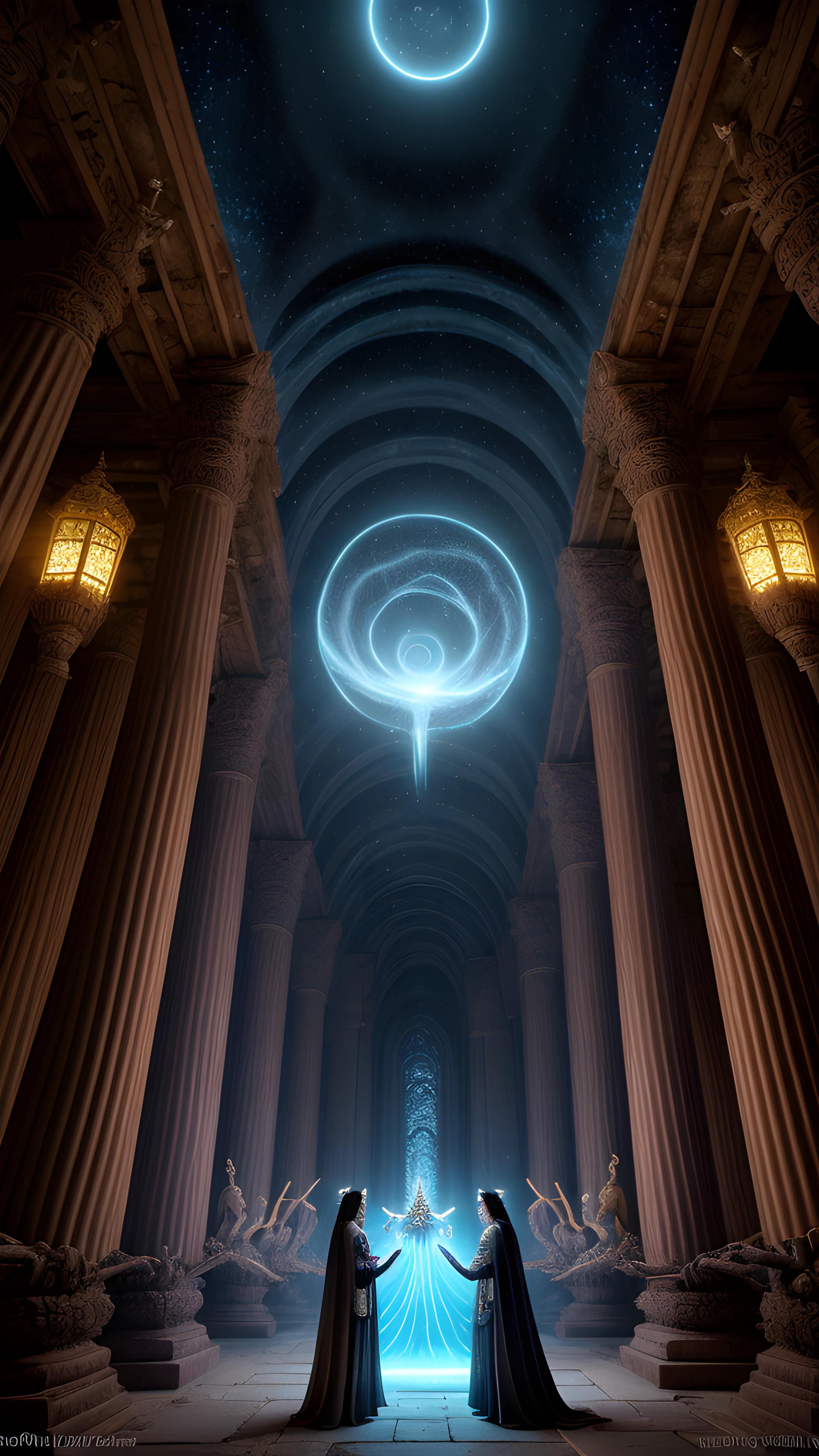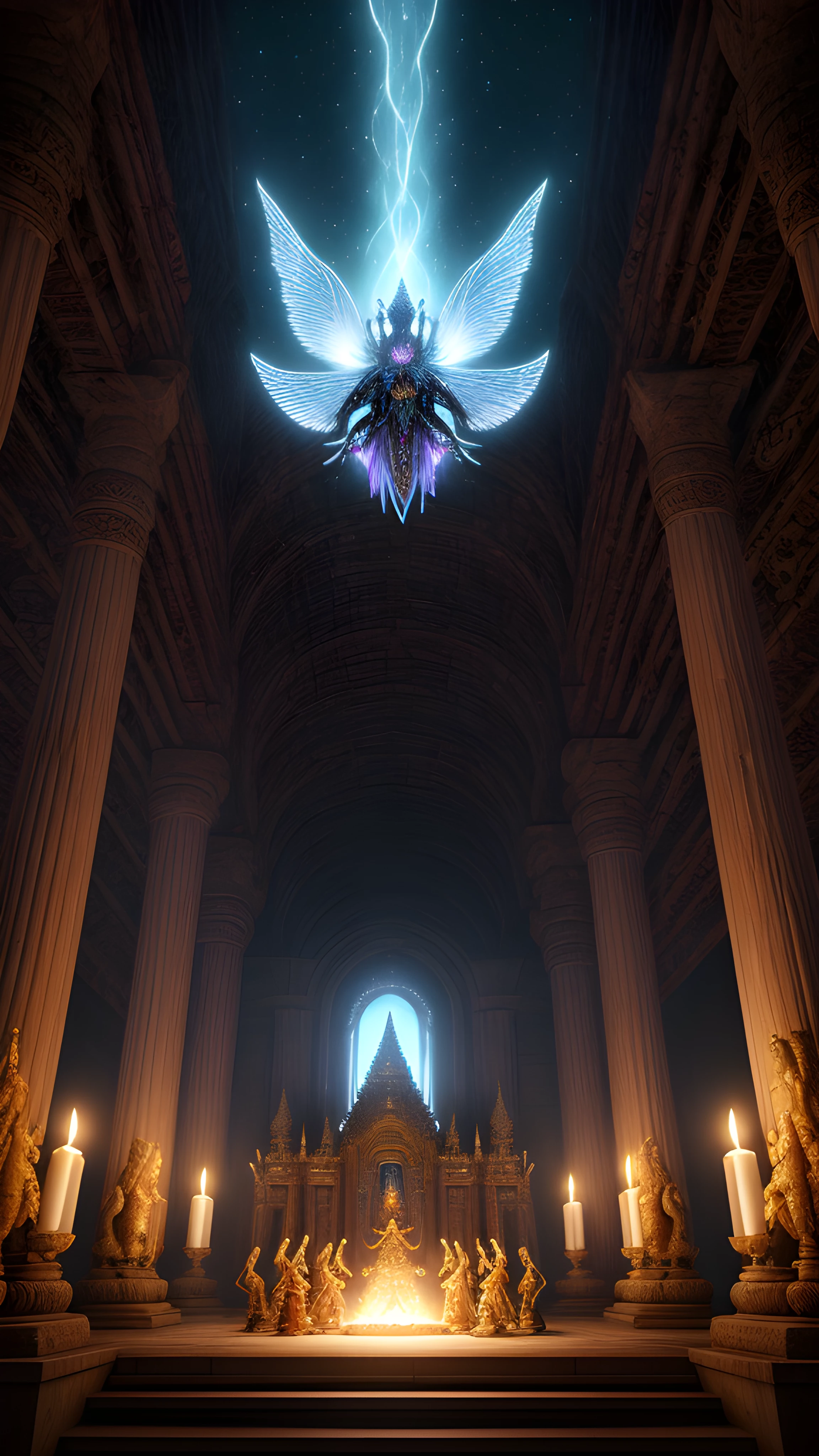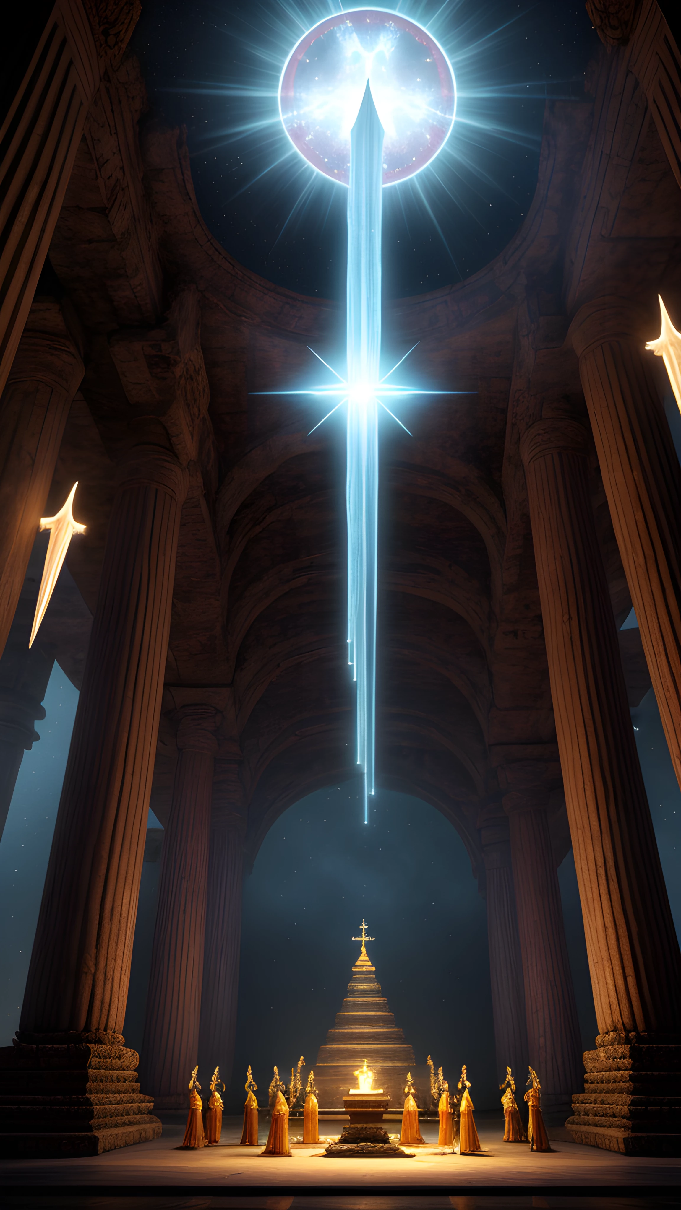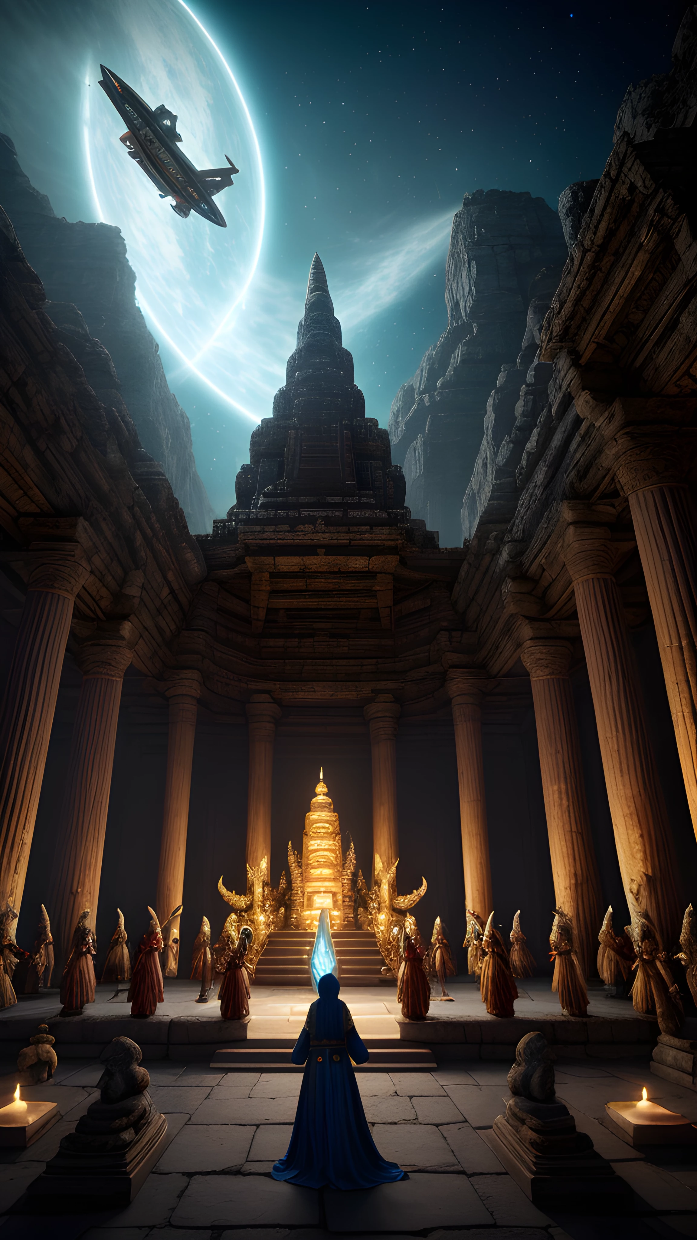 Fantasy Image of Mystical Rituals at the Ancient Temple, Enchantresses gather at the ancient temple, surrounded by ethereal beings and mystical starships illuminated by fey magic as they perform secret rituals that only they can understand, temple, enchantresses, ethereal, mystical, starships, fey magic, secret rituals, non-human beings, sci-fi photo, hyperdetailed, high quality, 8k, HDR, UHD, realistic photo, perfect anatomy, ultra realistic, photography hyper realistic and hyper detailed, hyper emotional,