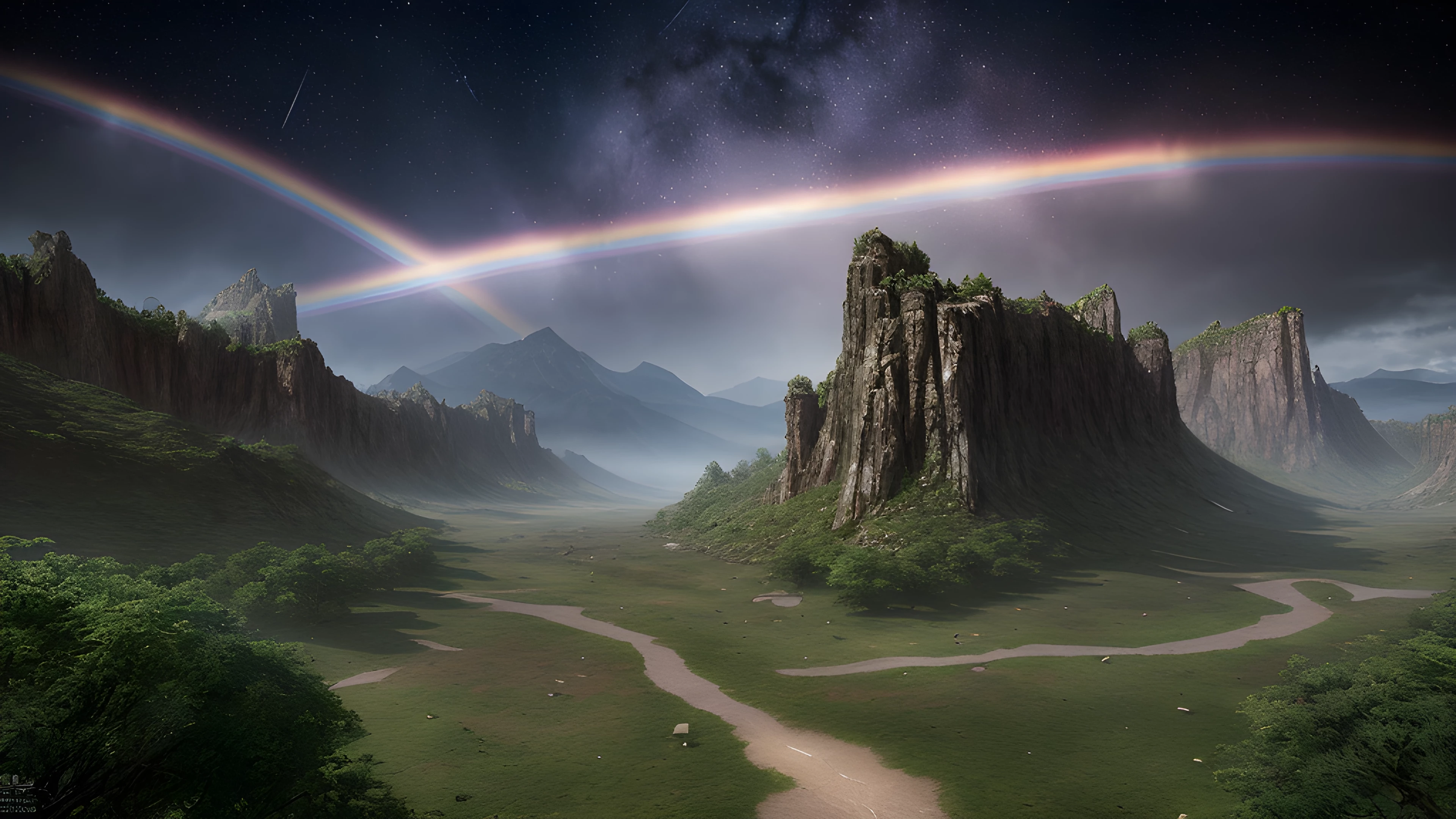 Fantasy Image of Valley of Felicity A Secret Gathering of Mystical Creatures, In an ethereal valley, hidden by cloaking rainbows and swiftly passing stars, mythical creatures disguise as ordinary beings to guard their sacred societies, unicorns, rainbows, shooting stars, mystical creatures, secretive societies, disguise, espionage, Terryl Whitlatch, sci-fi photo, hyperdetailed, high quality, 8k, HDR, UHD, realistic photo, perfect anatomy, ultra realistic, photography hyper realistic and hyper detailed, hyper emotional,