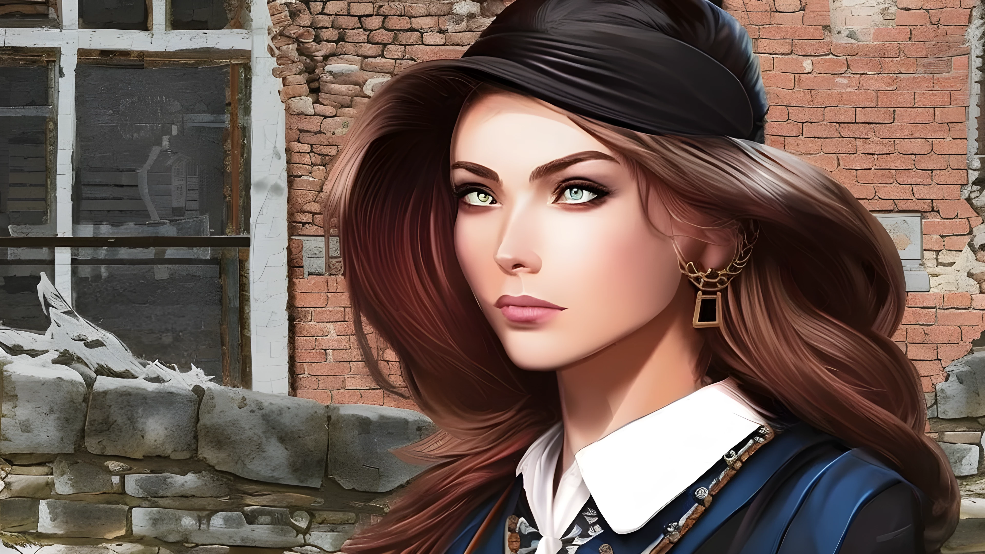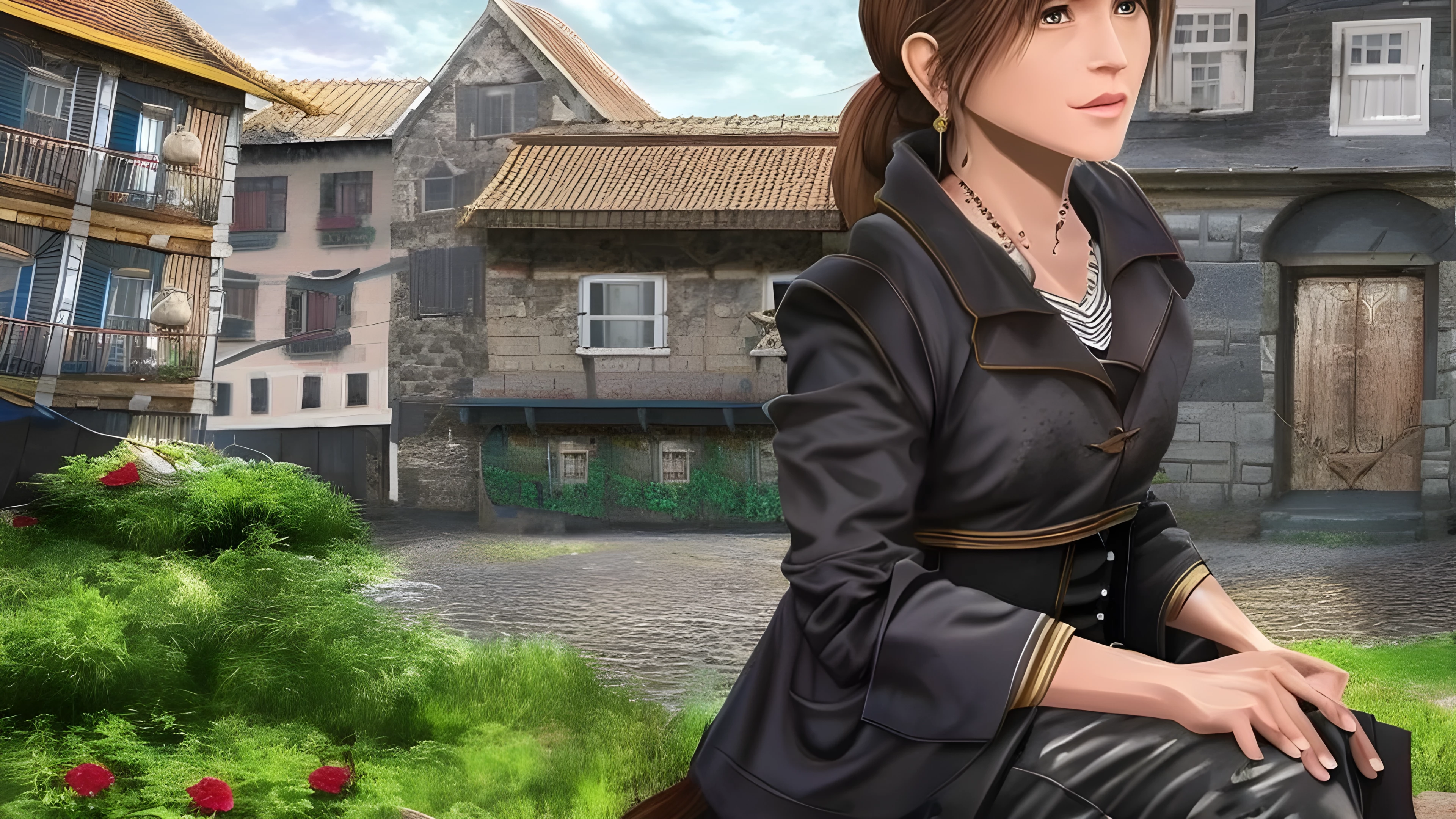 In a quaint village square, a woman sits surrounded by aging buildings and crumbling cobblestone With a steely determination in her eyes, she holds on to her past as she creates a mesmerizing piece of art Inspired by Sakimichan's digital illustrations