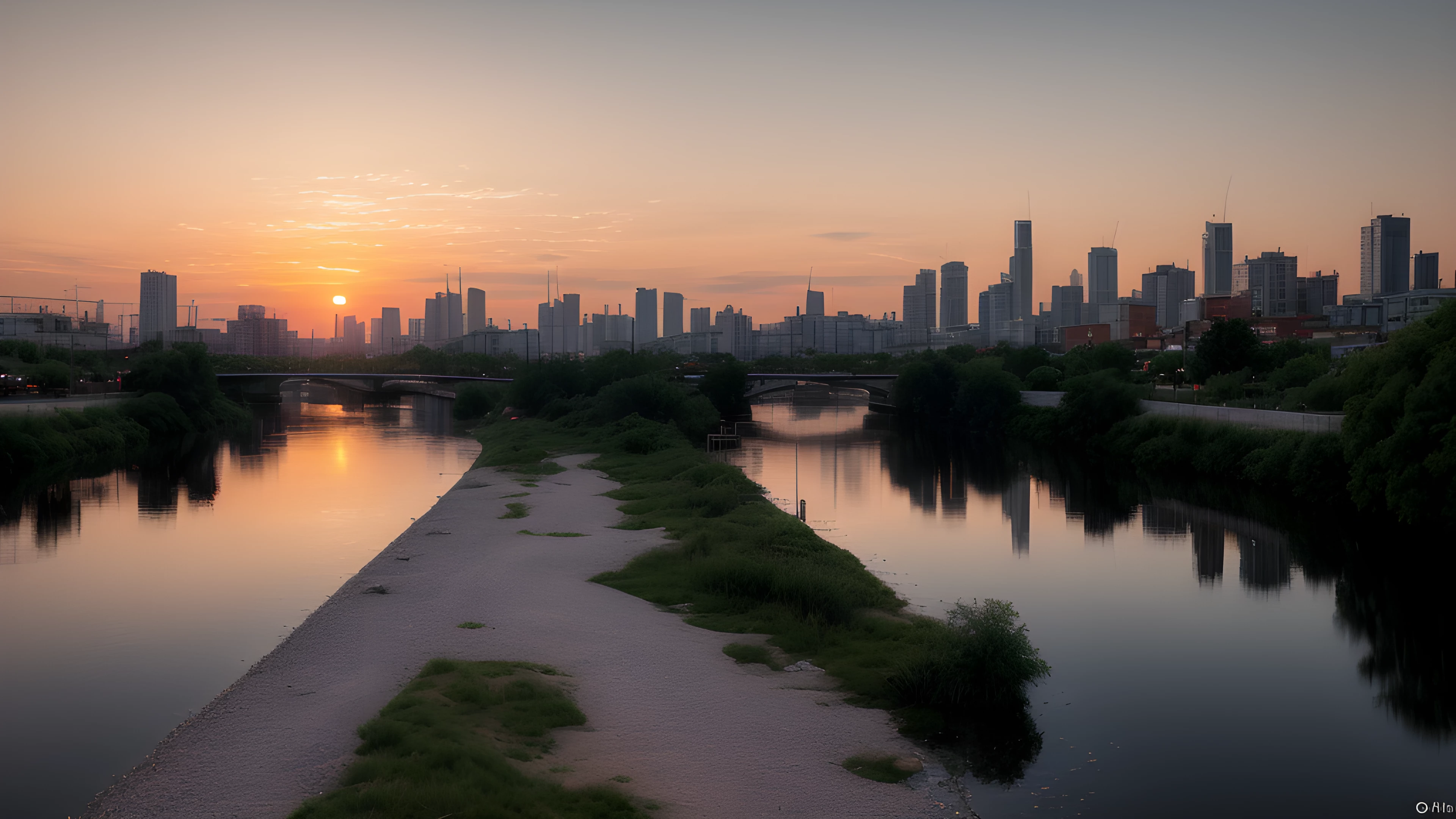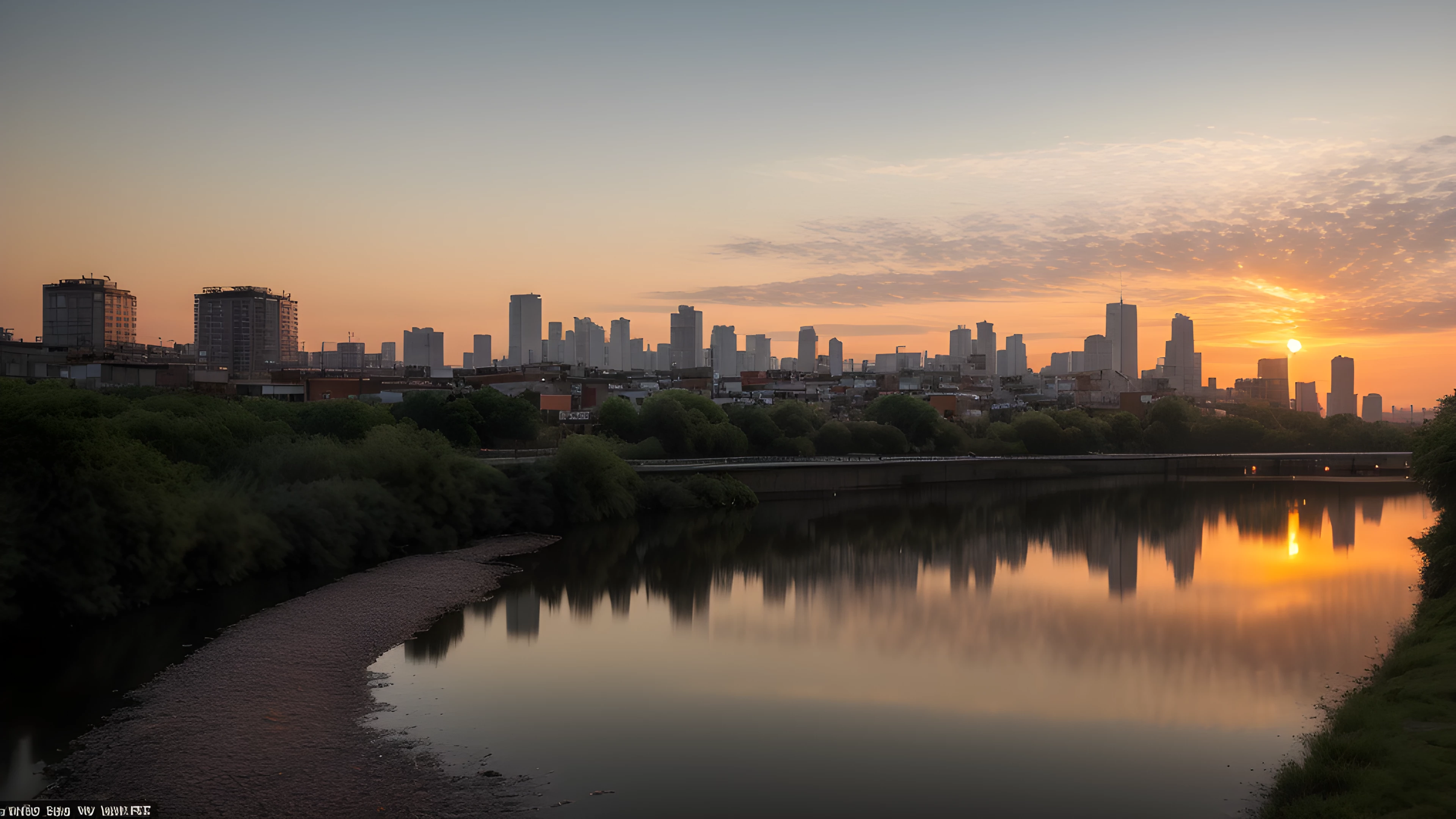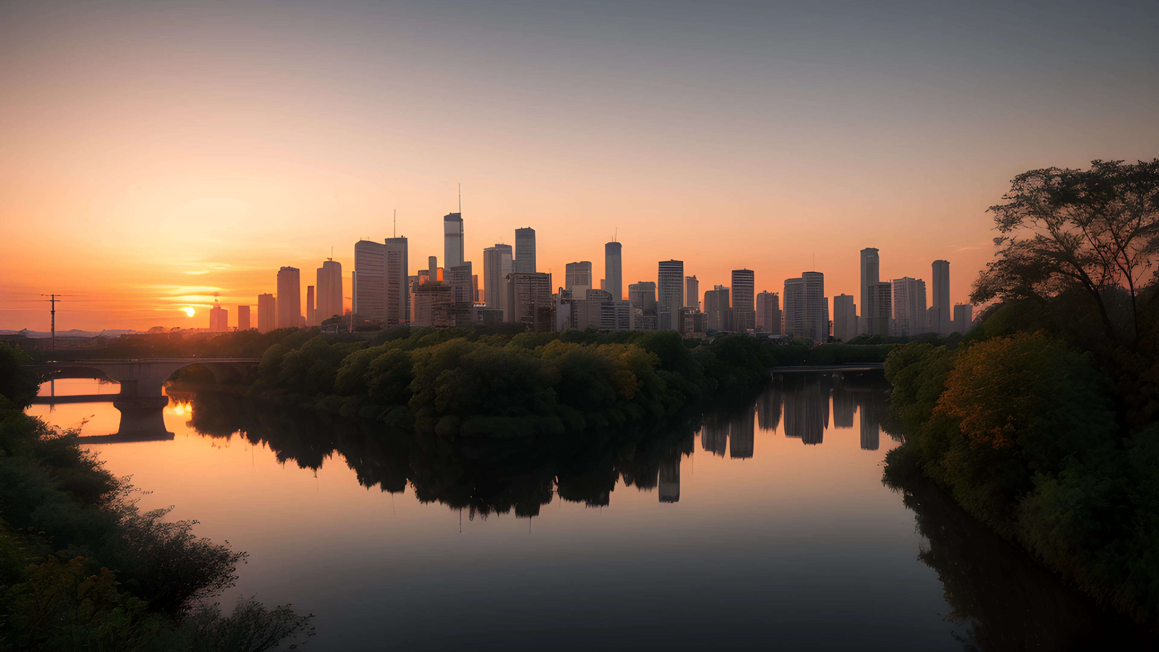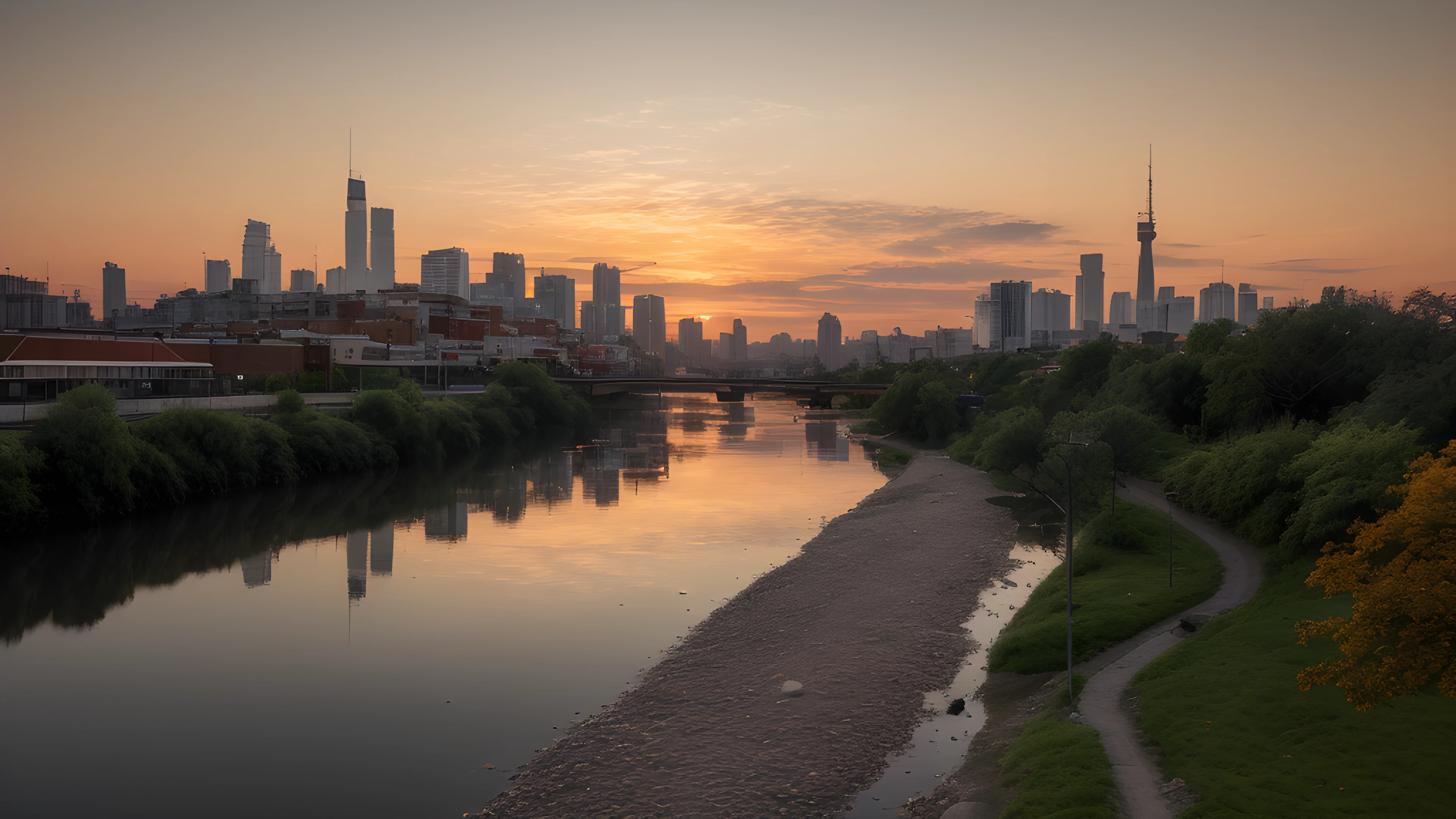 Orange Water A Social Art Reflection, As the sun dips below the horizon, shades of orange cascade through the sky, painting a tranquil backdrop for the bustling cityscape In the distance, a river flows gently, highlighting the contrast between man-made and natural beauty Inspired by Tracey Emin's exploration of the self through art, this scene reflects on our connection to the world around us and our impact on it, social art, sunsets, river, cityscape, reflection, connection, Tracey Emin, elaborated detailed 8k, detailed, 4k 8k 16k gigapixel render, highly detailed, 8k, cinematic HDR SSAO RTX