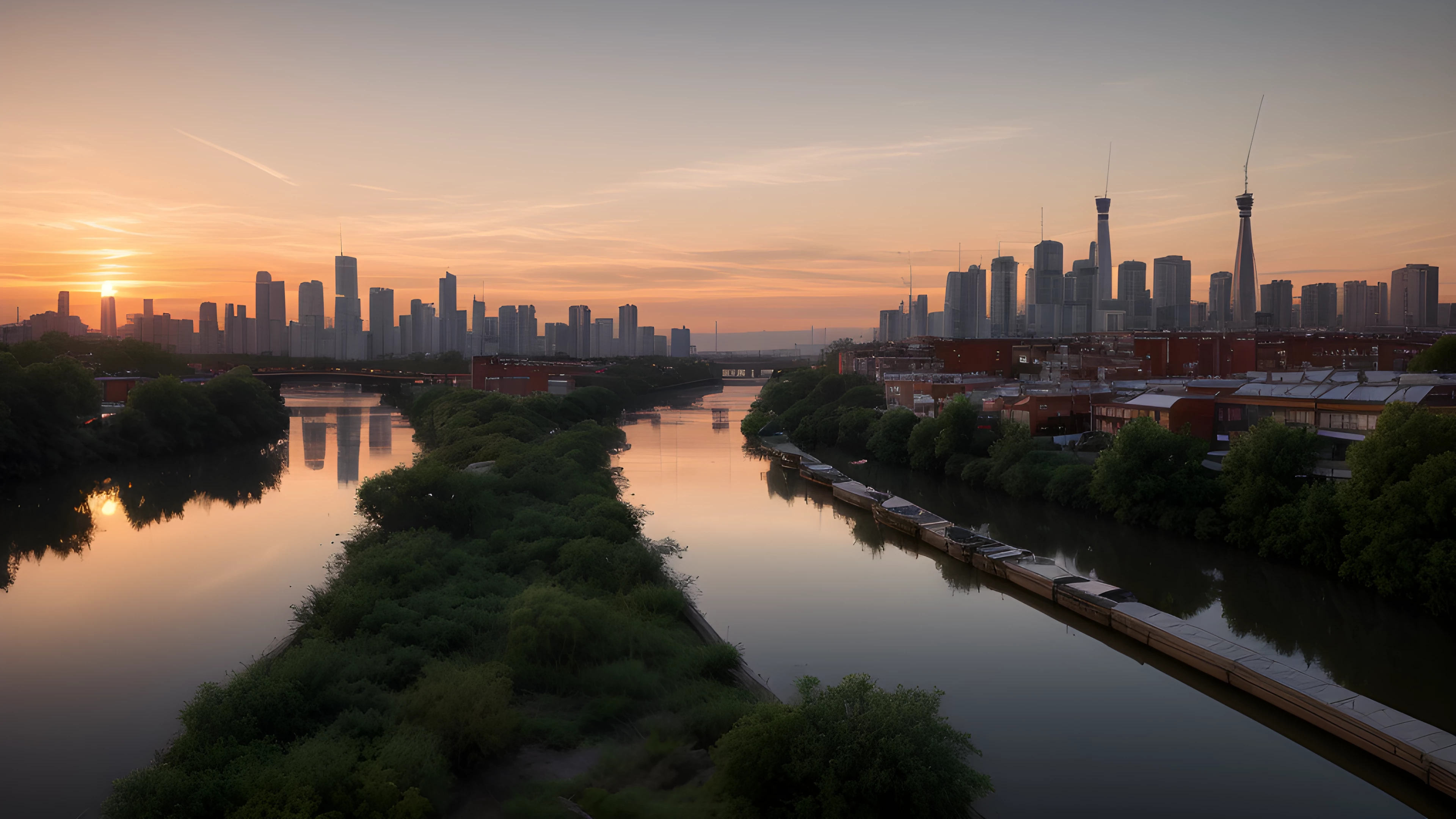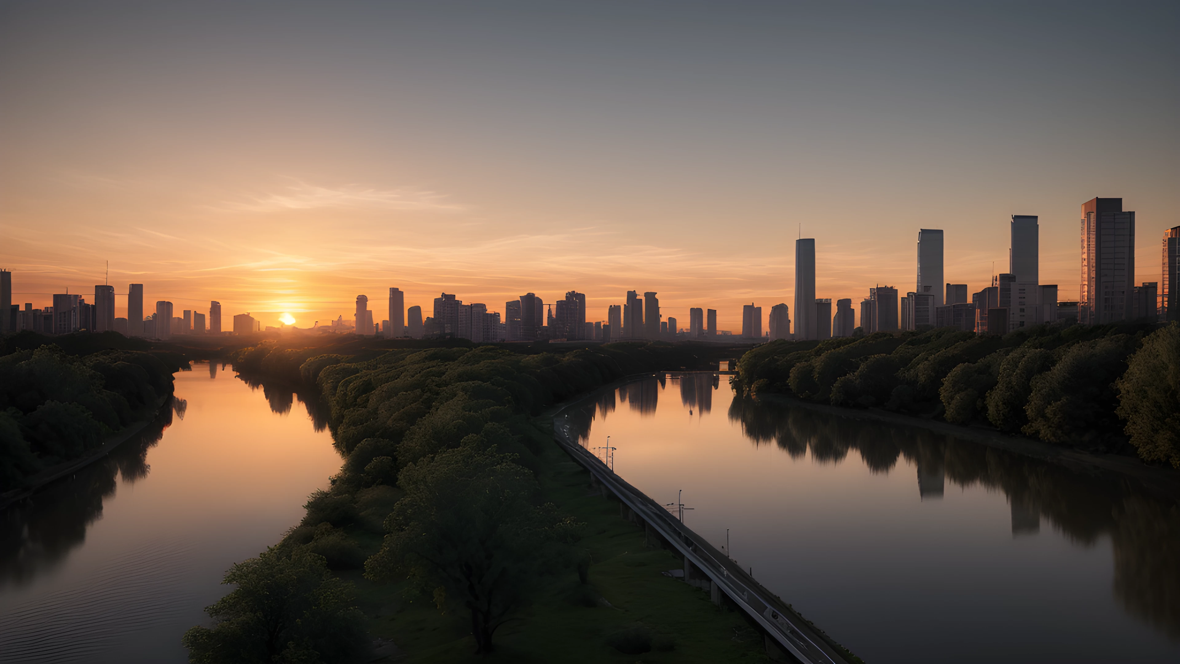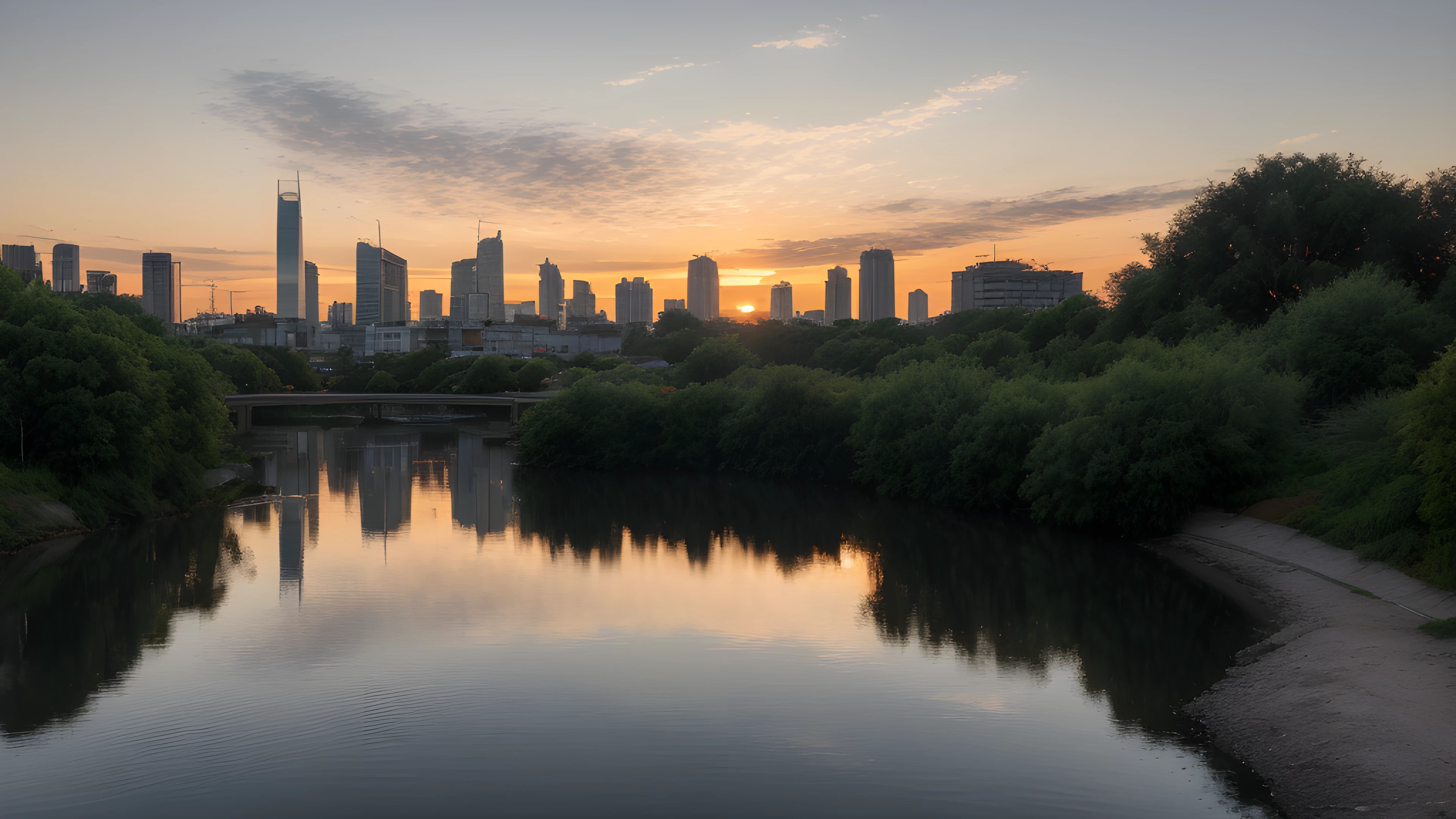 Orange Water A Social Art Reflection, As the sun dips below the horizon, shades of orange cascade through the sky, painting a tranquil backdrop for the bustling cityscape In the distance, a river flows gently, highlighting the contrast between man-made and natural beauty Inspired by Tracey Emin's exploration of the self through art, this scene reflects on our connection to the world around us and our impact on it, social art, sunsets, river, cityscape, reflection, connection, Tracey Emin, elaborated detailed 8k, detailed, 4k 8k 16k gigapixel render, highly detailed, 8k, cinematic HDR SSAO RTX
