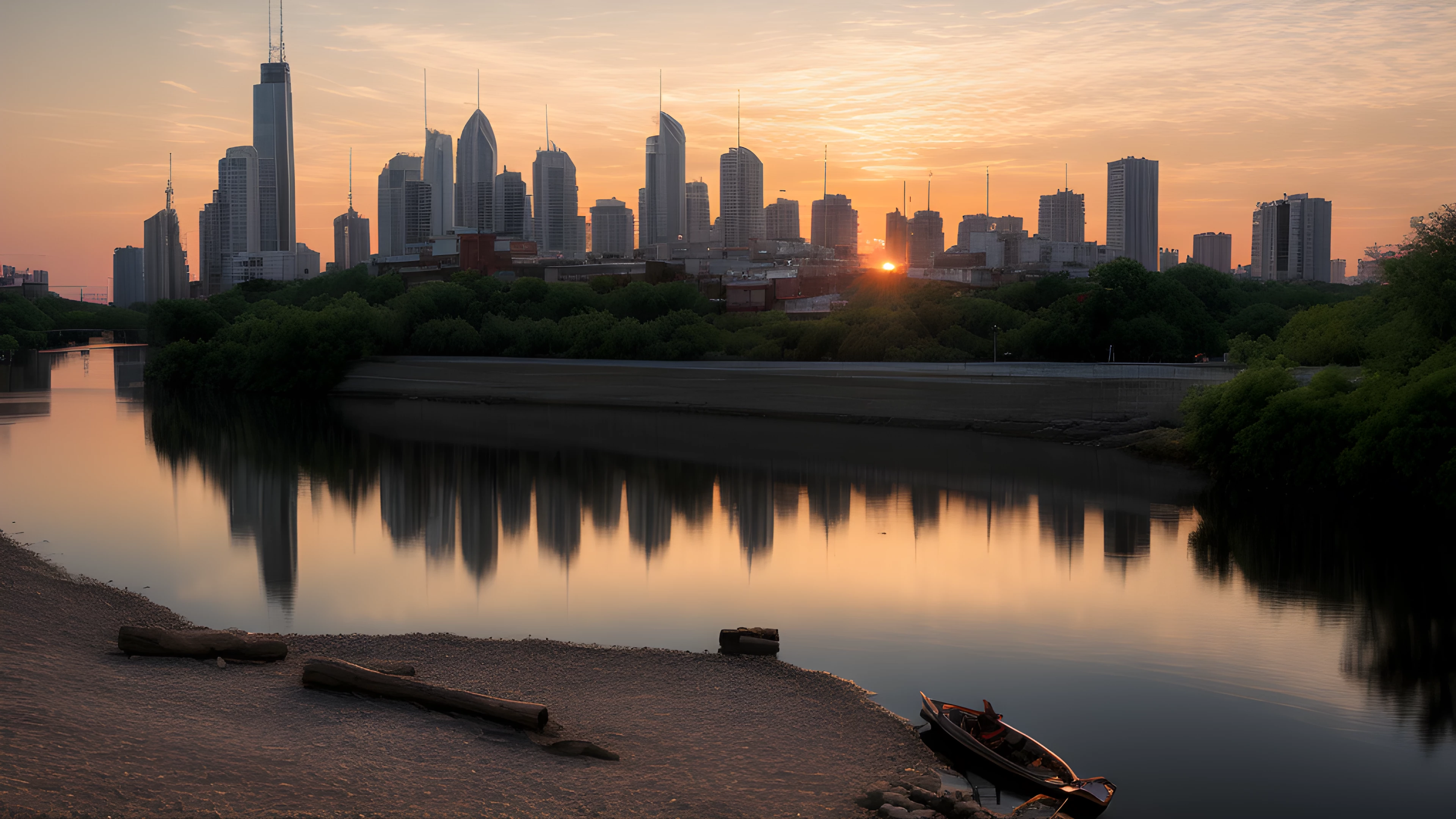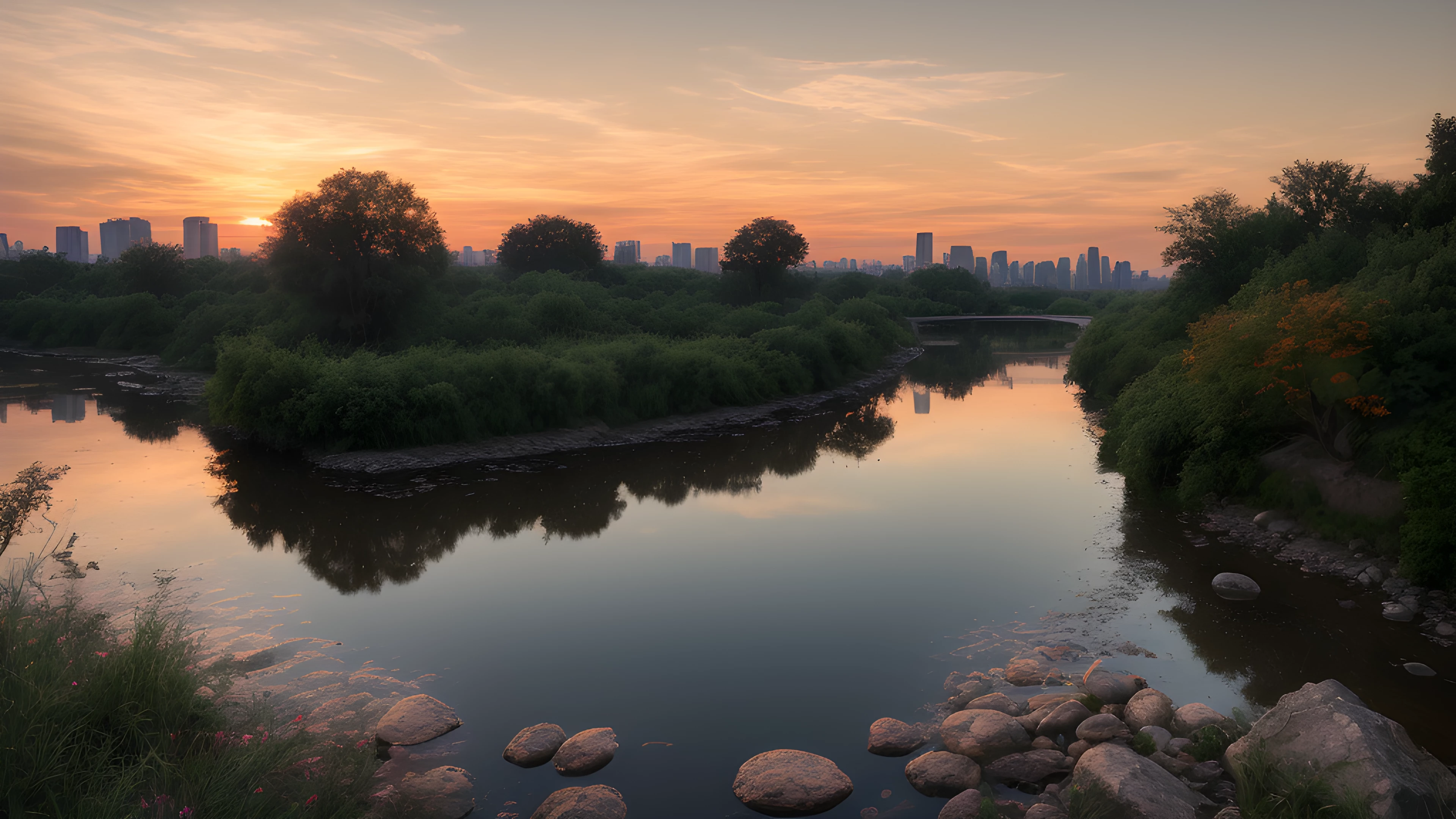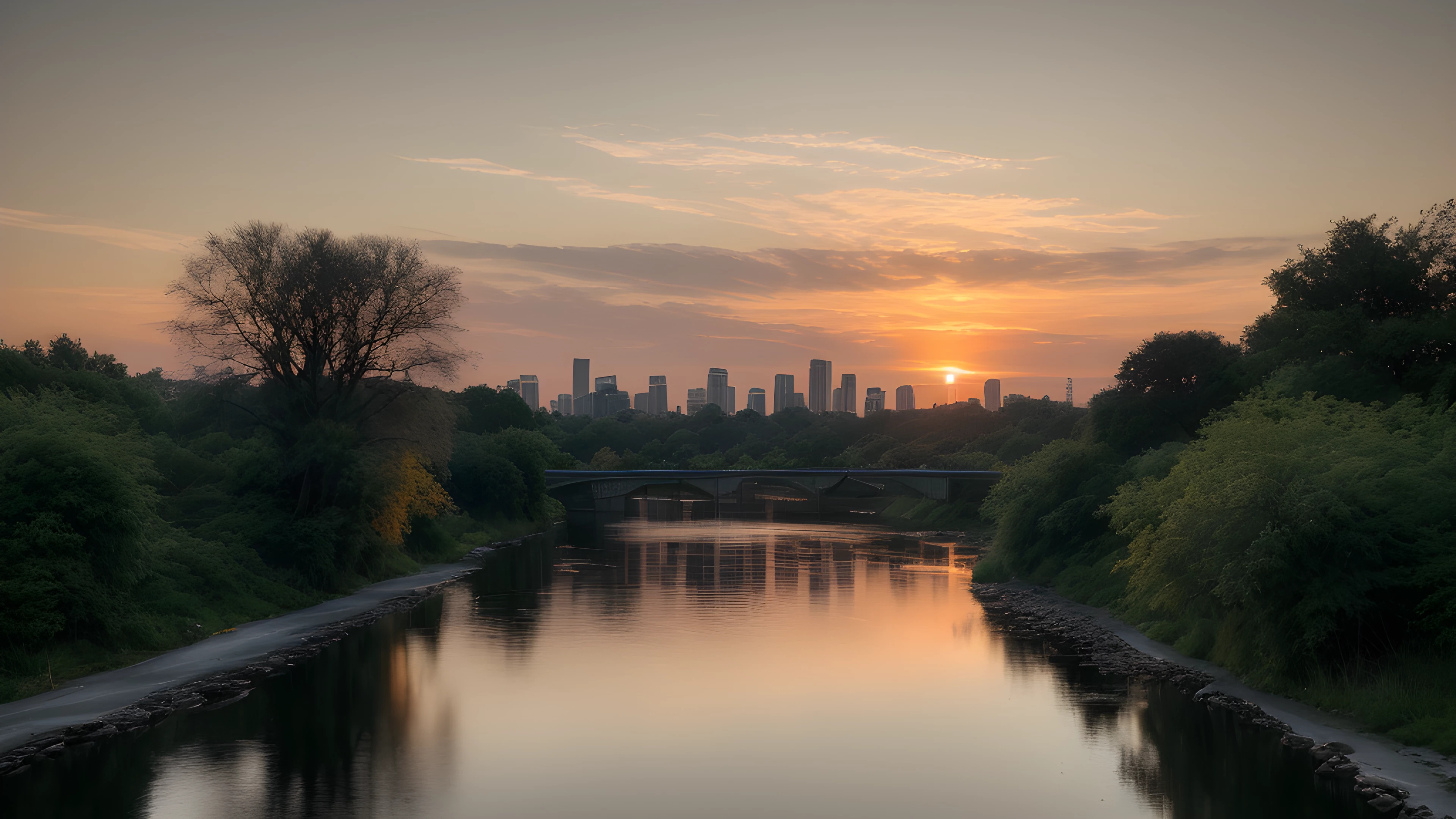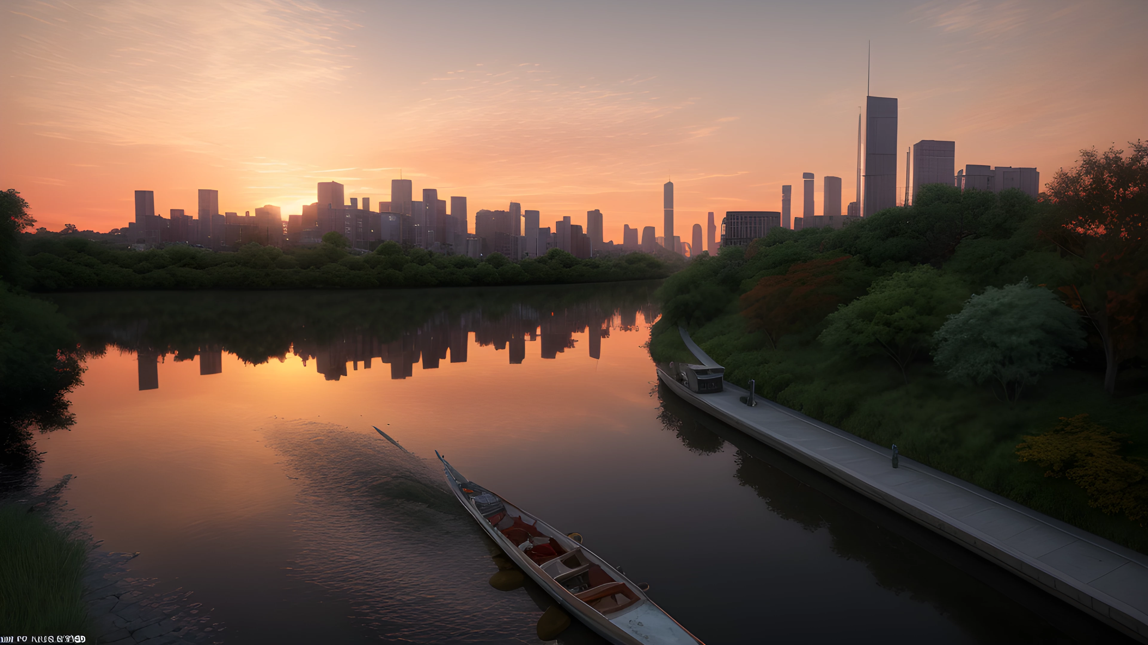 Orange Water A Social Art Reflection, As the sun dips below the horizon, shades of orange cascade through the sky, painting a tranquil backdrop for the bustling cityscape In the distance, a river flows gently, highlighting the contrast between man-made and natural beauty Inspired by Tracey Emin's exploration of the self through art, this scene reflects on our connection to the world around us and our impact on it, social art, sunsets, river, cityscape, reflection, connection, Tracey Emin, elaborated detailed 8k, detailed, 4k 8k 16k gigapixel render, highly detailed, 8k, cinematic HDR SSAO RTX