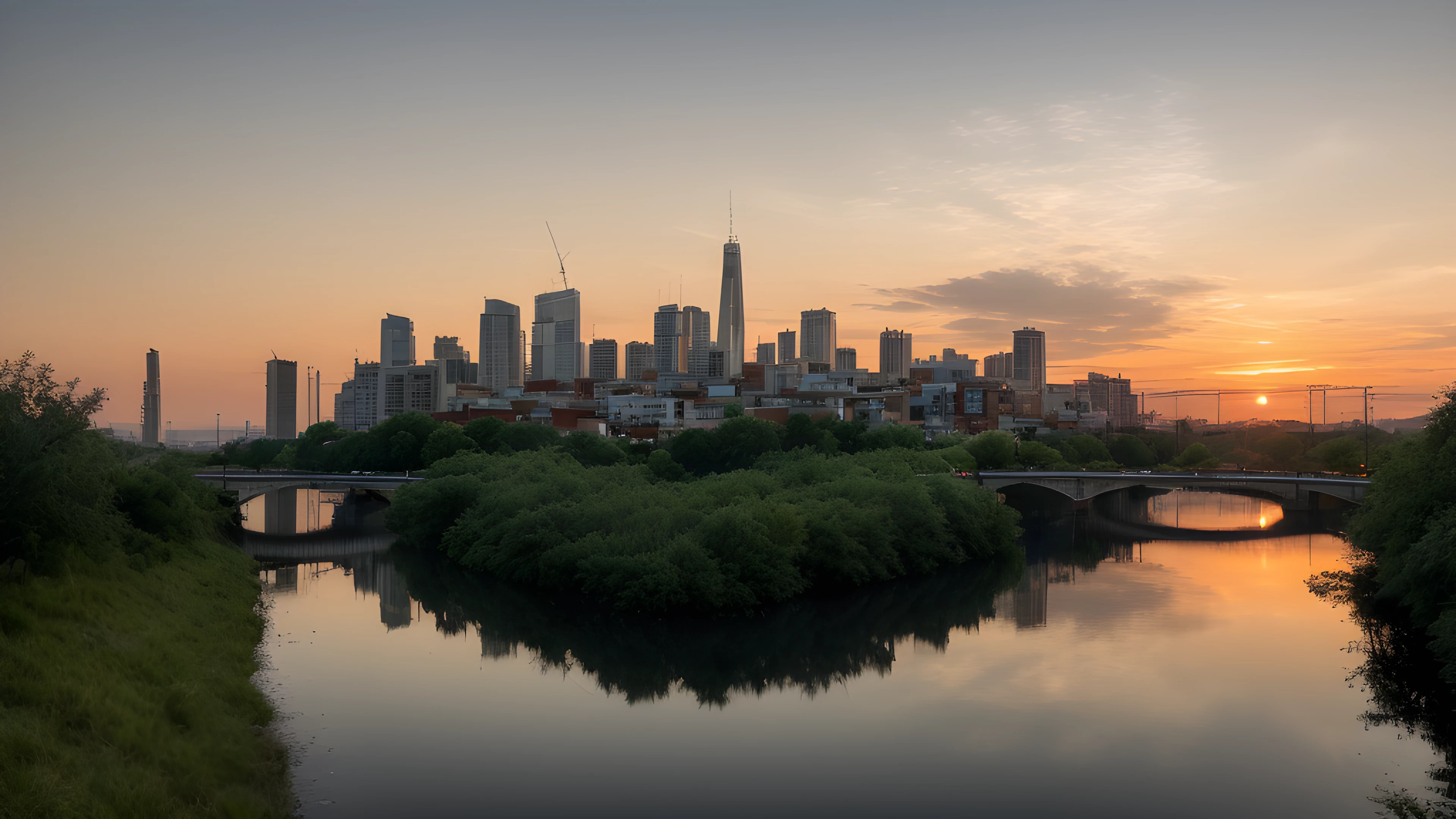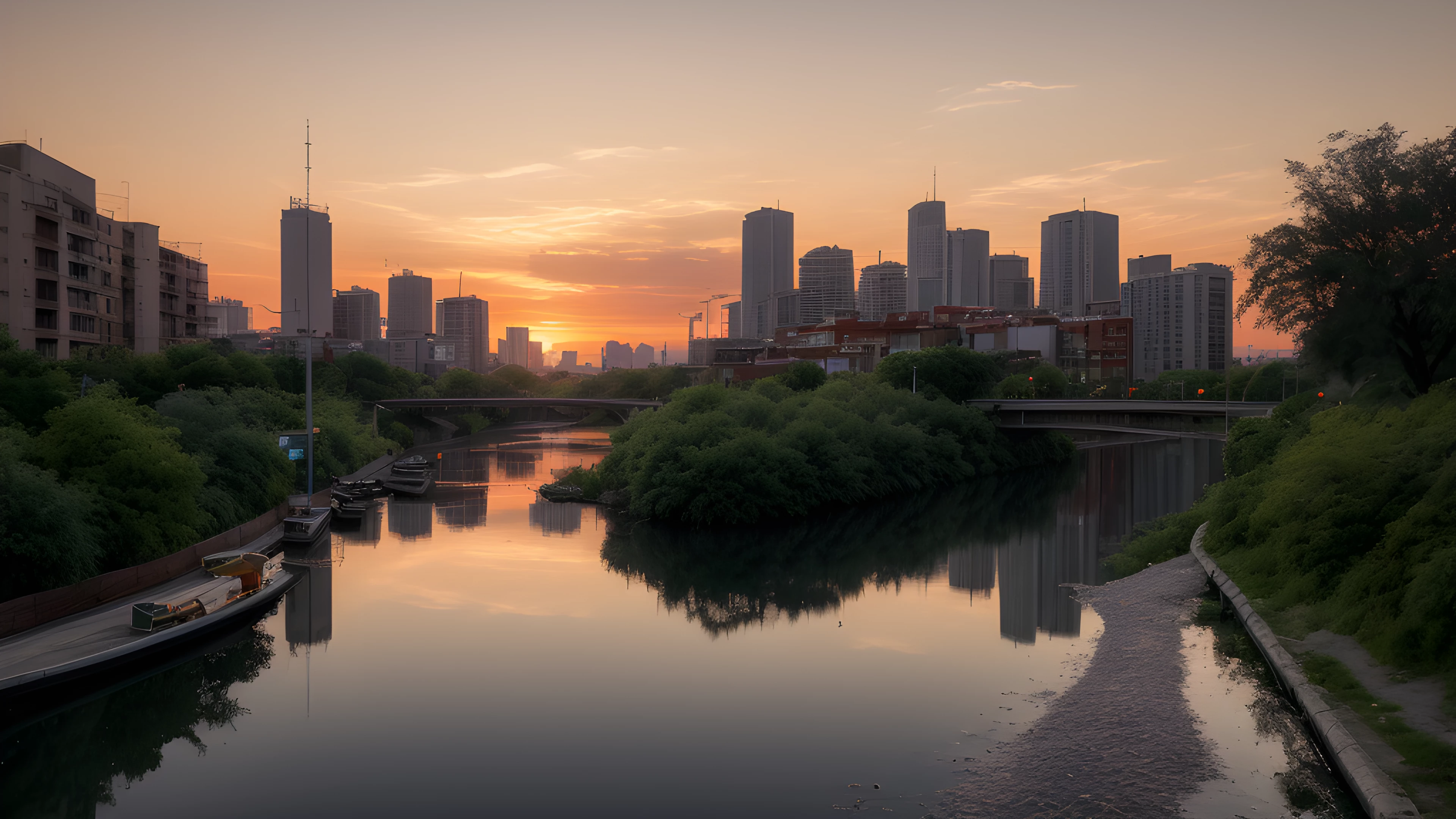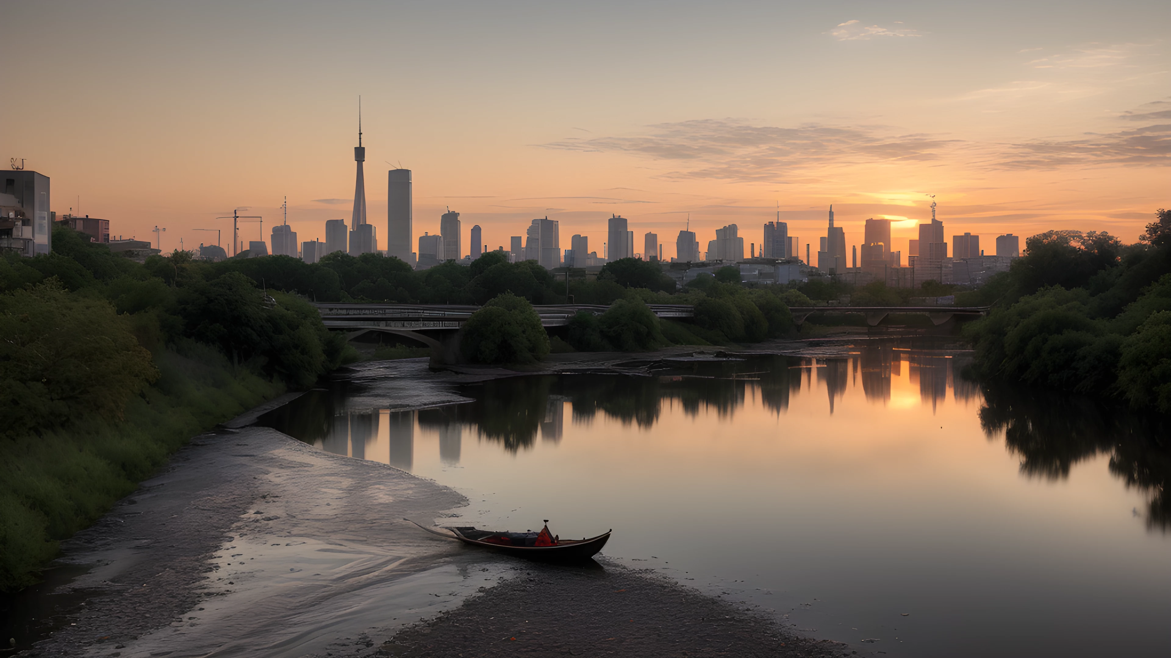 As the sun dips below the horizon, shades of orange cascade through the sky, painting a tranquil backdrop for the bustling cityscape In the distance, a river flows gently, highlighting the contrast between man-made and natural beauty Inspired by Tracey Emin's exploration of the self through art, this scene reflects on our connection to the world around us and our impact on it