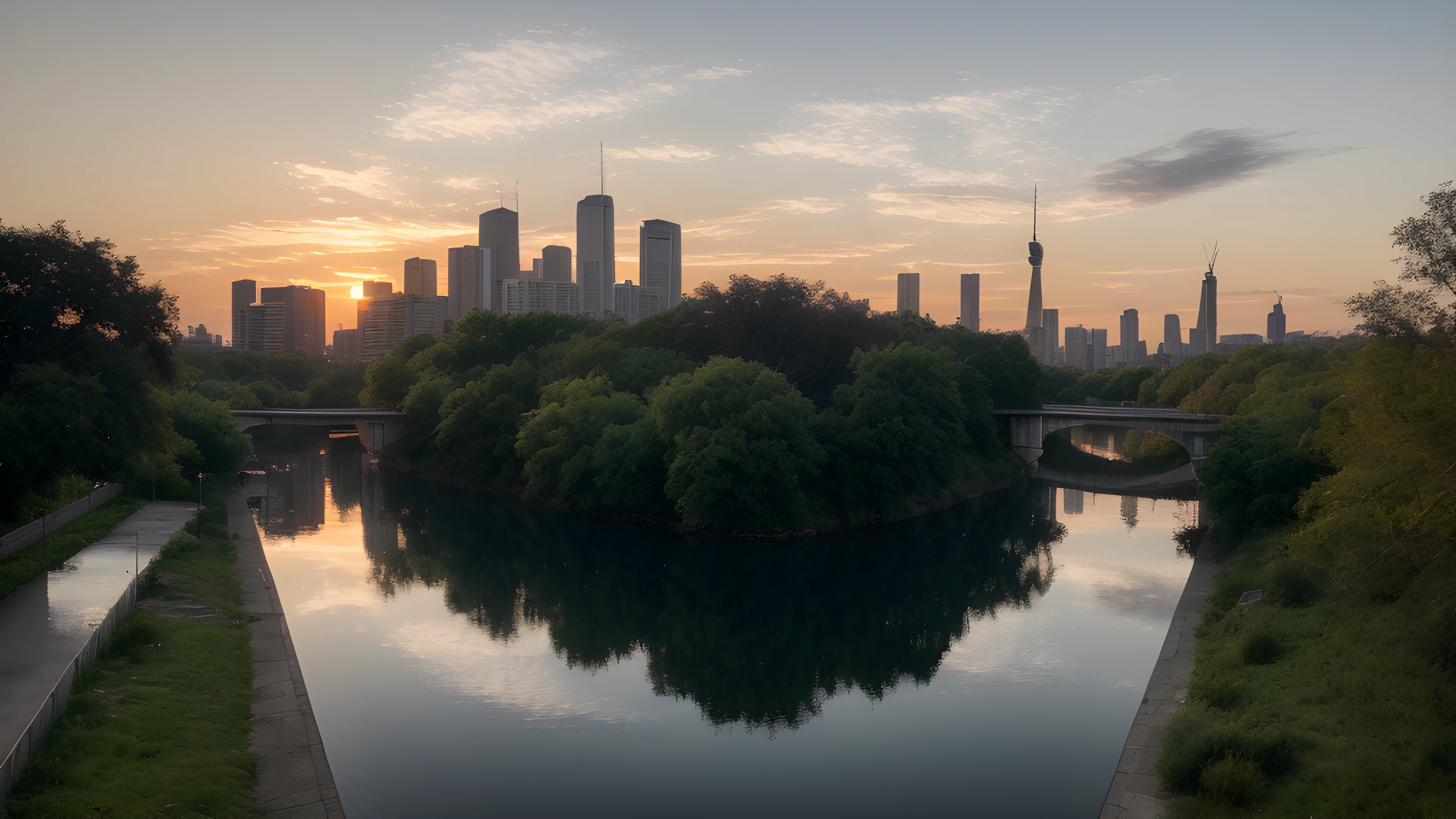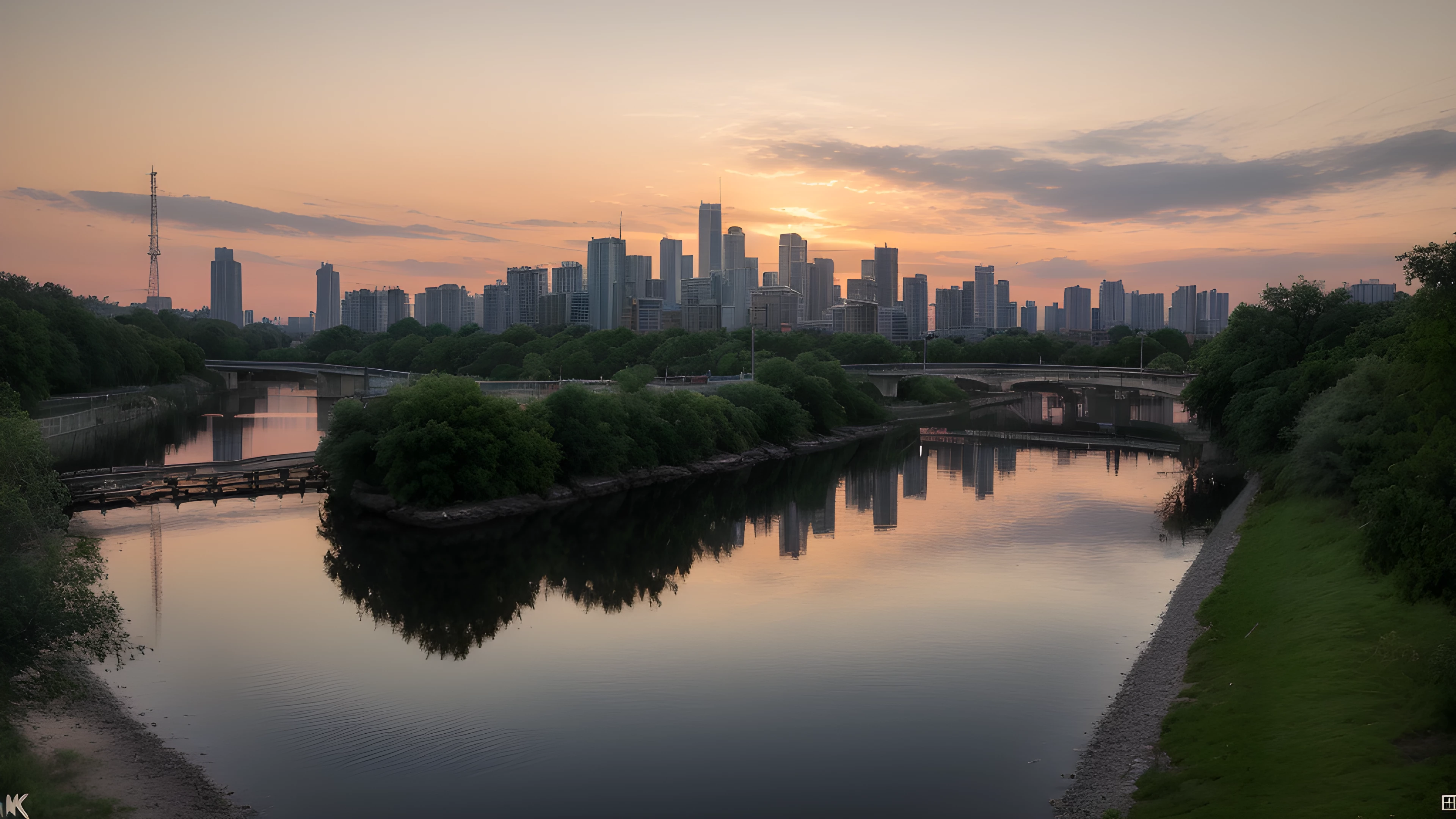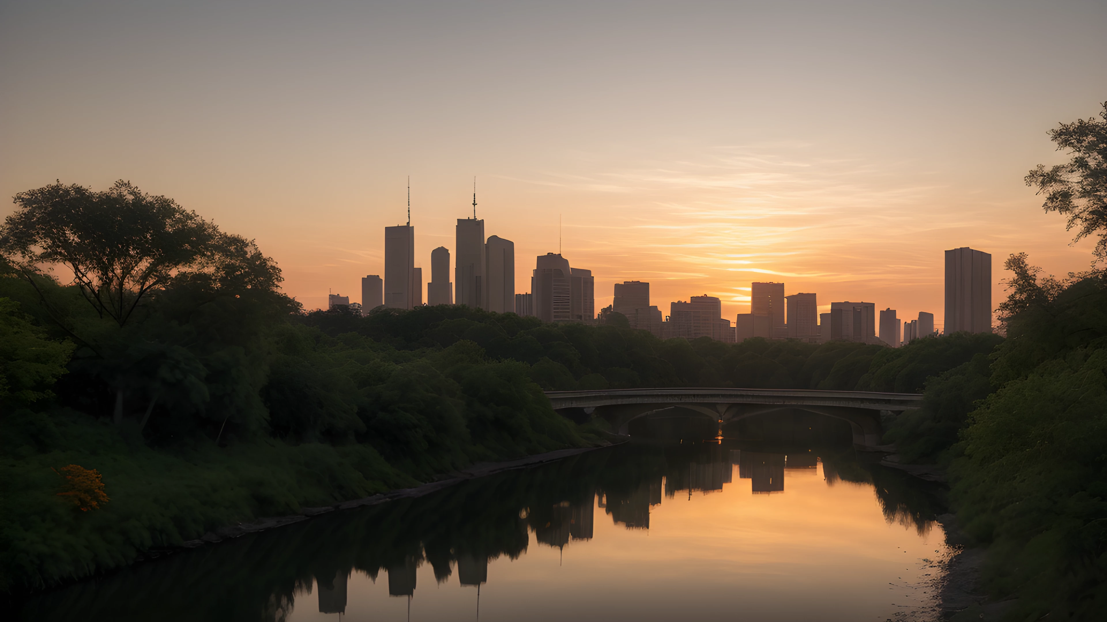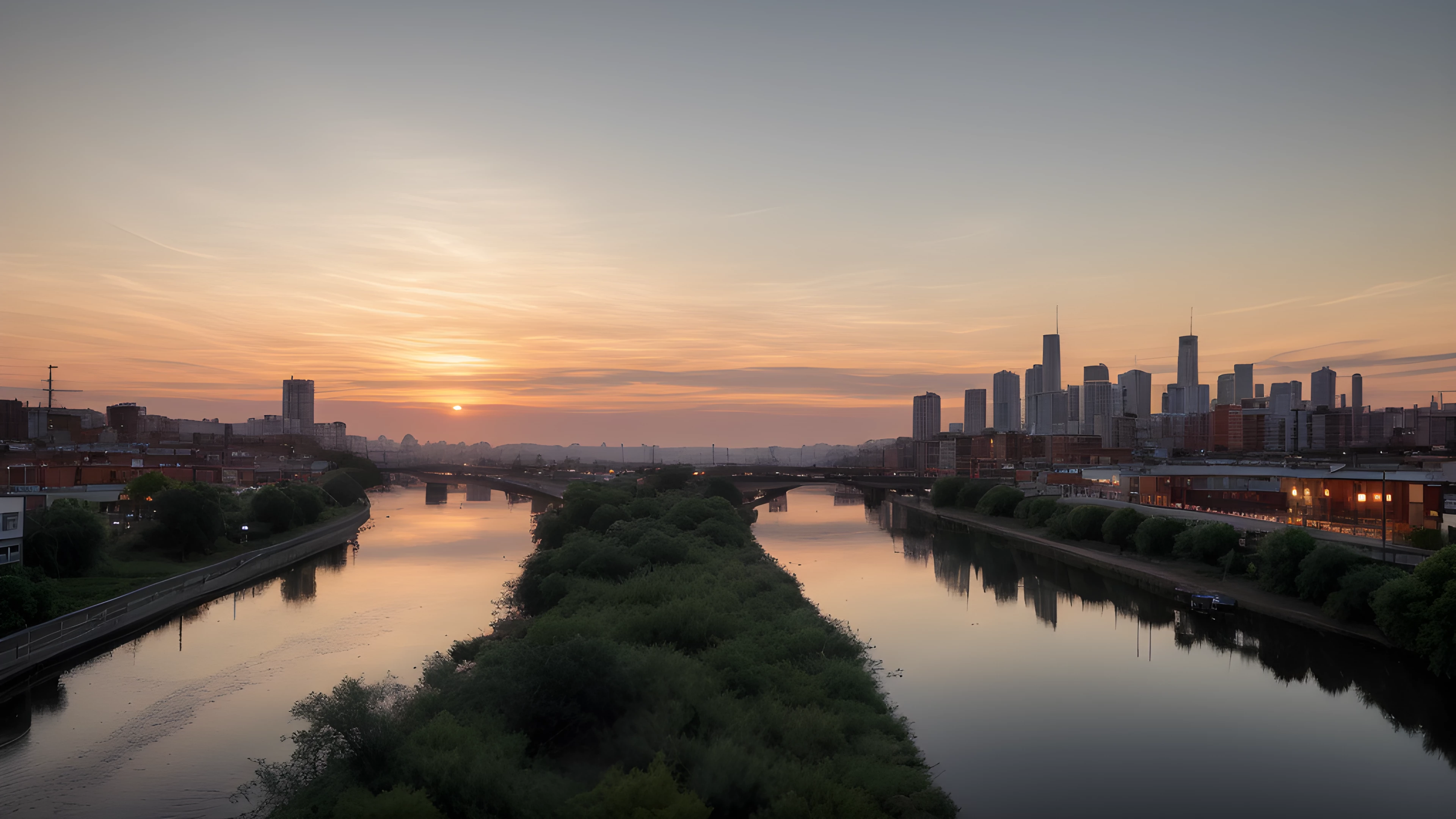 As the sun dips below the horizon, shades of orange cascade through the sky, painting a tranquil backdrop for the bustling cityscape In the distance, a river flows gently, highlighting the contrast between man-made and natural beauty Inspired by Tracey Emin's exploration of the self through art, this scene reflects on our connection to the world around us and our impact on it