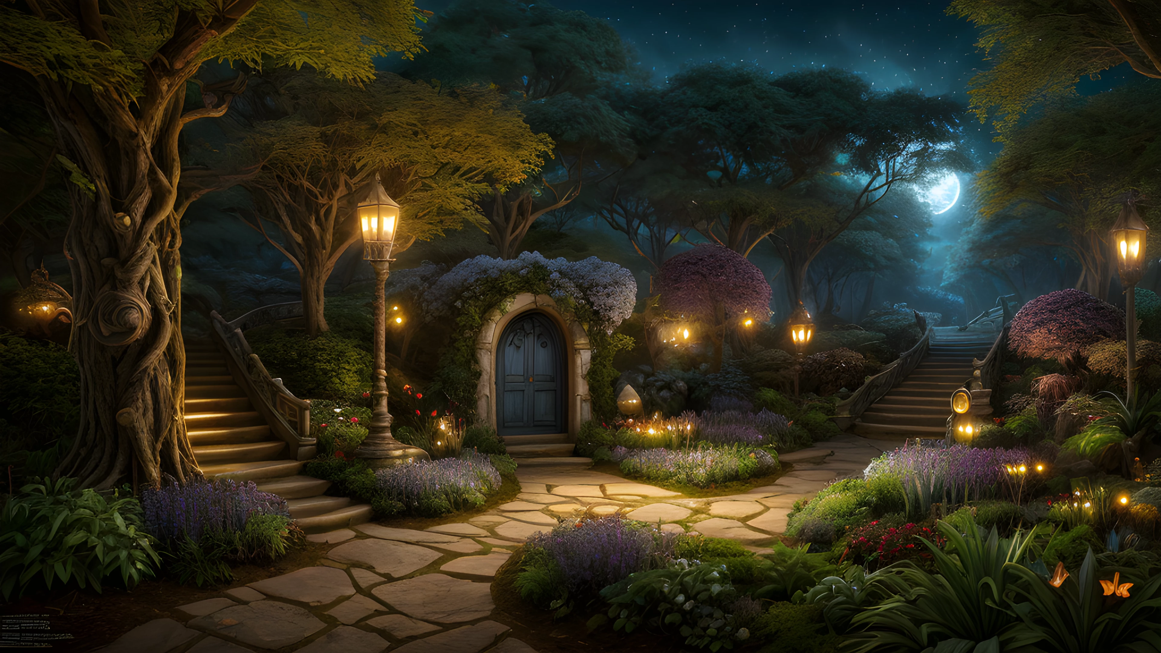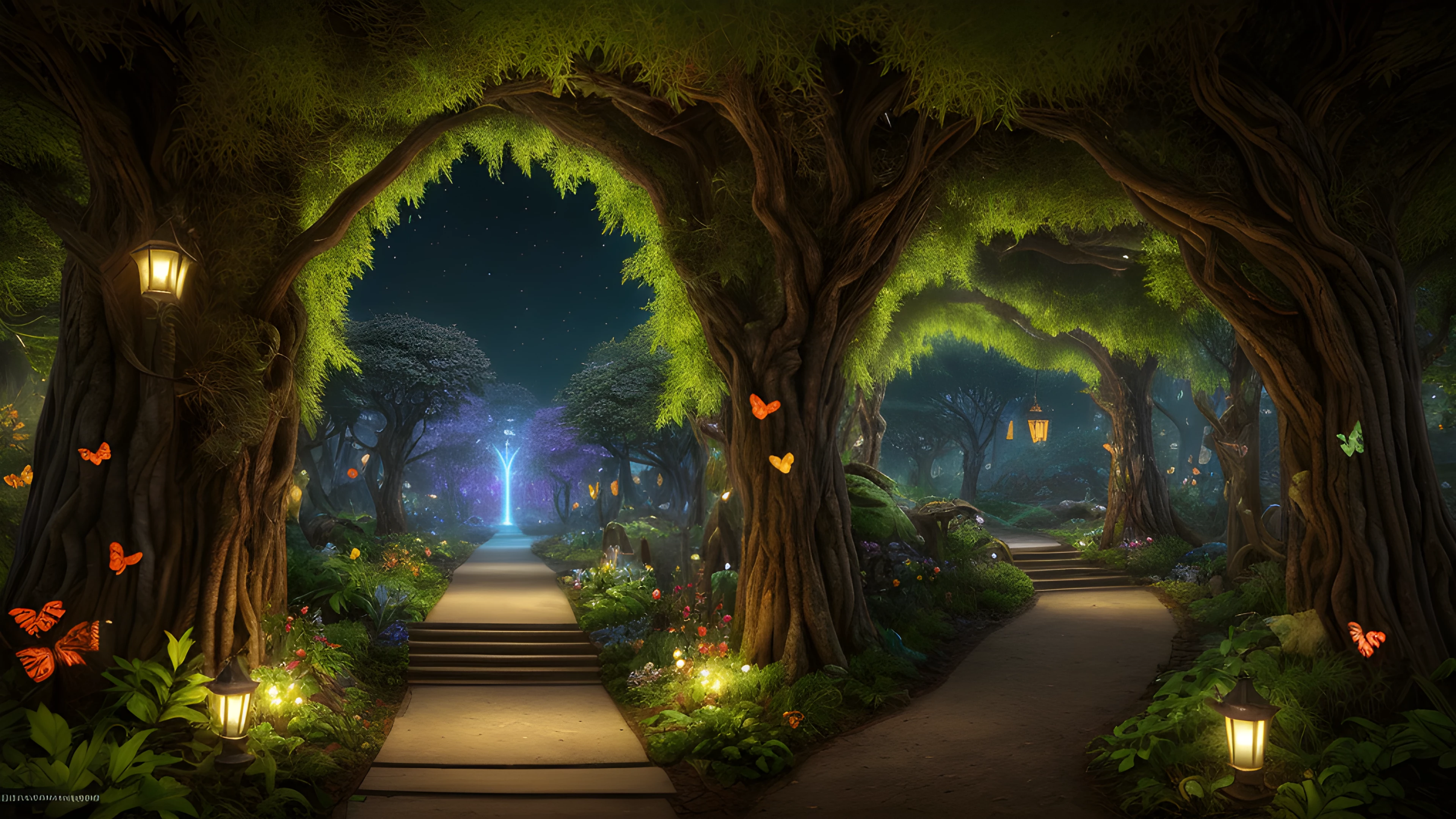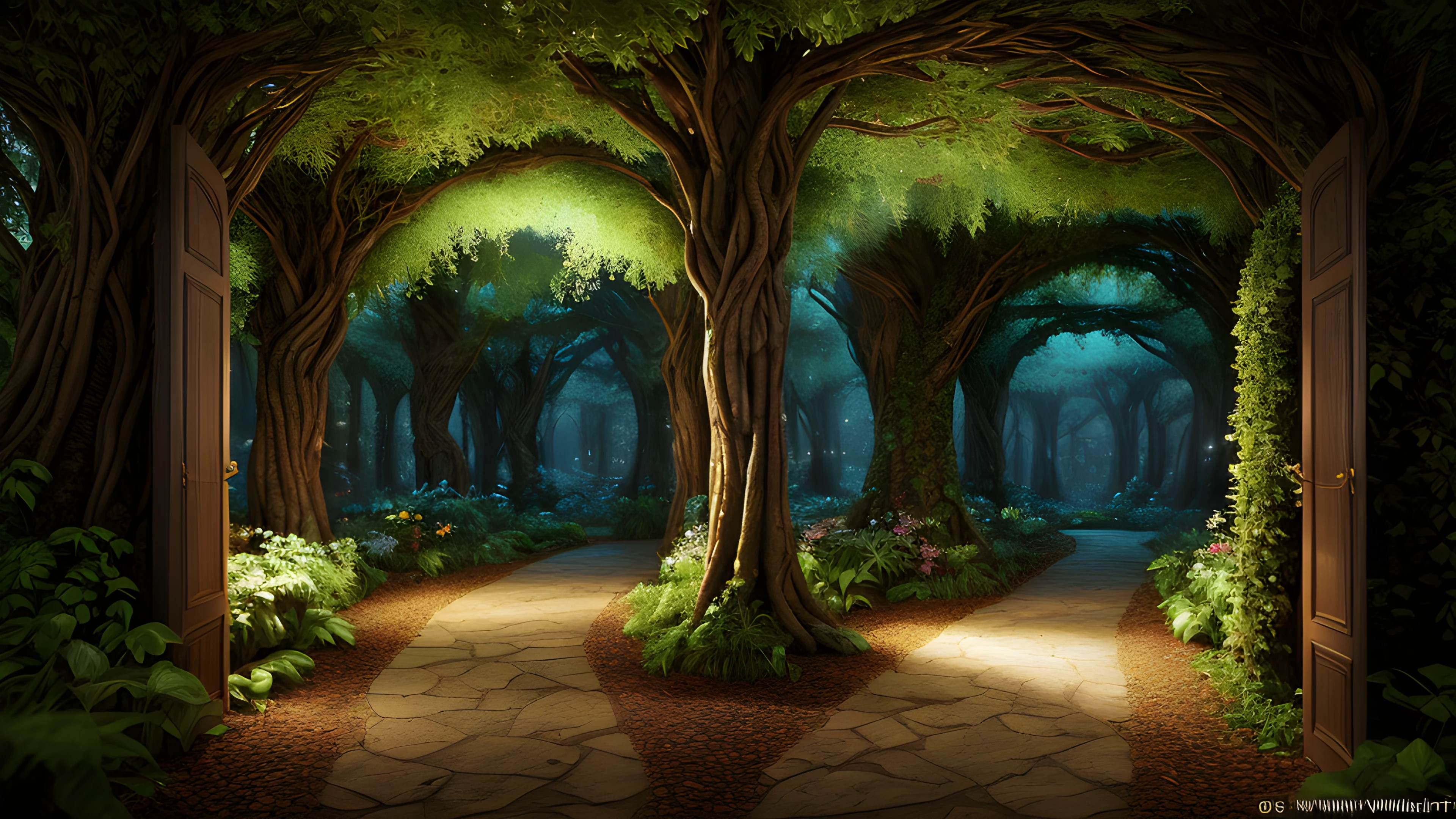 Step into an enchanting world where flora and fauna come alive As night descends, the leaves transform into luminescent butterflies, swirling among the whimsical doorwaysof the magical forest