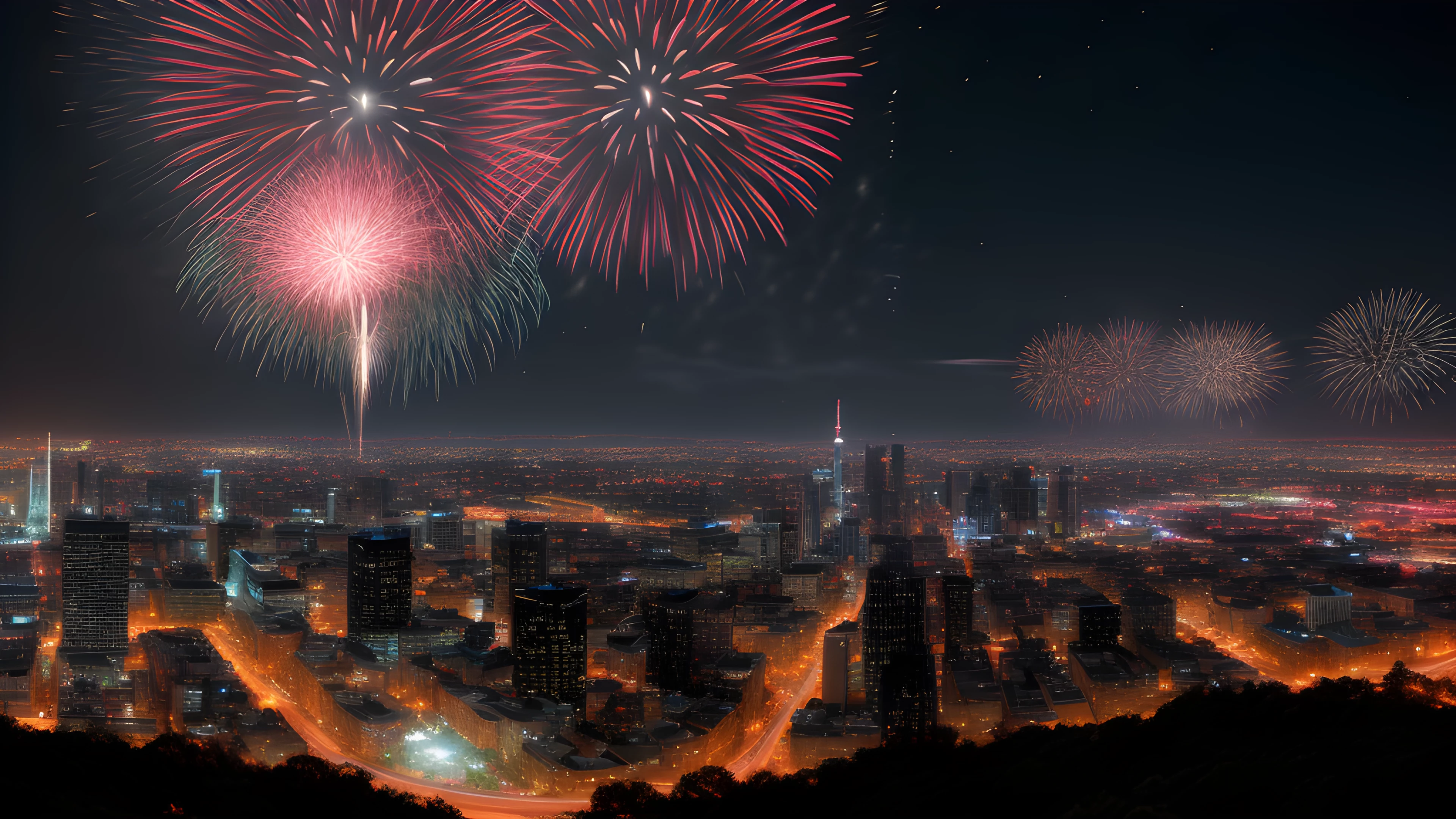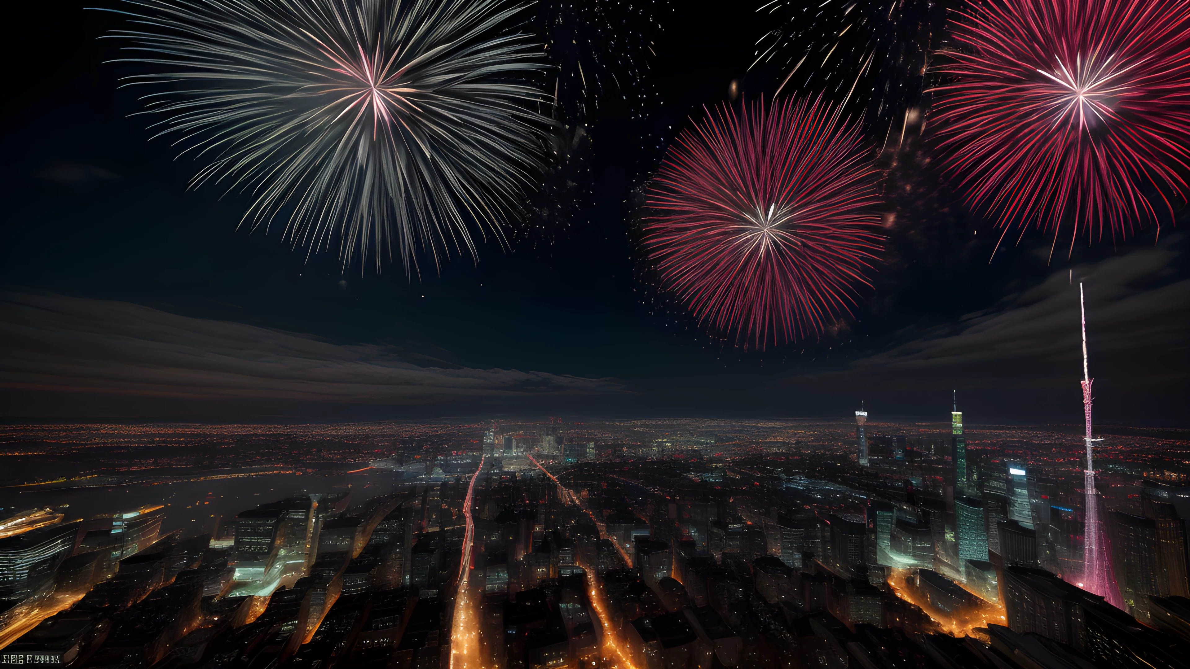 Hyperrealistic Fireworks at the City Skyline, Ding Yi, the renowned artist, presents a stunning rendition of bursting fireworks, proudly illuminating the dark night at the city skyline With special attention to detail, Yi impressively captures how the dazzling lights of the fireworks mesh harmoniously with the technicolor urbanscape to create hypnotic works of art Equipped with utmost creativity and genius hand skills, this masterpiece beckons a excited voyeurs out of soiree-ending gallery, electrifying, Detriot, lil projector equipment fireworks painting canvas celebration art unforgettable, elaborated detailed 8k, detailed, 4k 8k 16k gigapixel render, highly detailed, 8k, cinematic HDR SSAO RTX