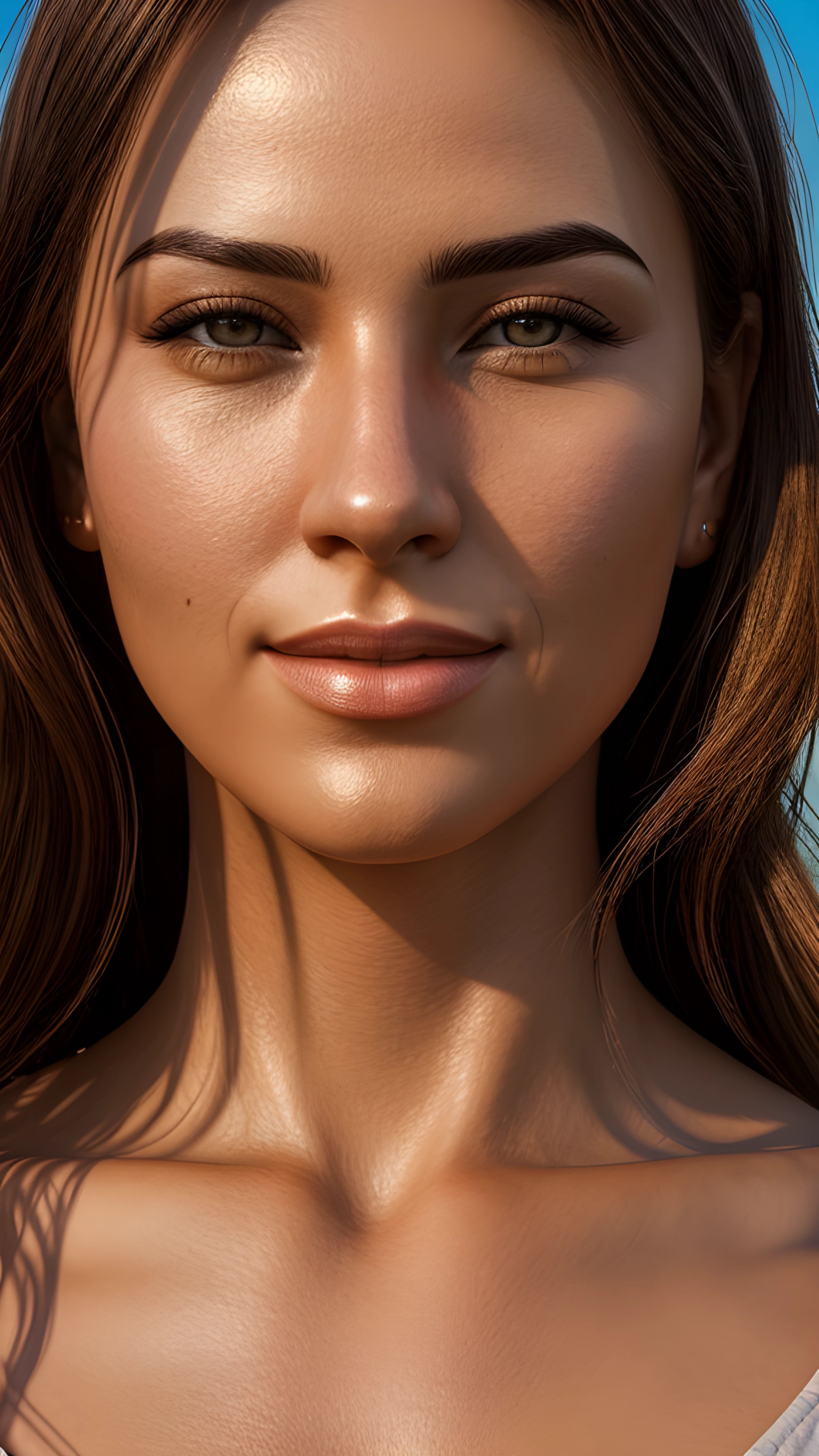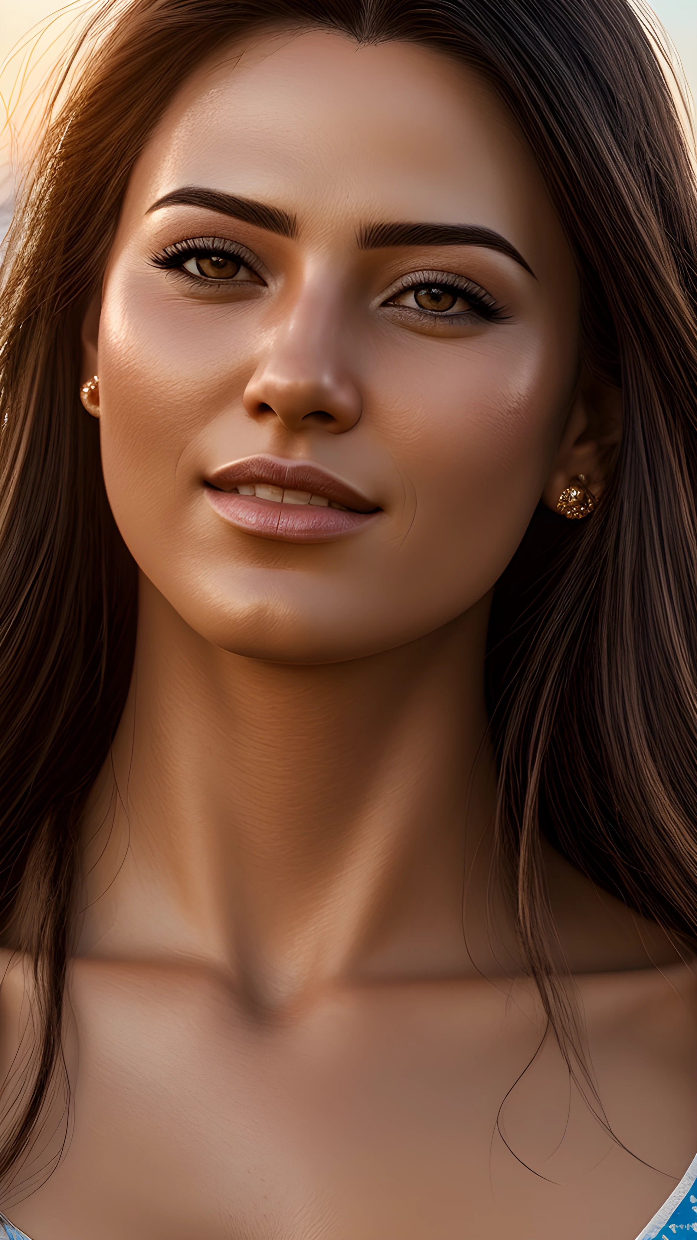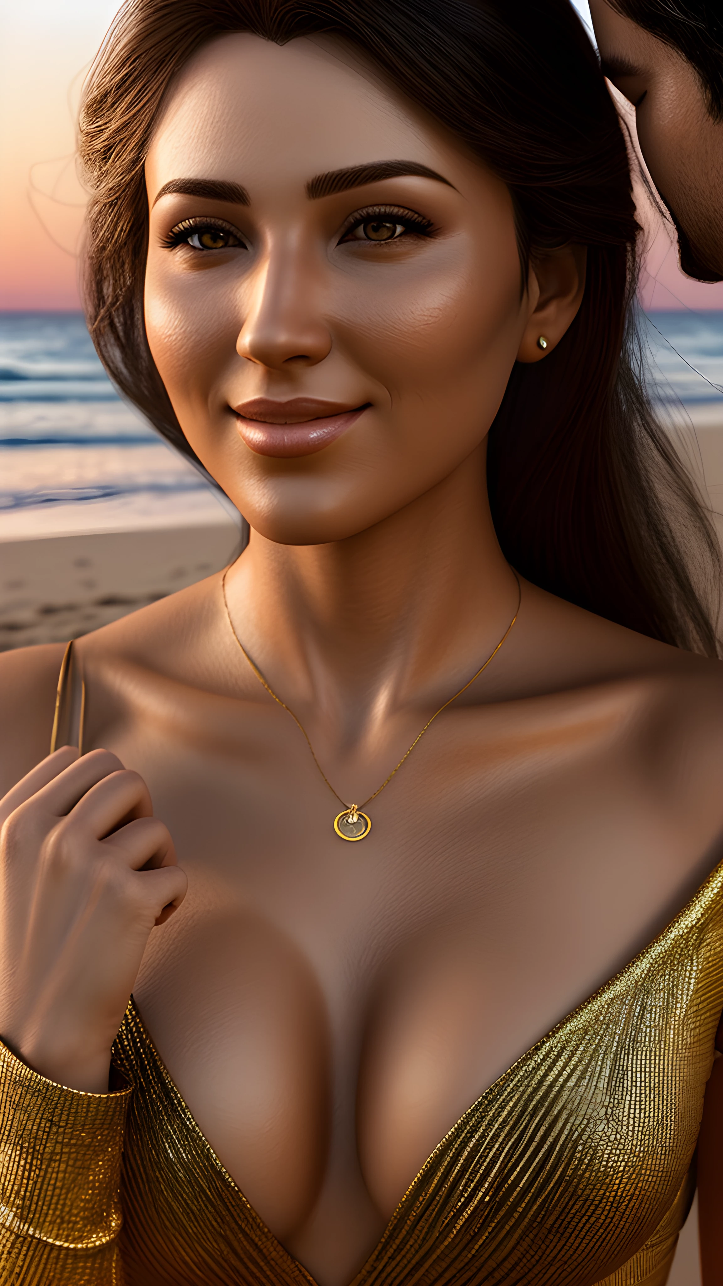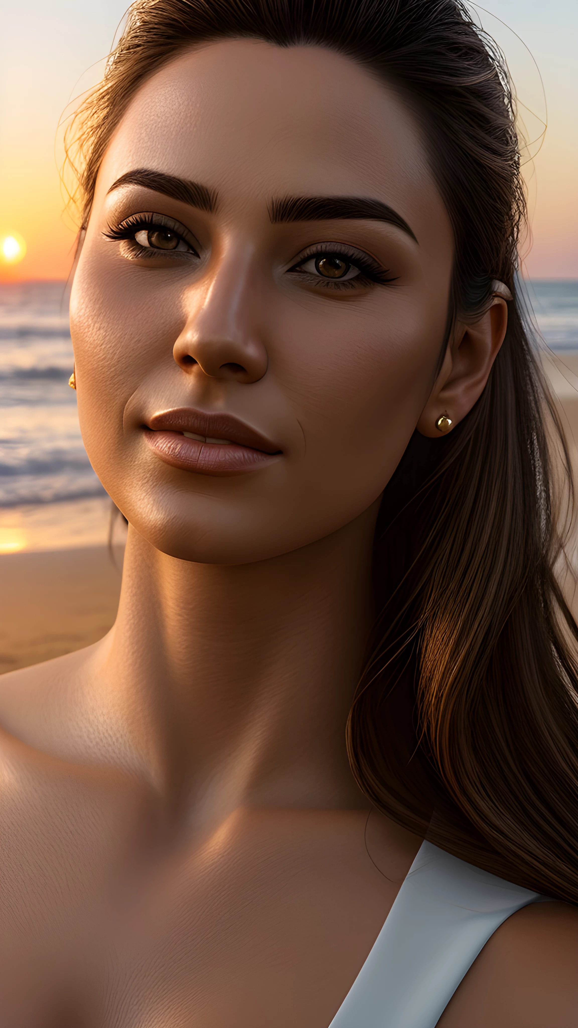A 3d digital portrait render of Beautiful Sunset on the Beach Young Love, As the sun dips below the horizon, a young couple stands on the beach, their faces illuminated by golden light The gentle waves crash against their feet, the sky painted in vivid colors This moment, forever etched in their memory, will be treasured for a lifetime, Beach, Sunset, Young Couple, Forever, Lifelong Memories, Liudmila Manzenko, (render 3d:1.5), digital art, digital render, digital rendering, (detailed face:1.5), (detailed clothes:1.4), (extremely detailed eyes and face), foreground, detailed face, perfect mouth, 3d photography, highly detailed, sharp focus, stunningly beautiful, high quality photography, high detailed skin, (full body:1.5), (only one person:1.1), (close up camera:1.5), fantasy character, detailed 3d render, uhd, 8k, overdetailed art, concept art, full body shot, photorealistic, (character centered in the image:1.4), ultra high detail, ultra realistic